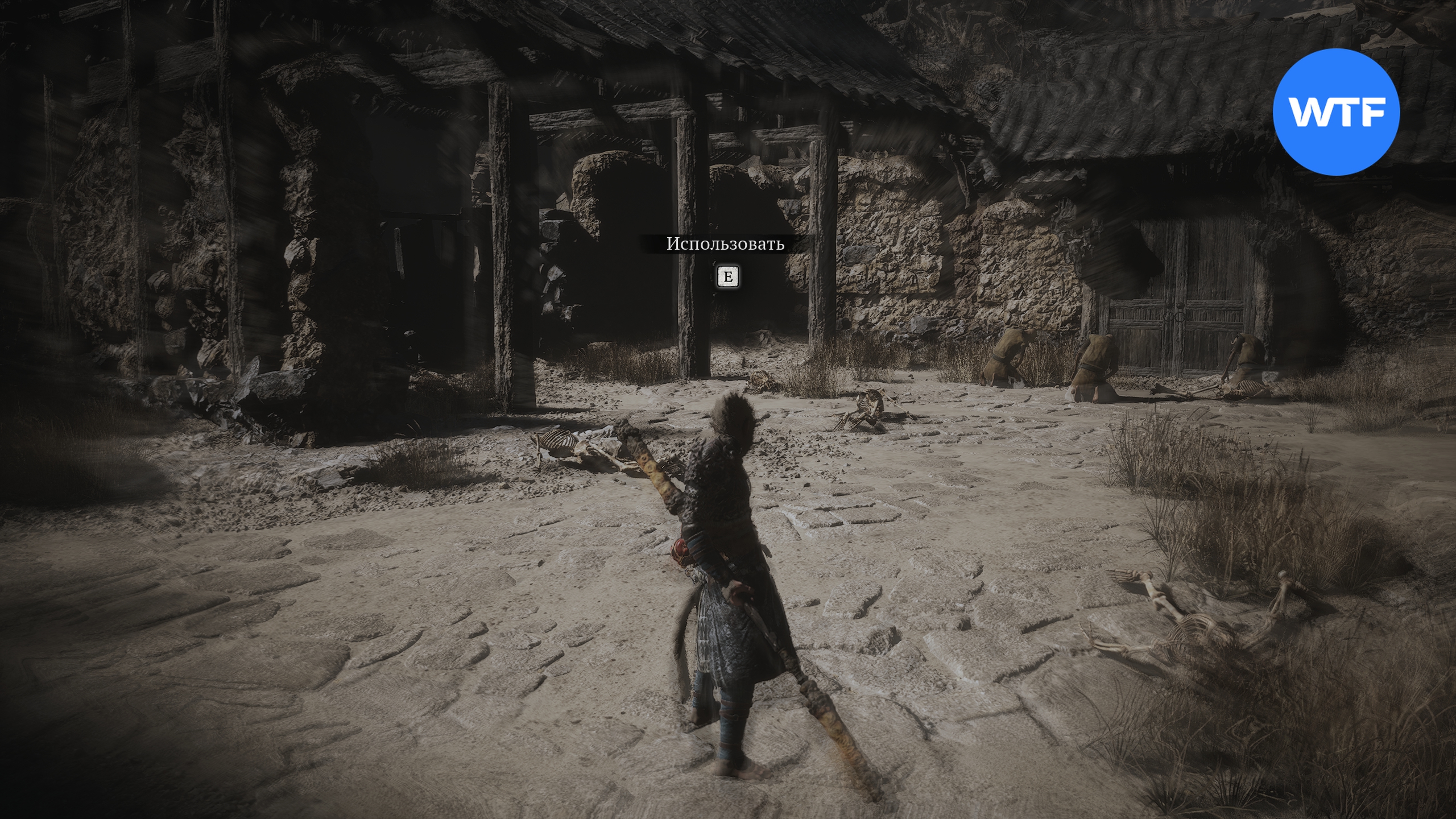 Затем спуститесь вниз по каменным ступенькам и пройдите через деревянный дом справа от вас. Когда экран окрасится в серый цвет, вы сможете использовать старую погремушку.