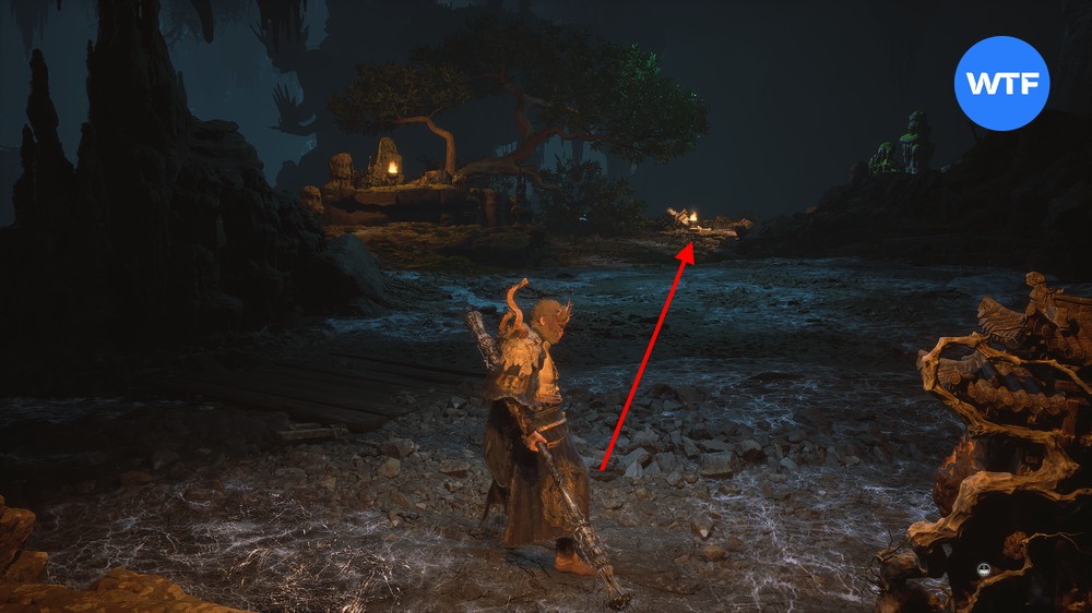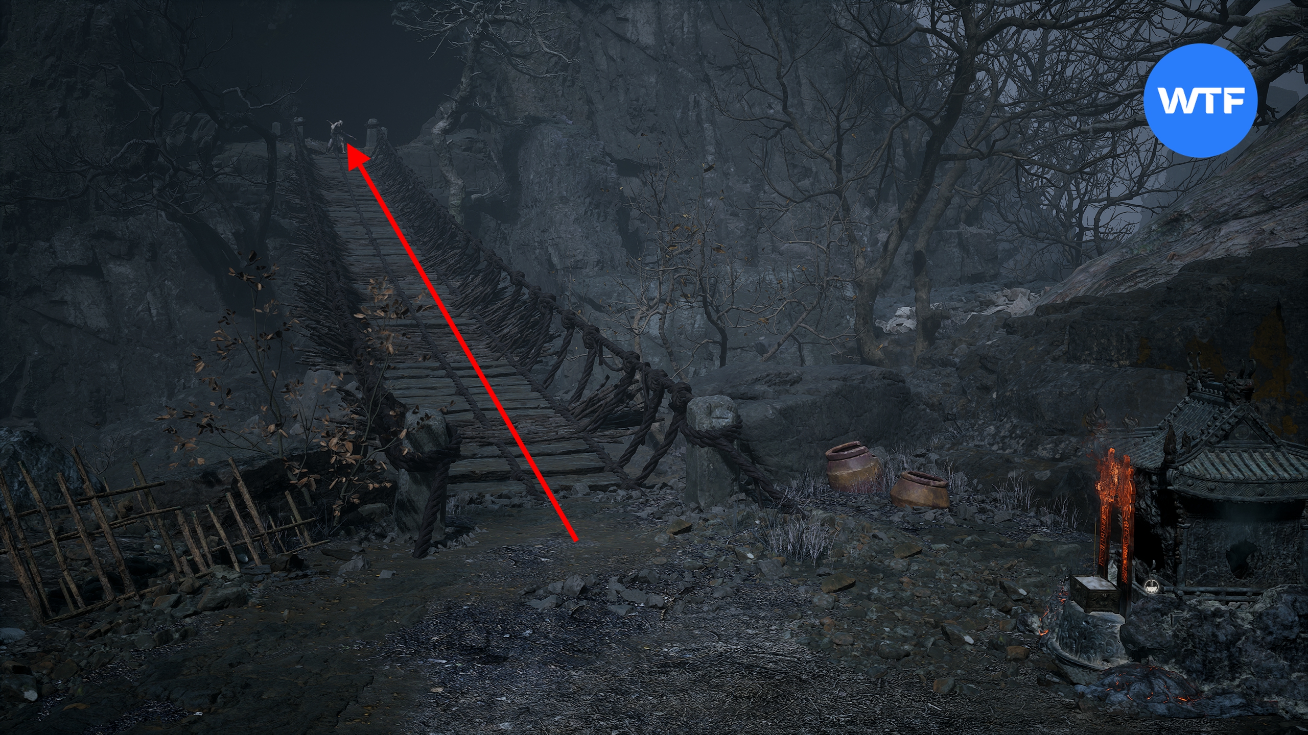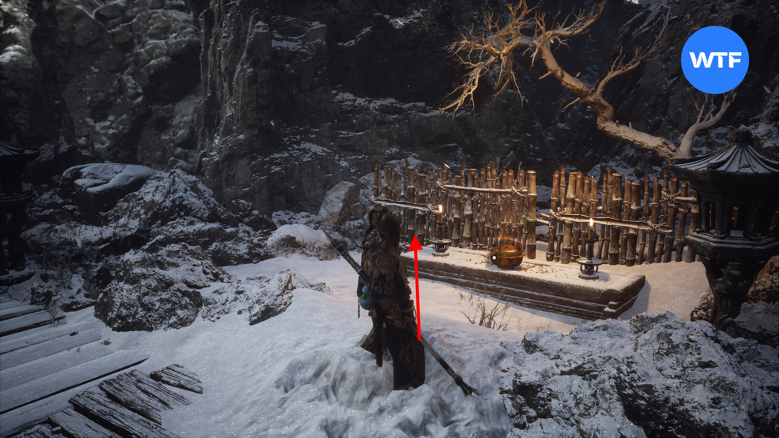 Станьте лицом к алтарю «Бамбуковая роща [Топи Белого Тумана]» и от него идите по тропинке налево. Спуститесь вниз по деревянным помостам к арене, где вы сражались с Сюцаем в белых одежах.