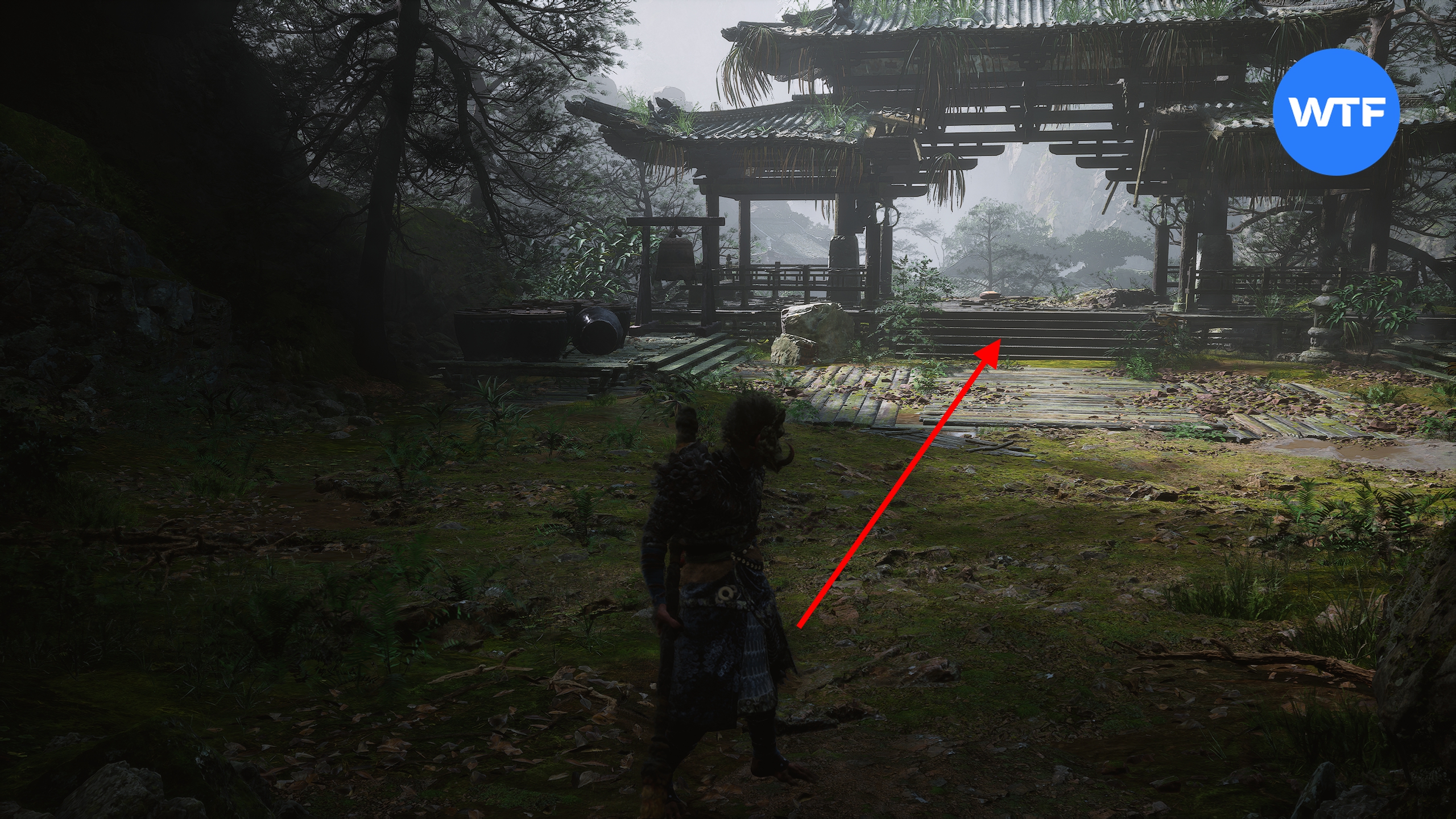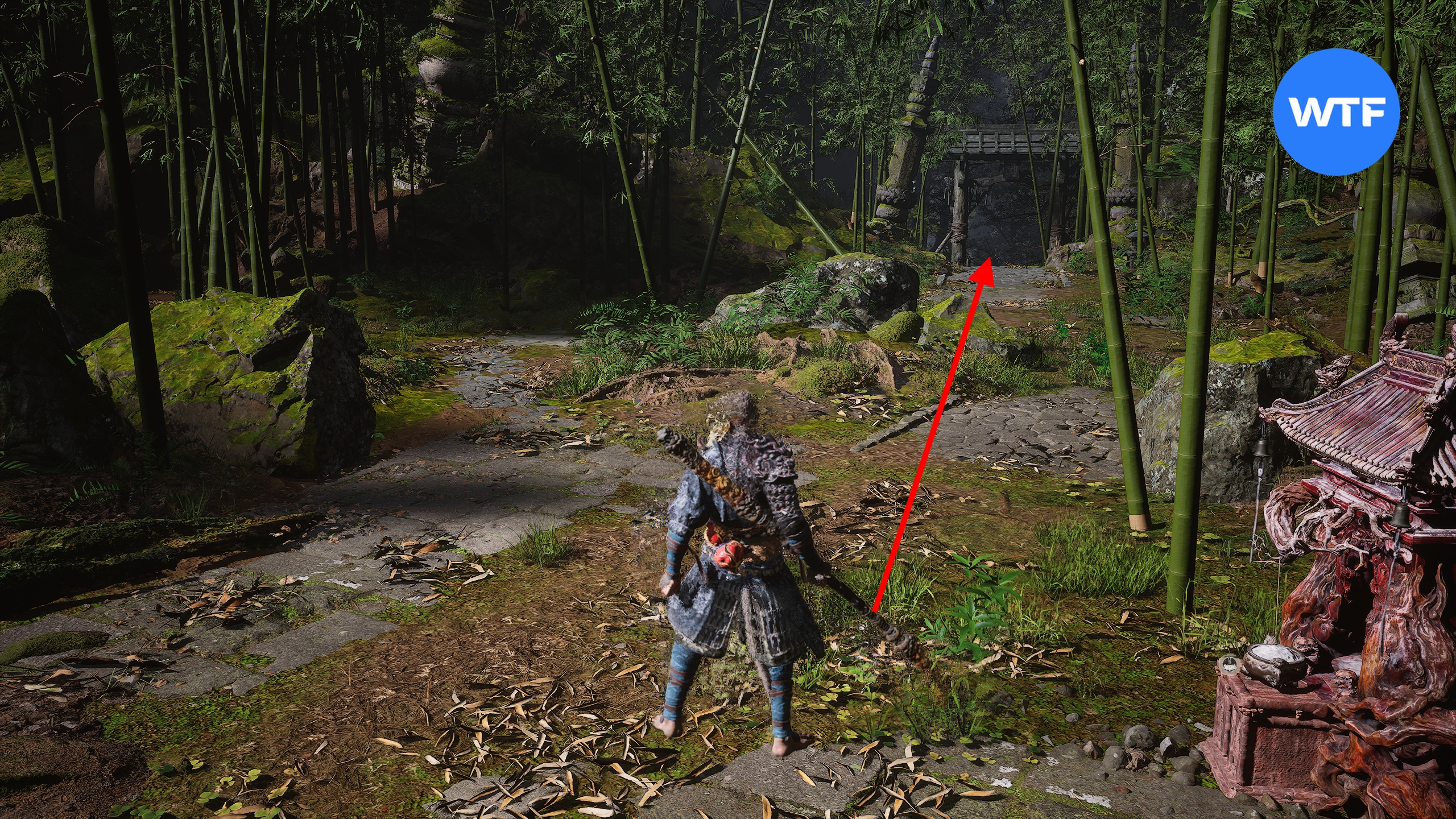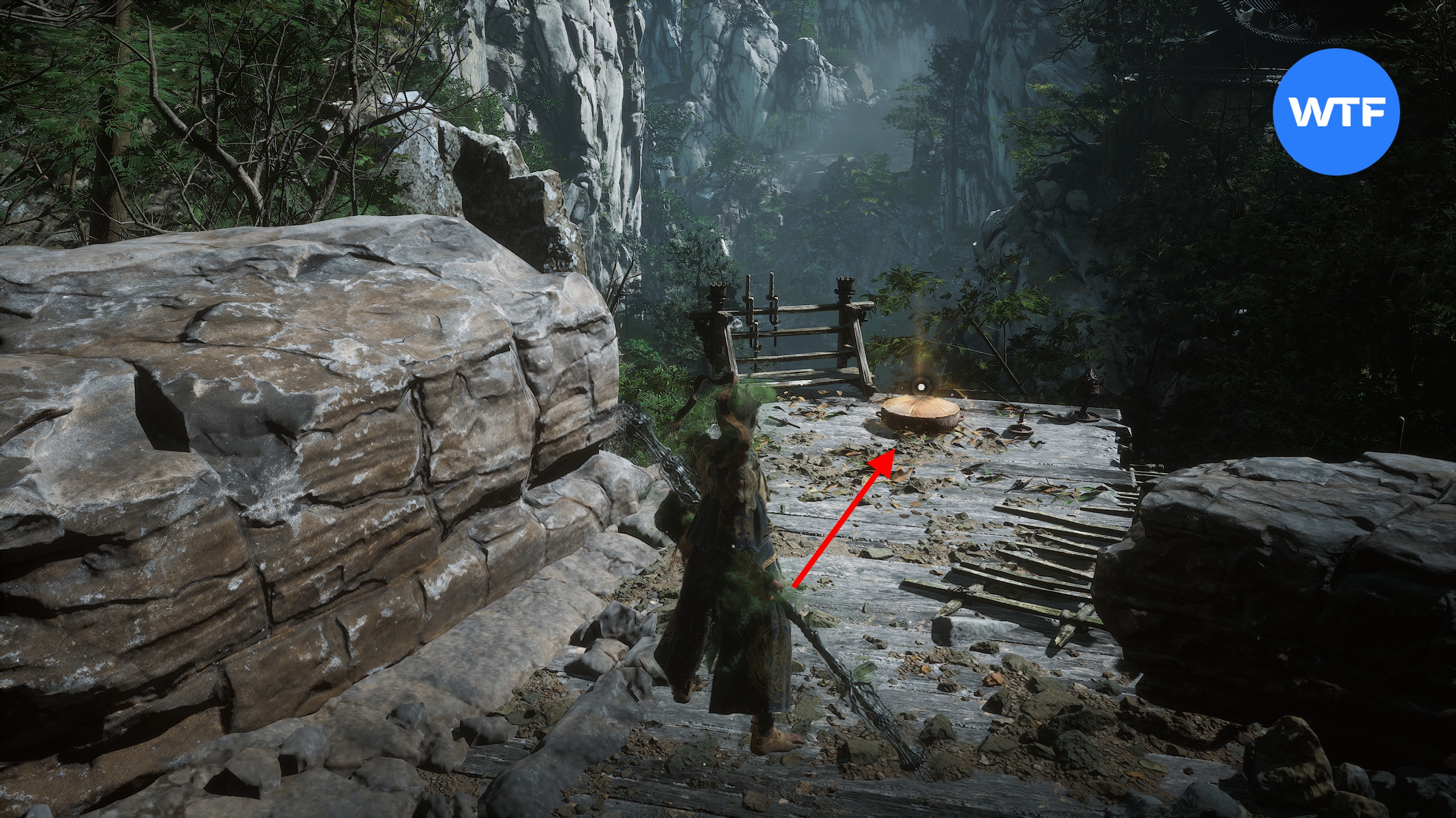 Станьте лицом к алтарю «Бамбуковая роща [Топи Белого Тумана]» и от него идите по тропинке налево. Спуститесь вниз по деревянным помостам к арене, где вы сражались с Сюцаем в белых одежах.