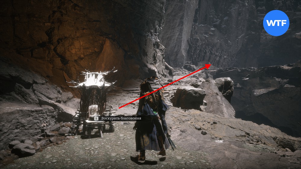 Станьте спиной к алтарю «Паутиновая яма [Середина ямы]» и бегите строго вперед, ориентируясь на свет факела. Вы найдете эту площадку для медитации на краю обрыва.