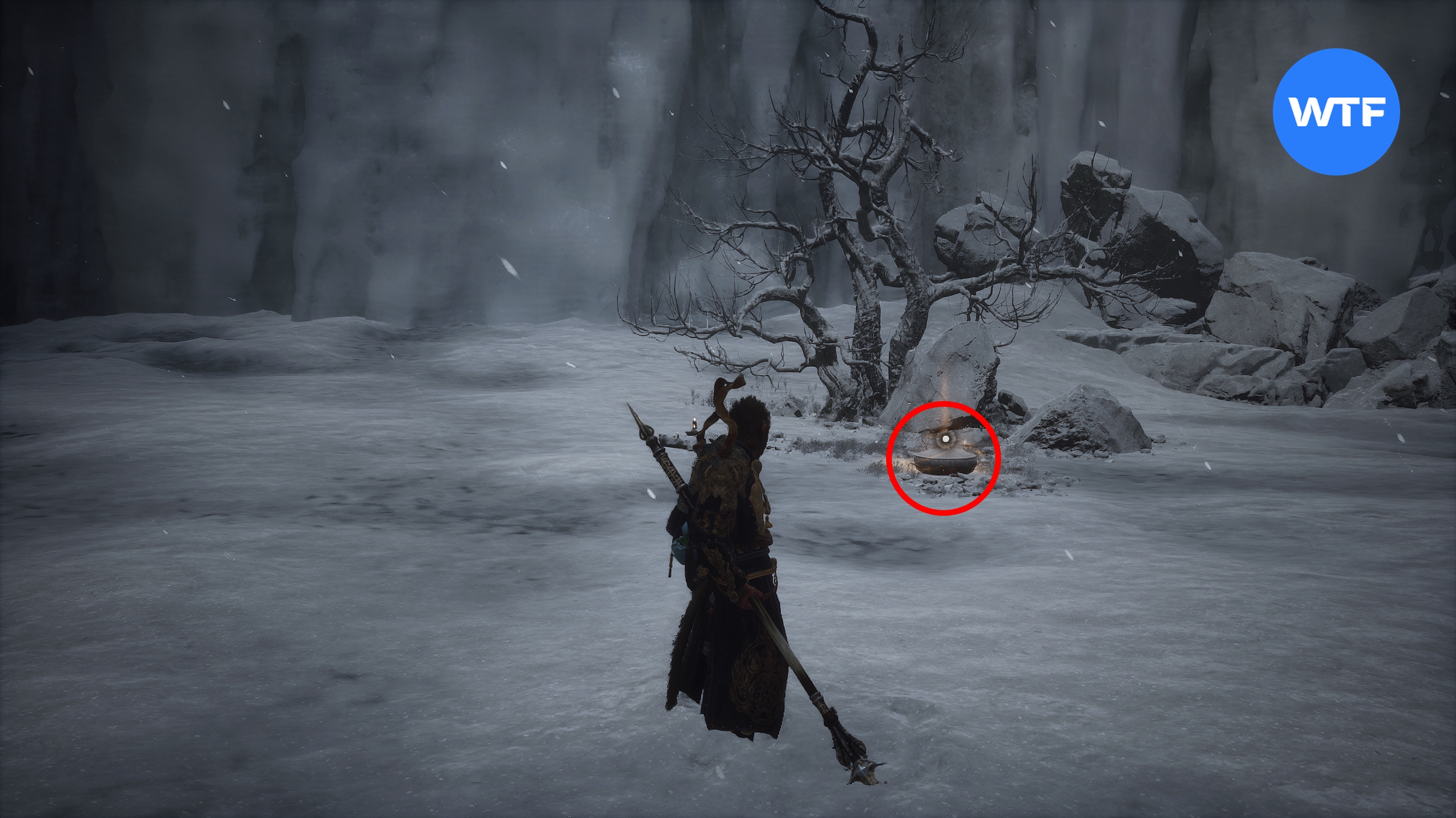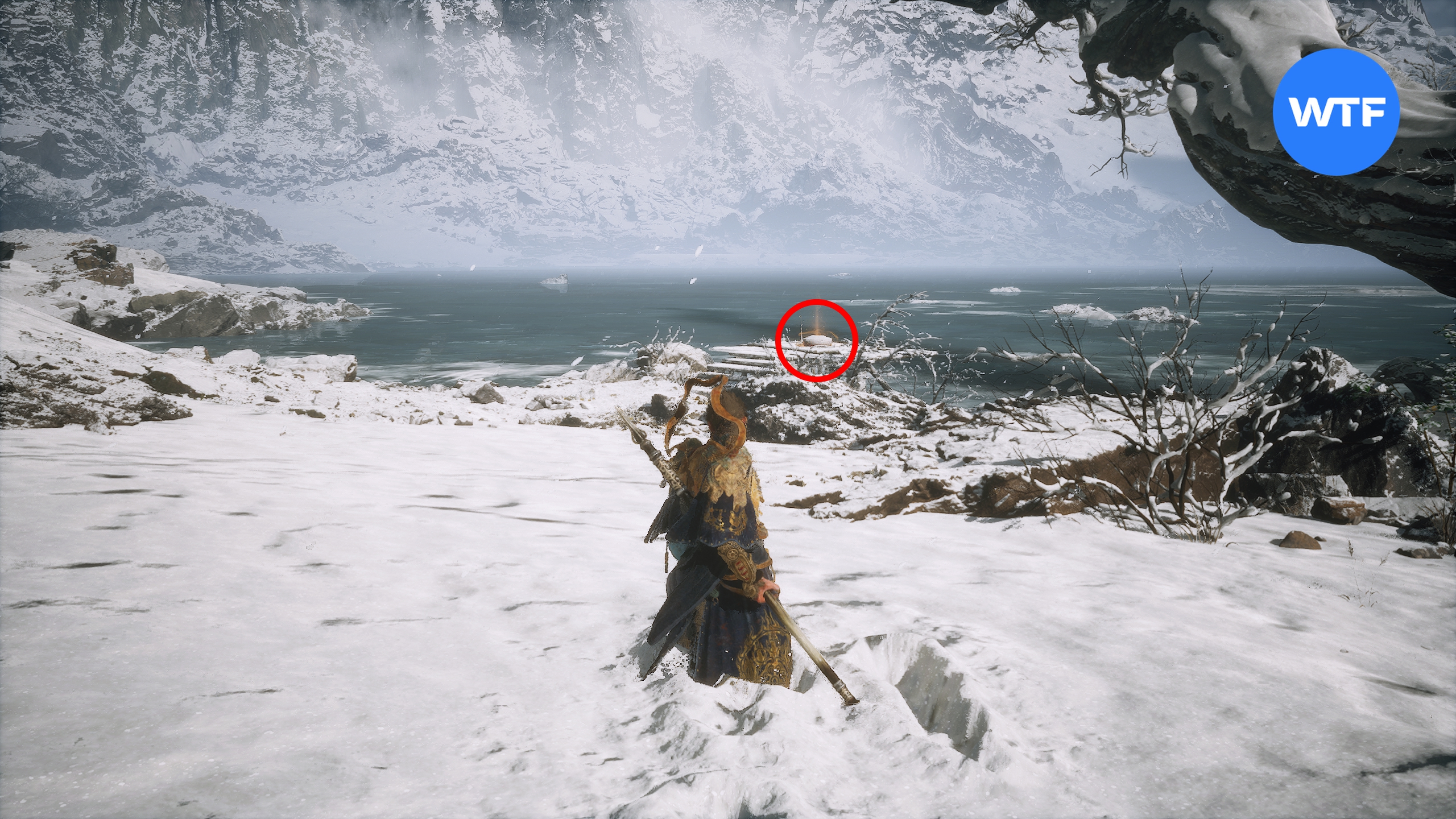 Пройдите по этой тропинке до конца, чтобы добраться до площадки с местом для медитации, спрятанной между замерзших скал. Чтобы ей воспользоваться, придется сразиться со слабой версией Морского монаха.