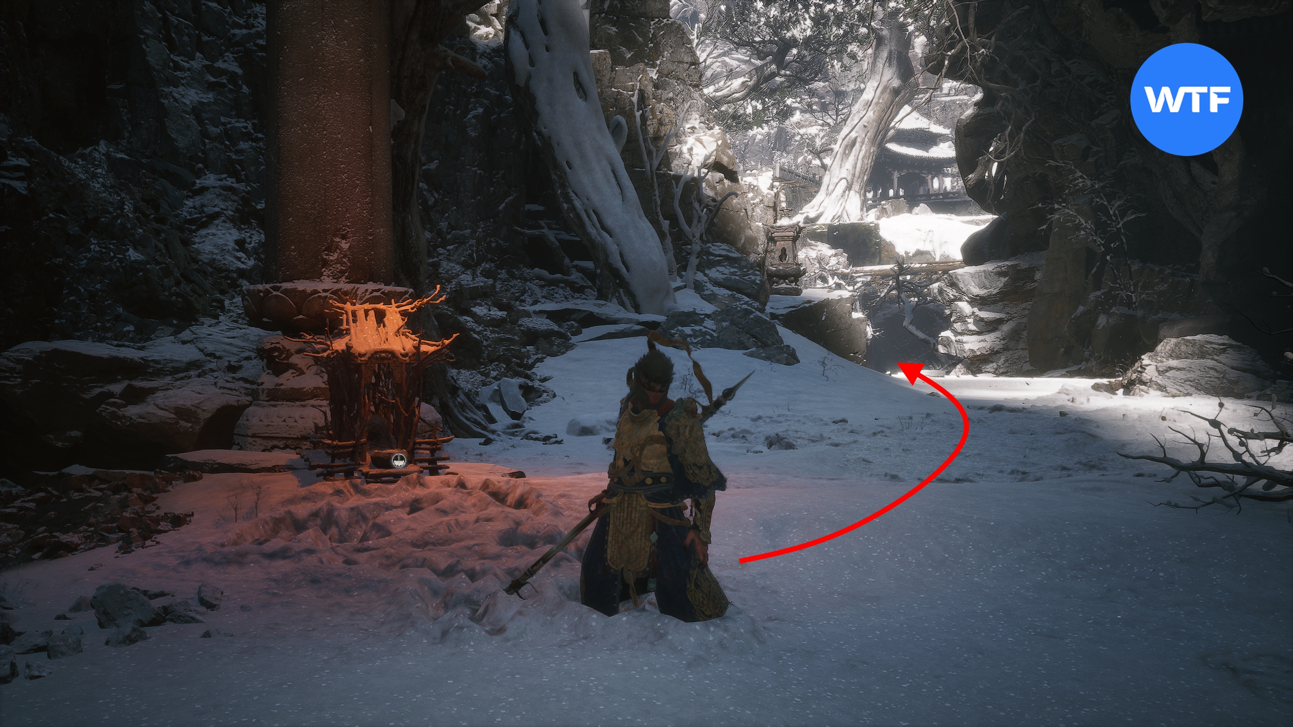 Станьте лицом к алтарю «Мир пагод [Колесо снаружи]» и от него бегите наверх по каменной лестнице справа. Затем после пруда с кувшинками снова поверните направо и бегите вперед по заснеженной тропе.
