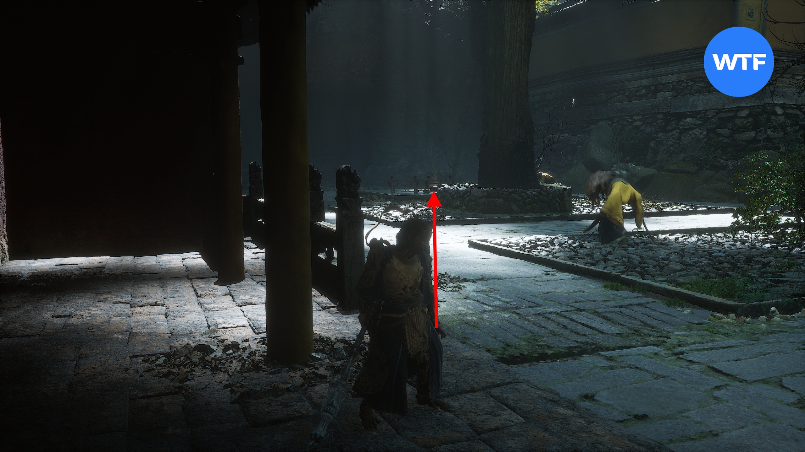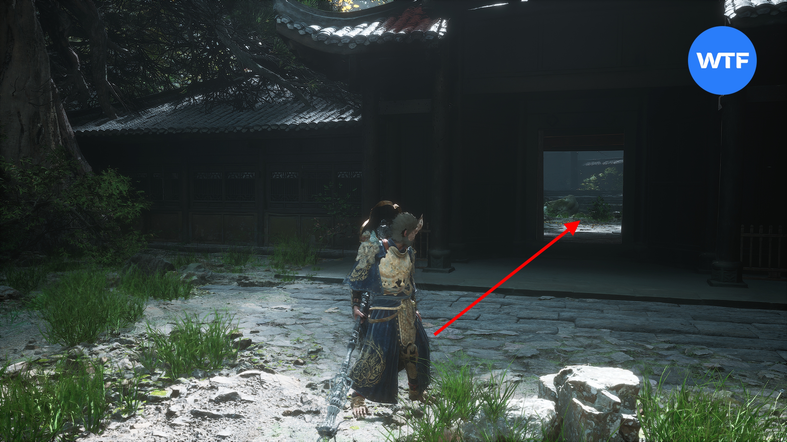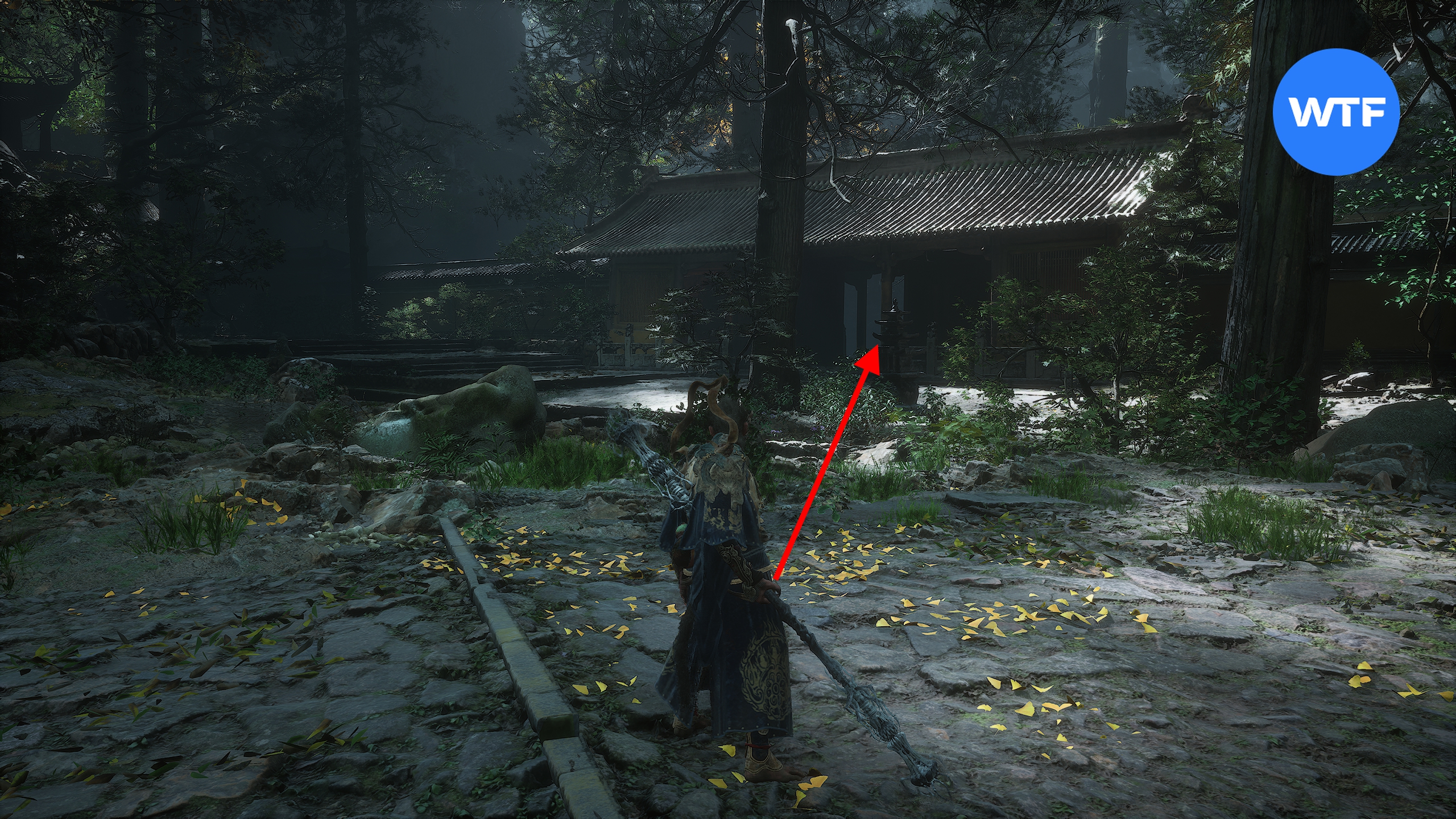 Добравшись до алтаря «Храм Крадущегося Тигра [Погреб]», станьте к нему лицом и идите по дороге слева. Затем поверните направо и бегите вперед до упора, пока не увидите место медитации возле Мудрого наставника.