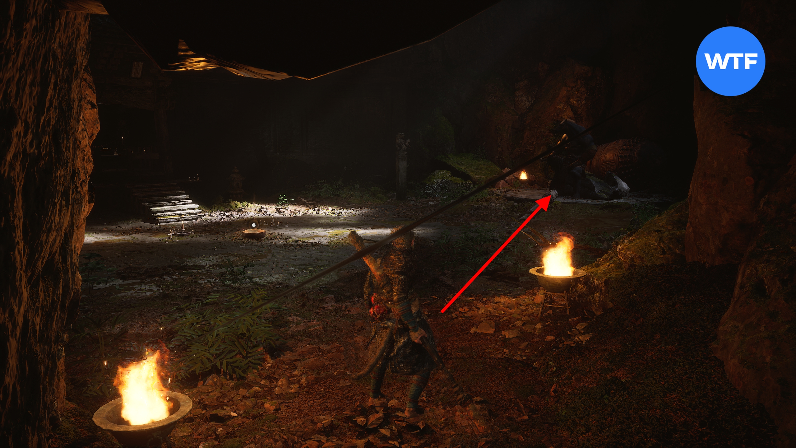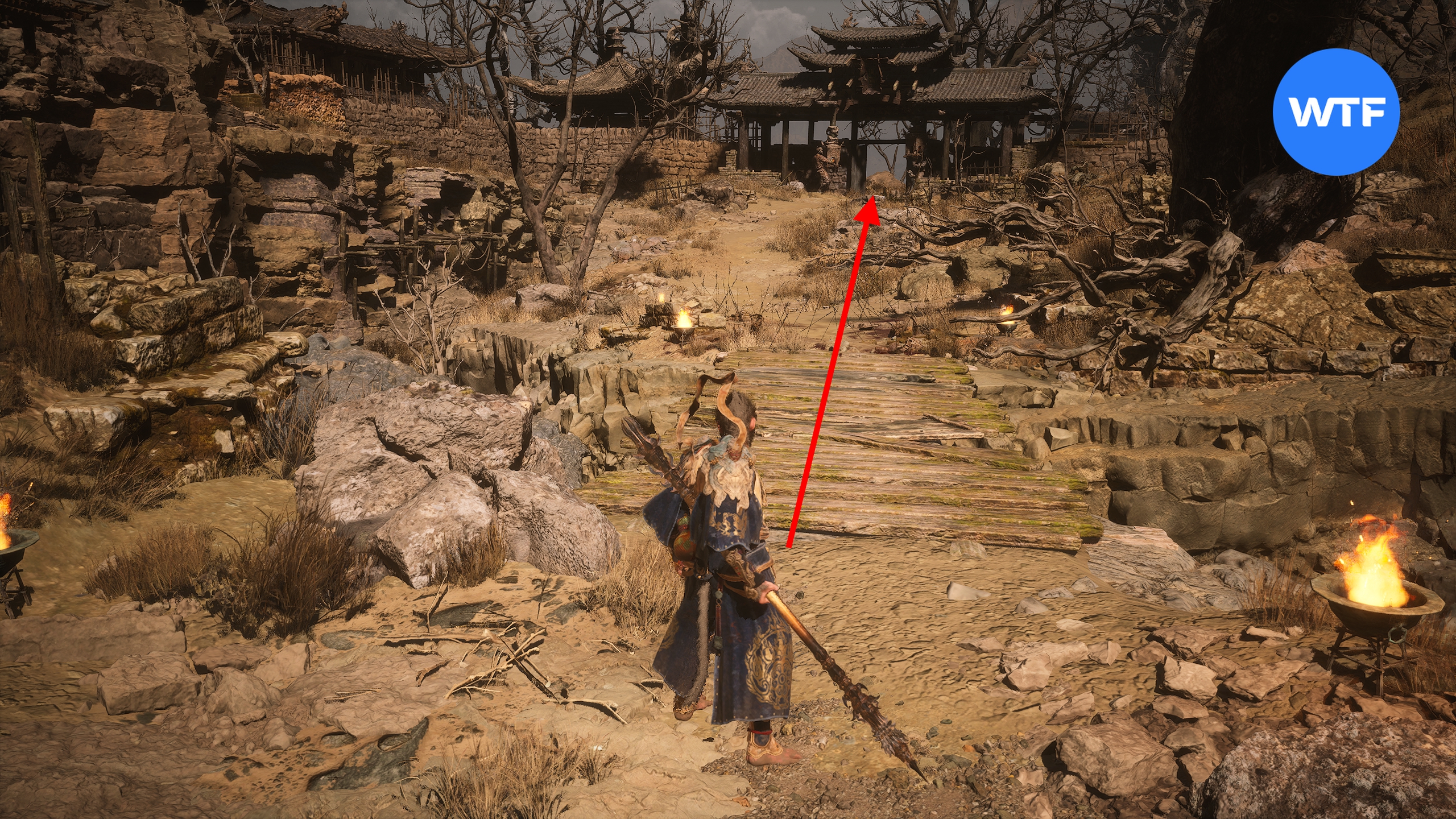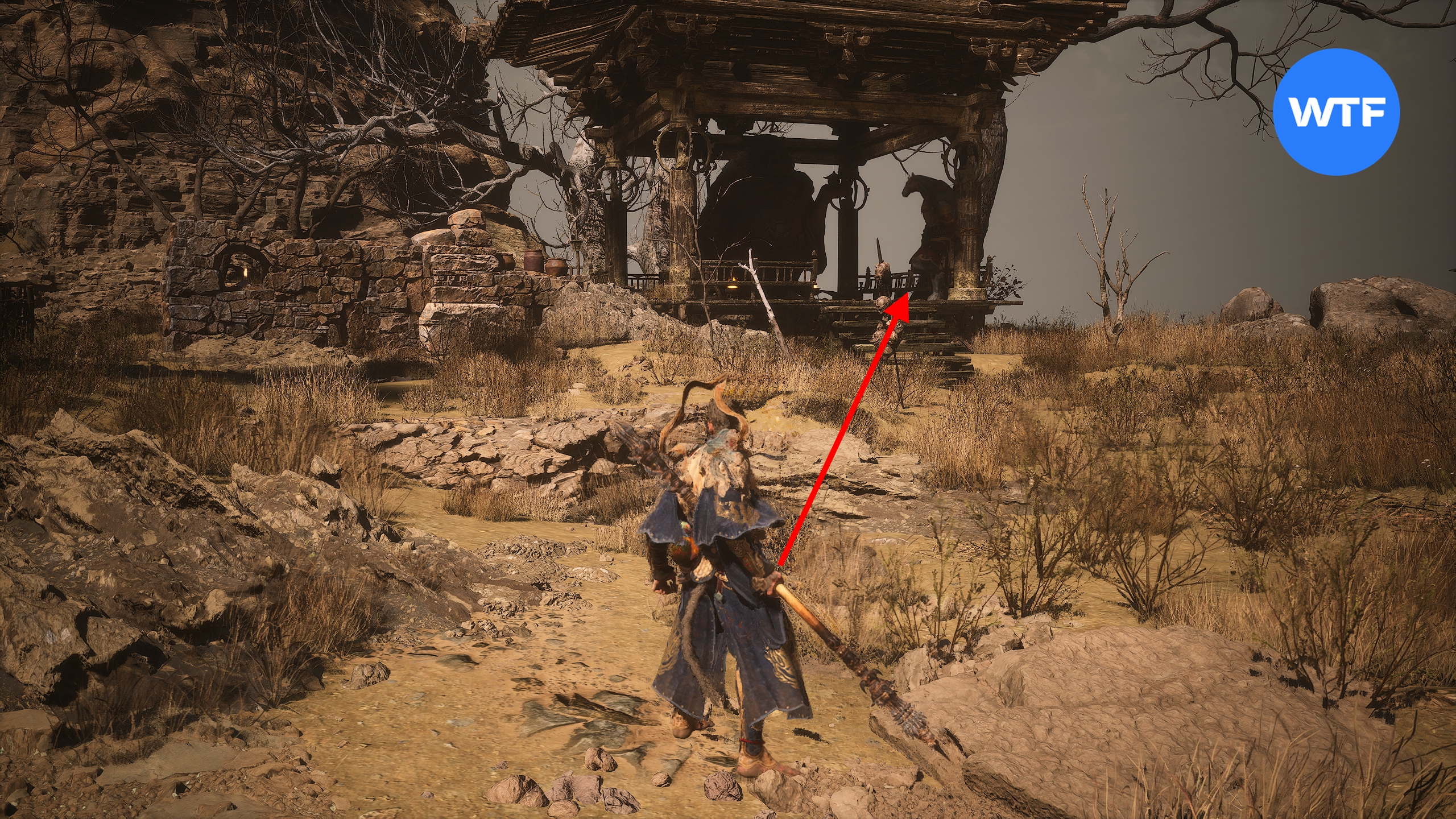 Станьте лицом к алтарю «Деревня Песчаные Врата [Вход в поселение]» и от него перейдите через деревянный мост слева. Бегите вперед и пройдите через большие ворота на арену, где вы сражались с Земляным волком.