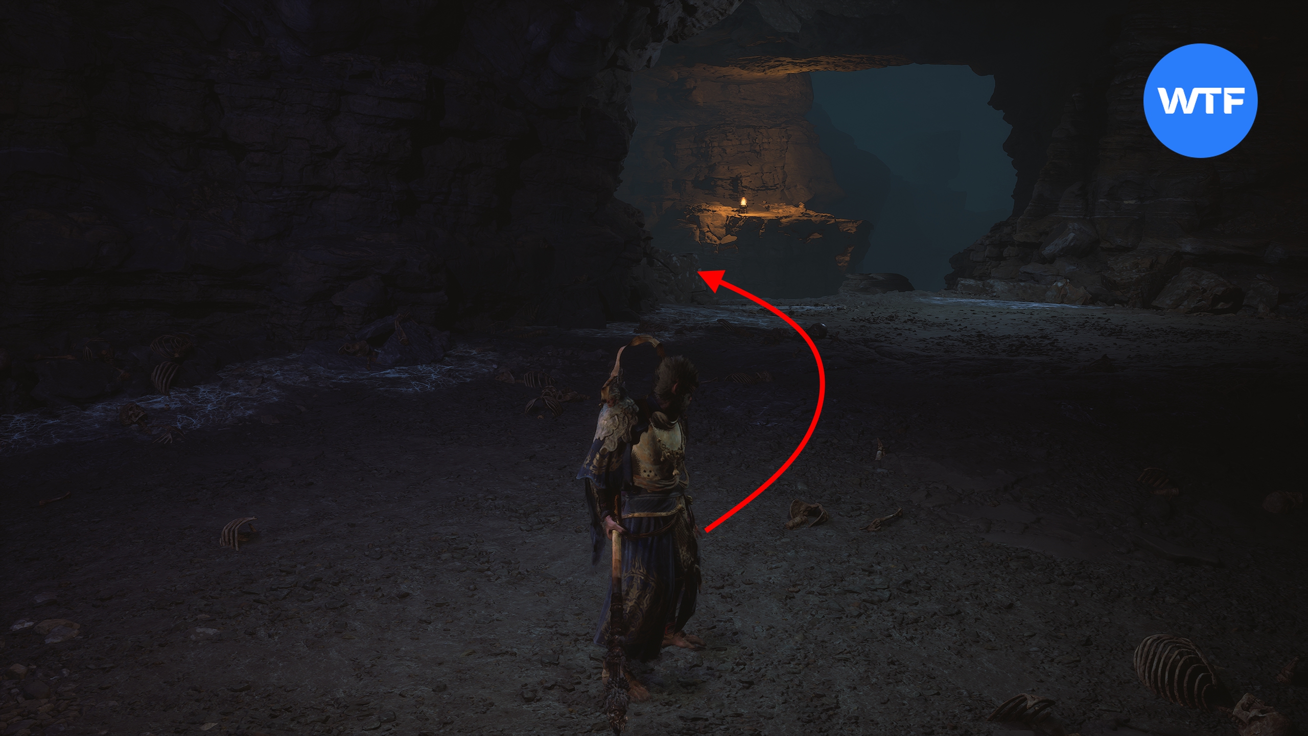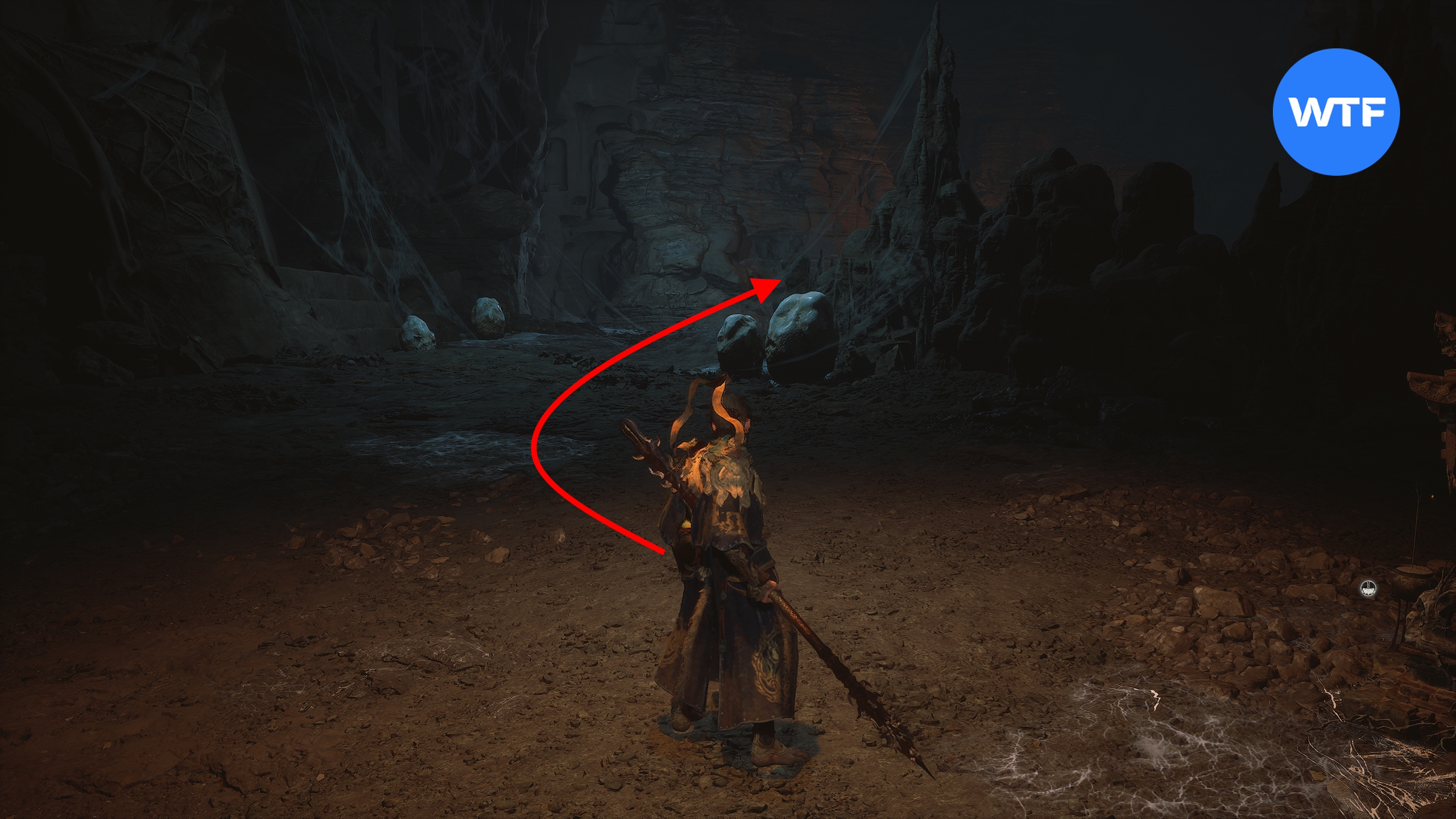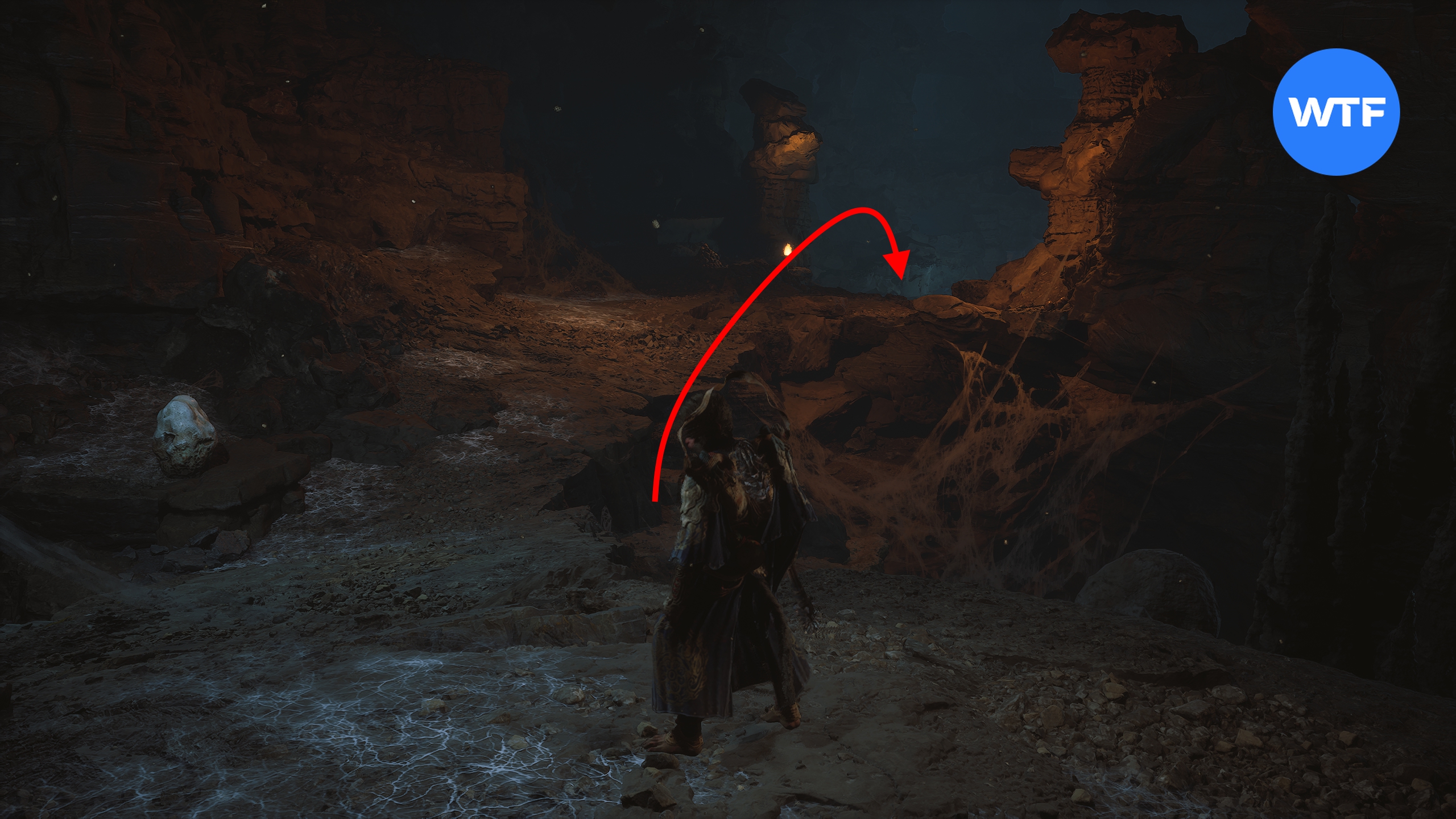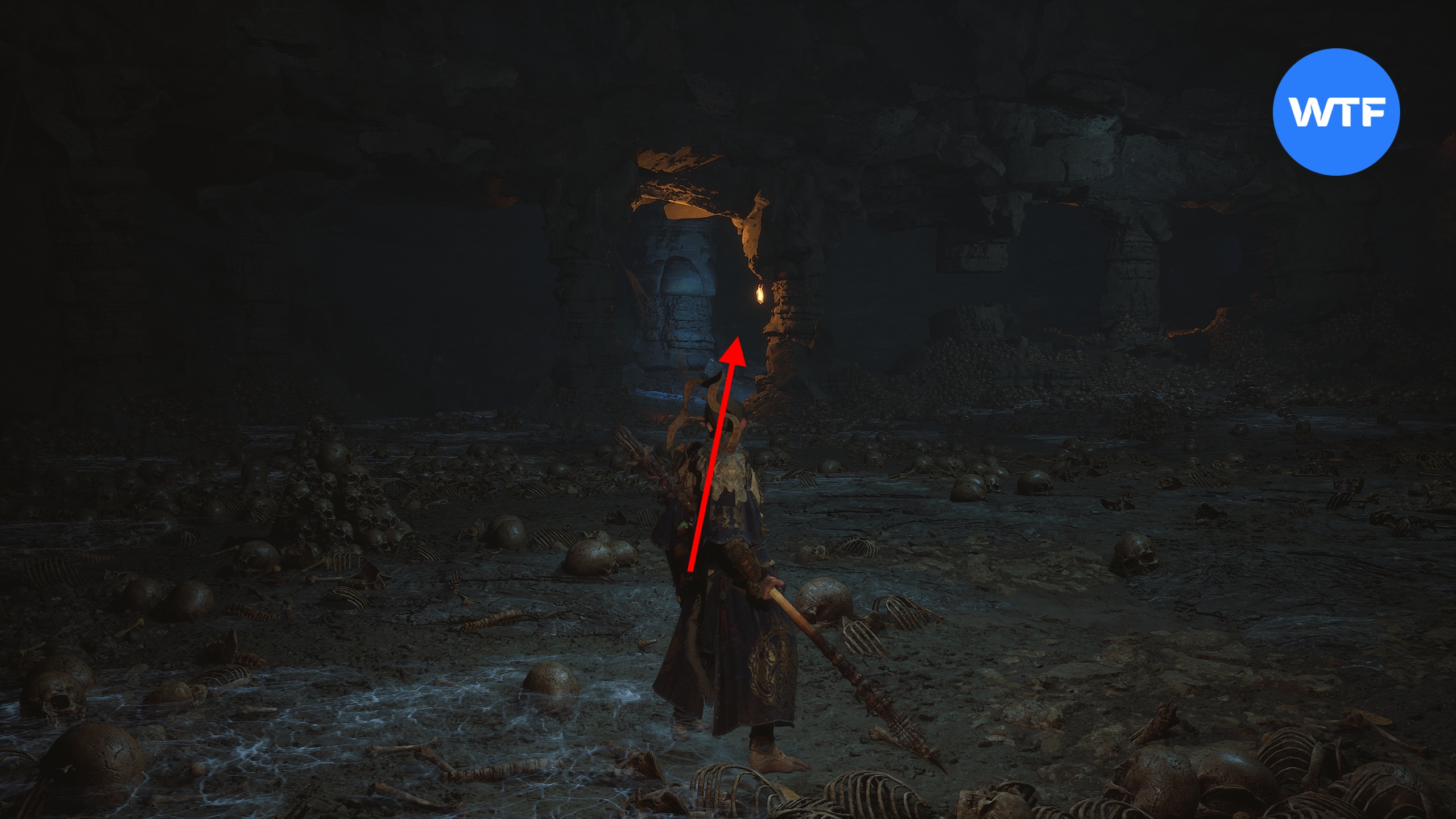 Станьте спиной к алтарю «Паутиновая яма [Пещера костей]» и от него бегите вперед, а затем спрыгните вниз на большую арену с костями, где вы сражались с Гуаем-многоножкой.