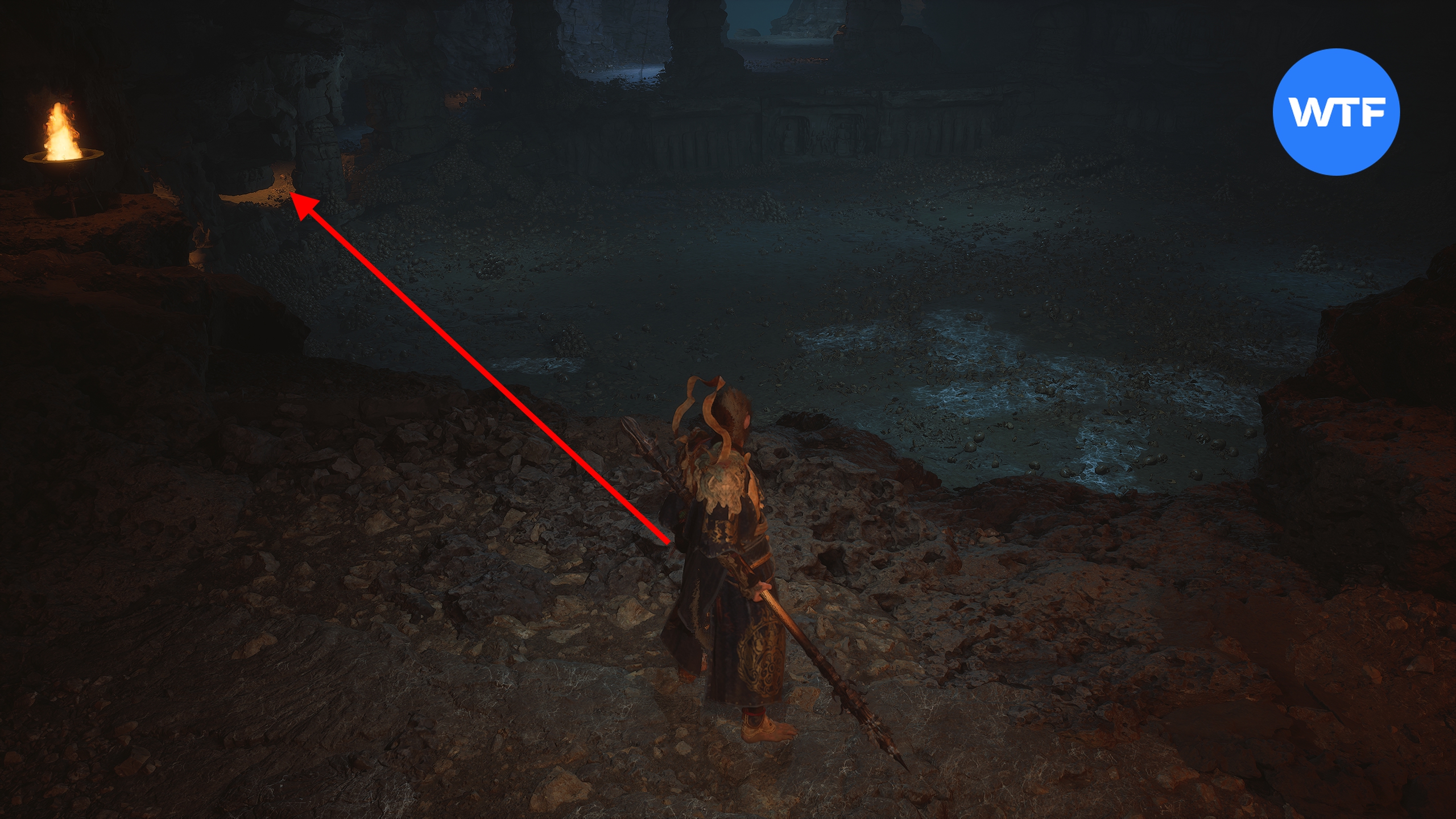 Станьте лицом к алтарю «Жаркая долина [Вход в долину]» и от него бегите налево по тропинке вдоль скал у обрыва. Когда тропинка начнет спускаться вниз, а вы увидите перед собой меньшого яогуая с большим щитом — спускайтесь в лавовую область перед вами с червяками, плюющимися огнем.