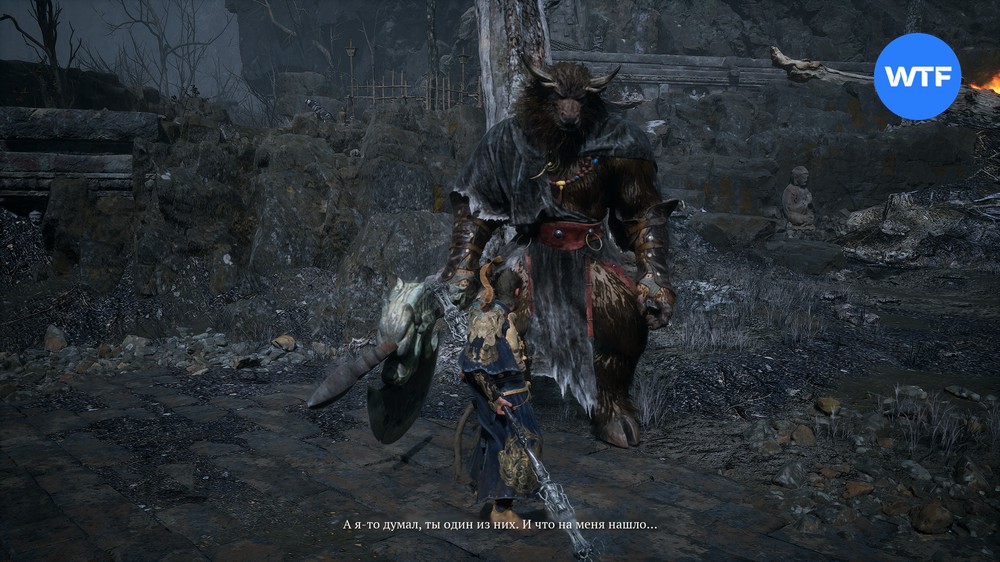 Разобравшись с первыми тремя тележками, вернитесь к алтарю «Тлеющий лес [Пепельный перевал I]» и бегите туда, где вы впервые встретили Бойца с белым топором. Поговорите с ним и исчерпайте все реплики, пока он не начнет повторять одну и ту же фразу.