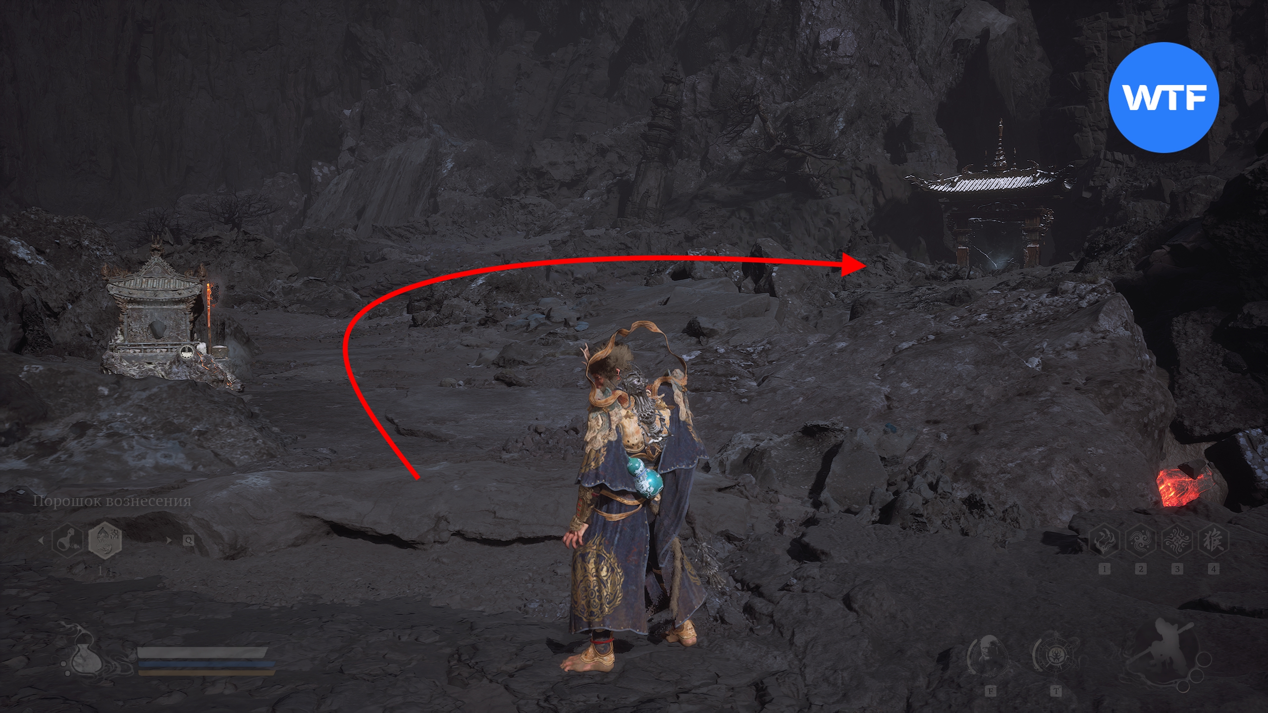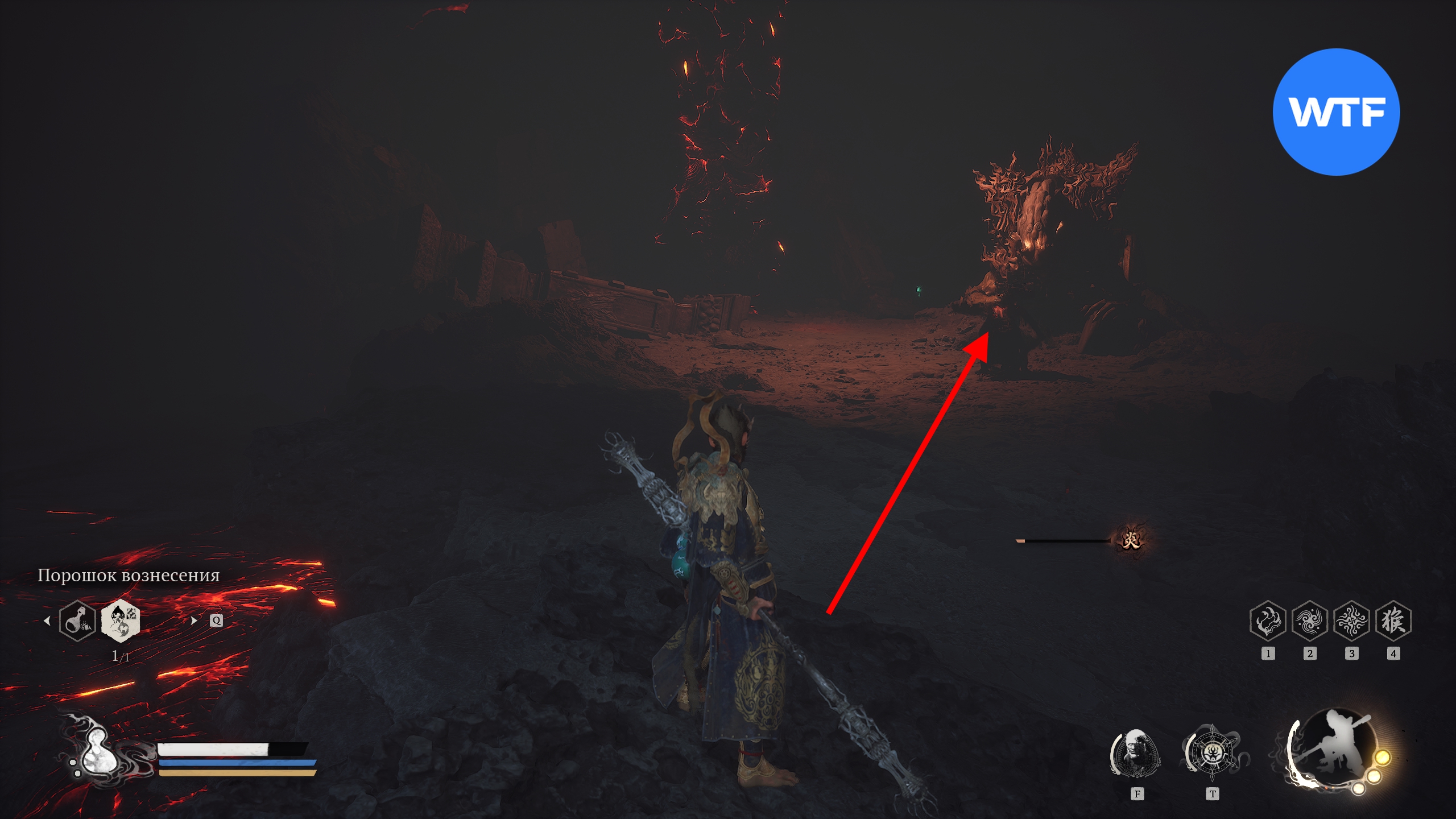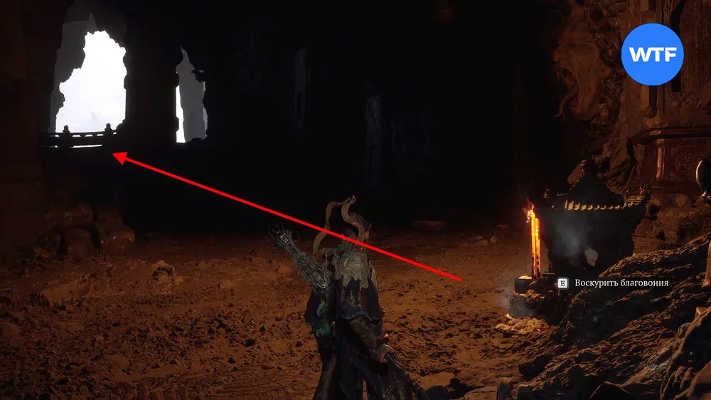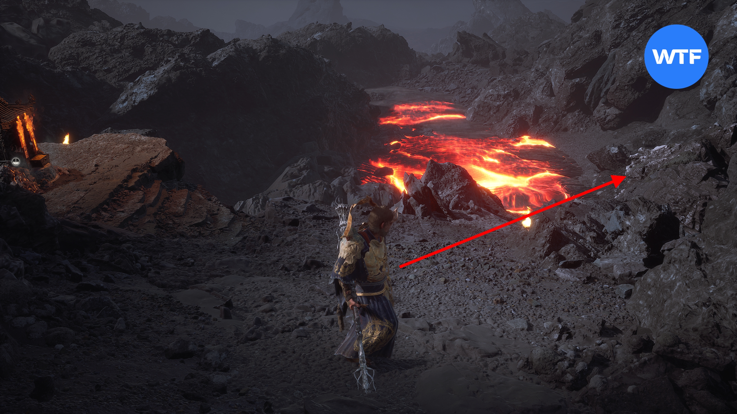 Переместитесь к алтарю «Жаркая долина [Вход в долину]», станьте к нему лицом и бегите налево по тропинке вдоль скал у обрыва. Когда тропинка начнет спускаться вниз, а вы увидите перед собой меньшого яогуая с большим щитом — спускайтесь в лавовую область перед вами с червяками, плюющимися огнем.