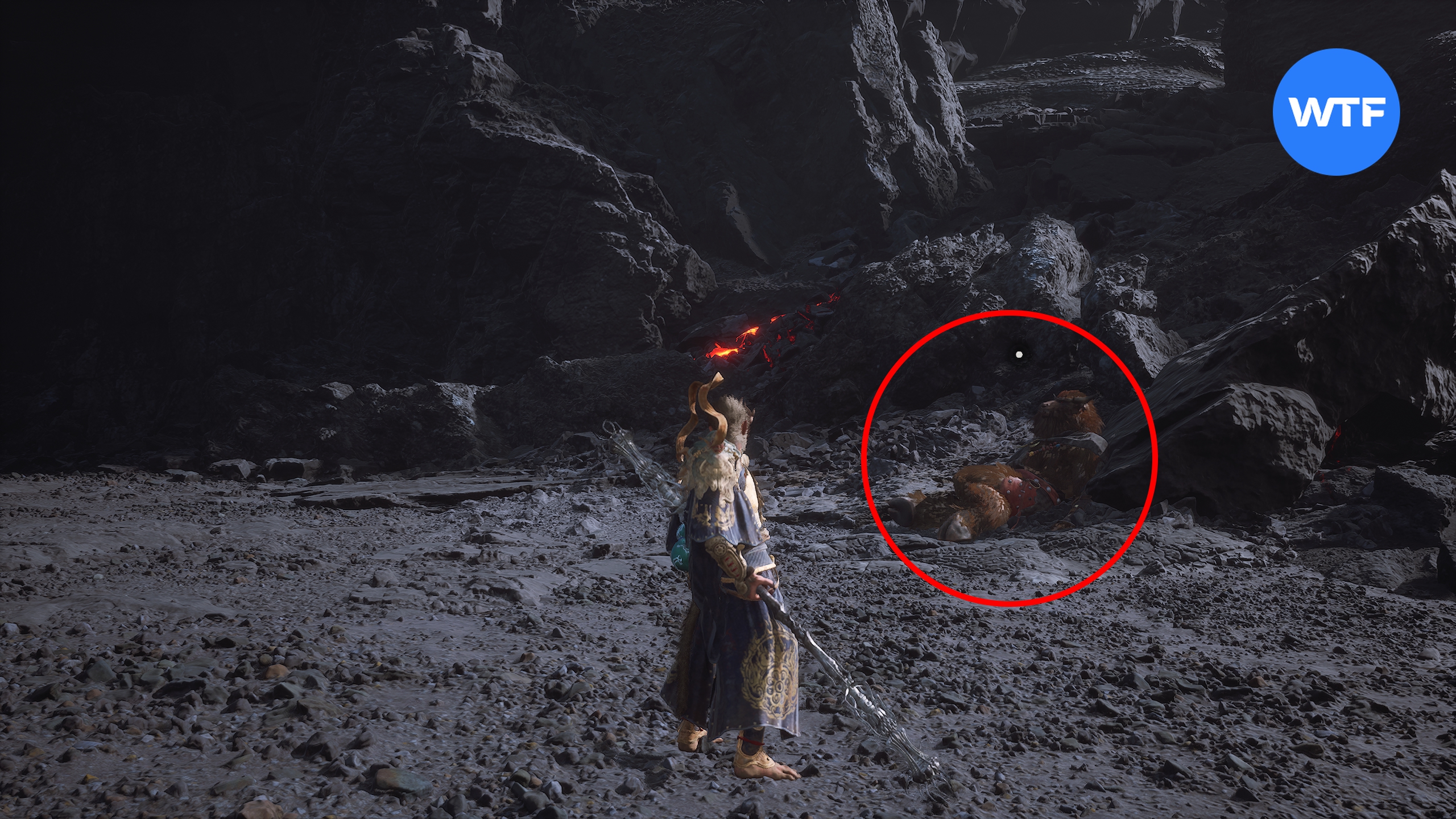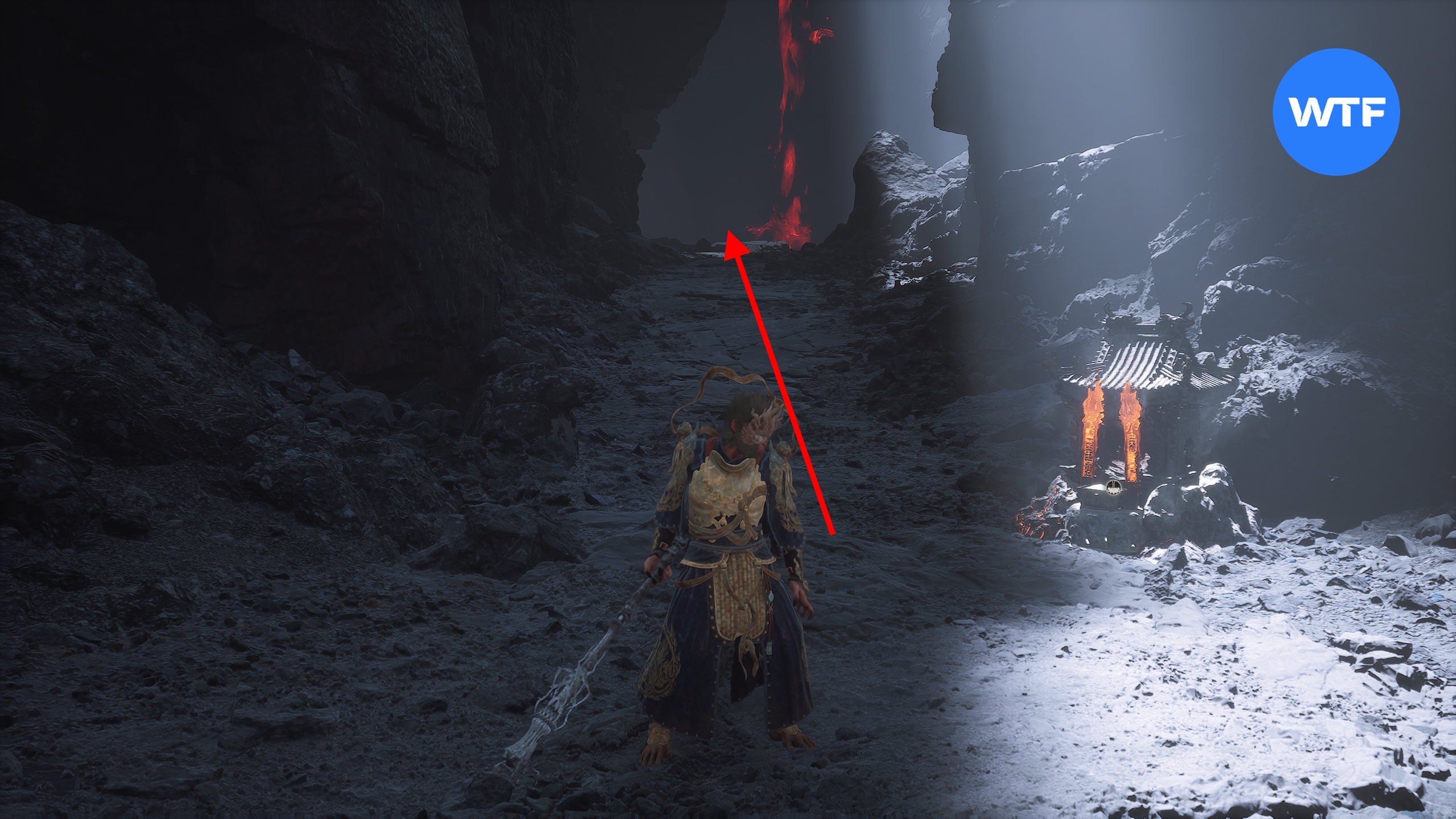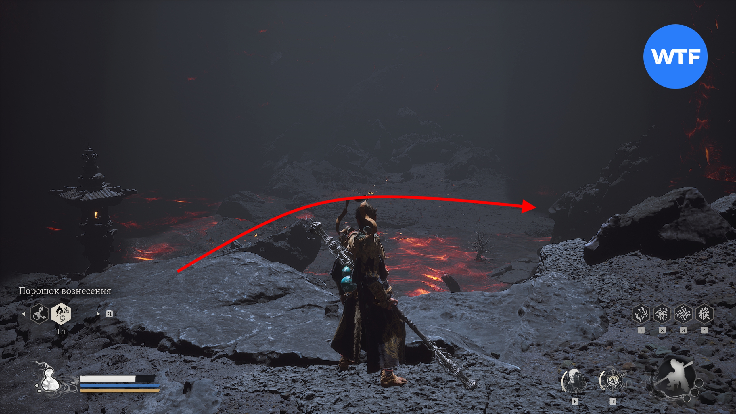 Переместитесь к алтарю «Жаркая долина [Вход в долину]», станьте к нему лицом и бегите налево по тропинке вдоль скал у обрыва. Когда тропинка начнет спускаться вниз, а вы увидите перед собой меньшого яогуая с большим щитом — спускайтесь в лавовую область перед вами с червяками, плюющимися огнем.