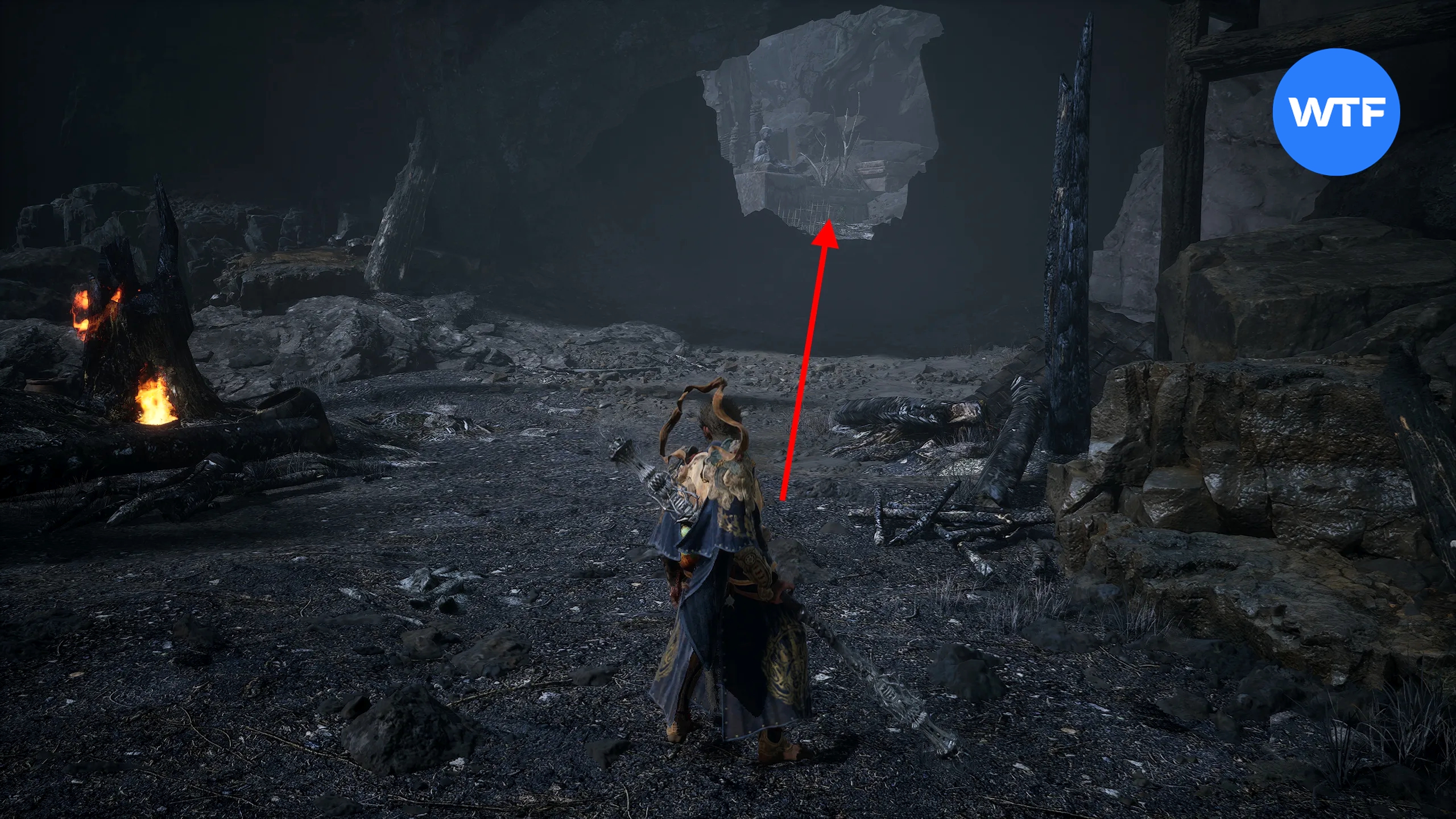 После этого пройдите перед и отоприте большие ворота справа. Бегите по каменной дорожке, а затем пройдите через туннель прямо и налево, ориентируясь на свет жаровен. Продолжайте бежать по тропинке среди скал пока в итоге не упретесь в эту повозку.