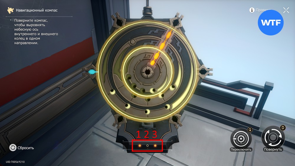 При этом некоторые кольца могут двигаться вместе. Чтобы понять, какие кольца вы вращаете в данный момент, смотрите на точки под компасом: горящие показывают порядковый номер поворачиваемых колец.