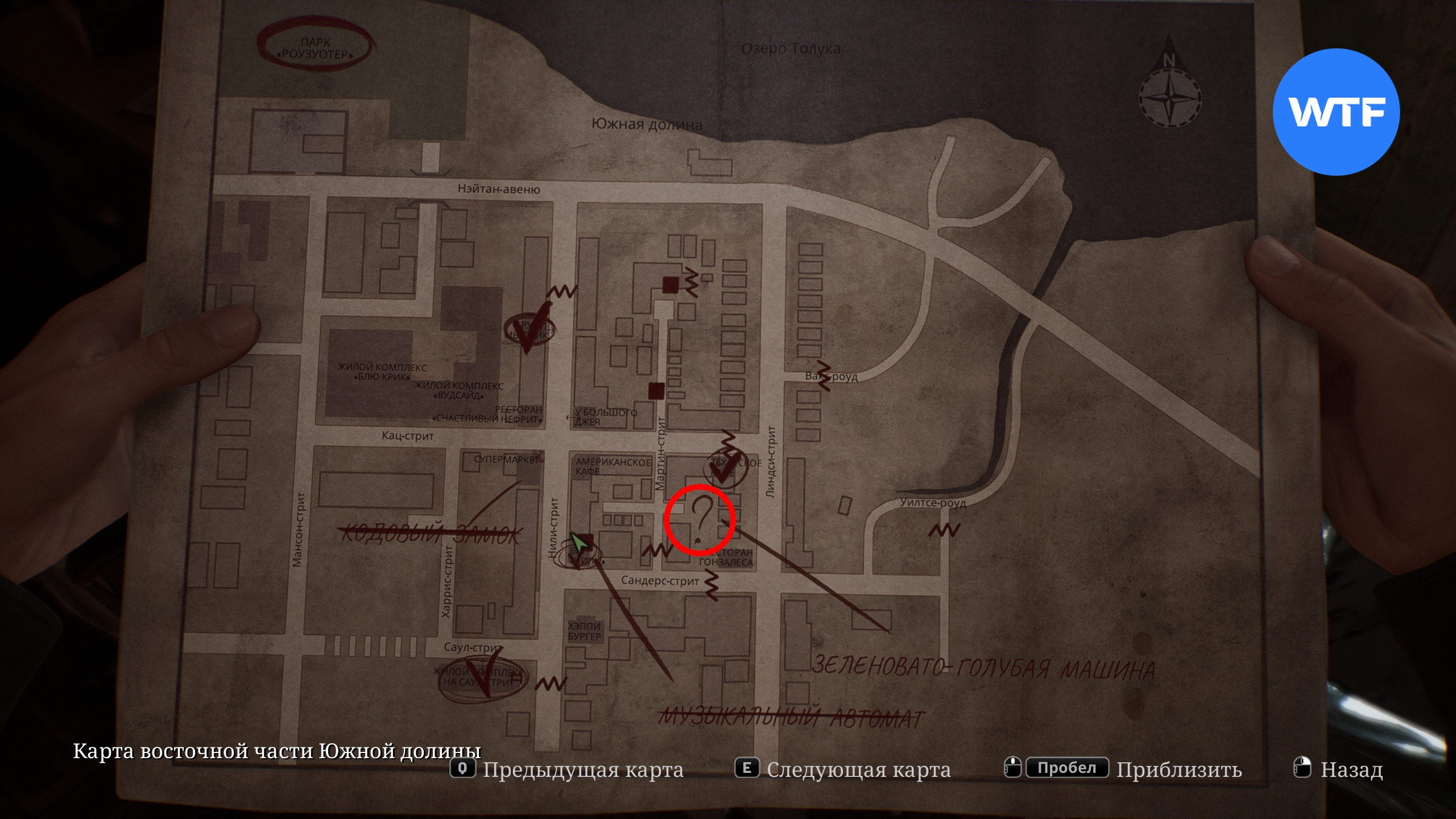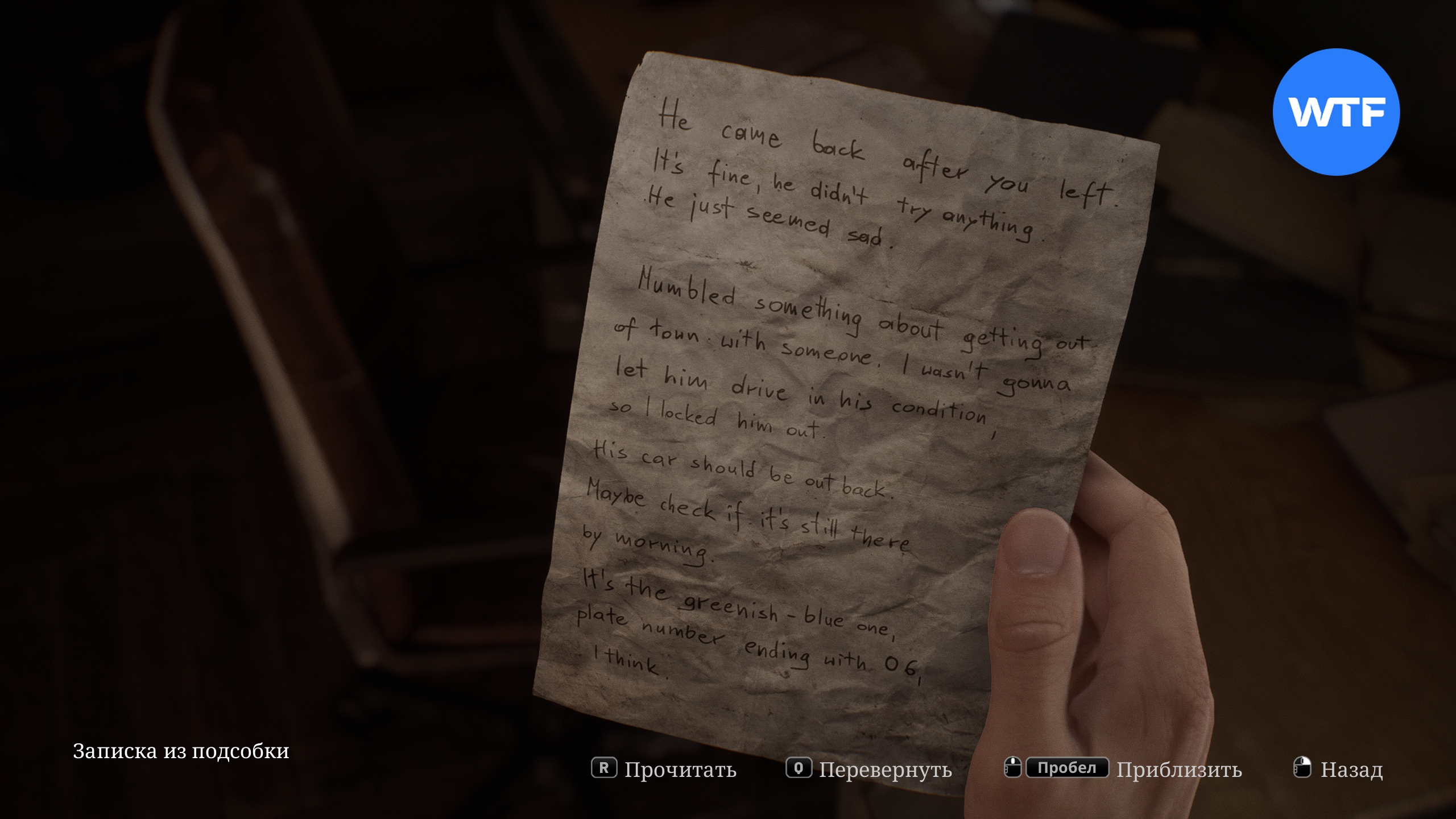Этот путь приведет вас в комнату наверху, где на столе у окна лежит записка из подсобки. Прочтите её, чтобы добавить отметку зеленовато-голубой машины на свою карту.