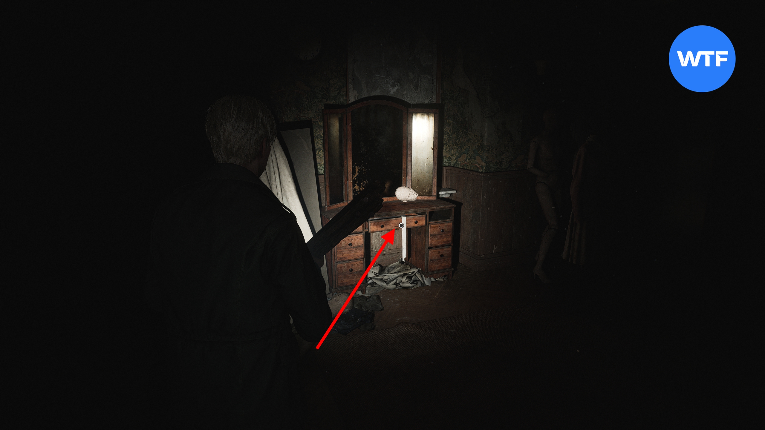 Поднимитесь по лестнице на второй этаж и идите в комнату 202. Заберите фонарик с манекена, разберитесь с напавшим на вас монстром, а затем отыщите ключ от выхода к мусоропроводу внутри туалетного столика.