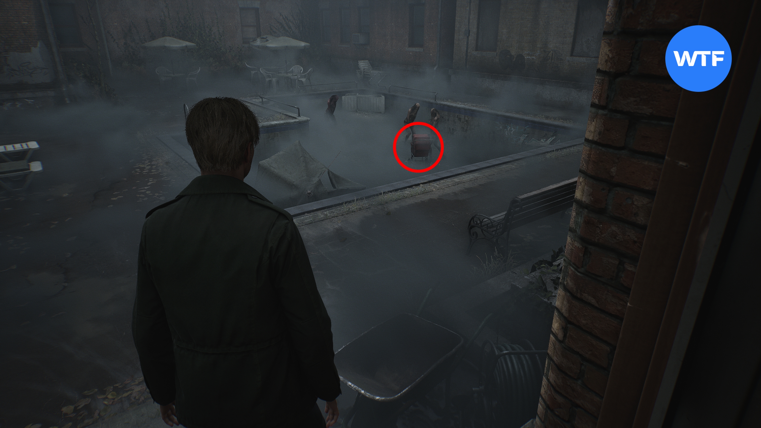 Ваша цель — красная коляска, стоящая посреди бассейна. Чтобы до неё добраться, придется разобраться с пятью врагами, патрулирующими эту область. Используйте пистолет или выманивайте их по одному, чтобы сделать этот бой проще. Внутри коляски лежит монета «Змея».