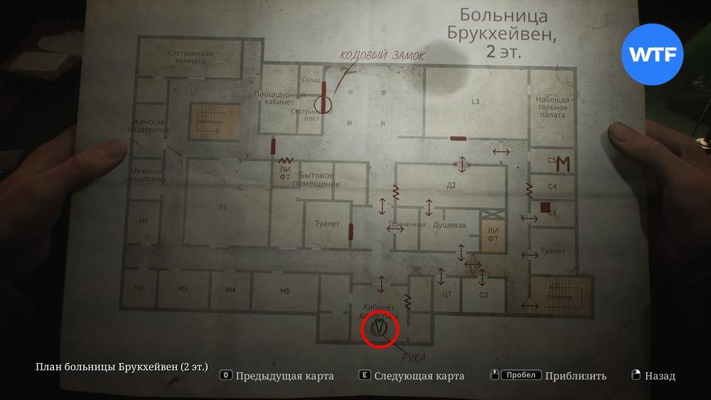 Чтобы добраться до загадки с рукой в больнице Брукхейвен, нужно отыскать кабинет директора в южной части 2 этажа. Вы сможете сделать это, после того как получите ключ от подвала из шкафчика на стойке администратора и восстановите там питание лифта при помощи генератора.
