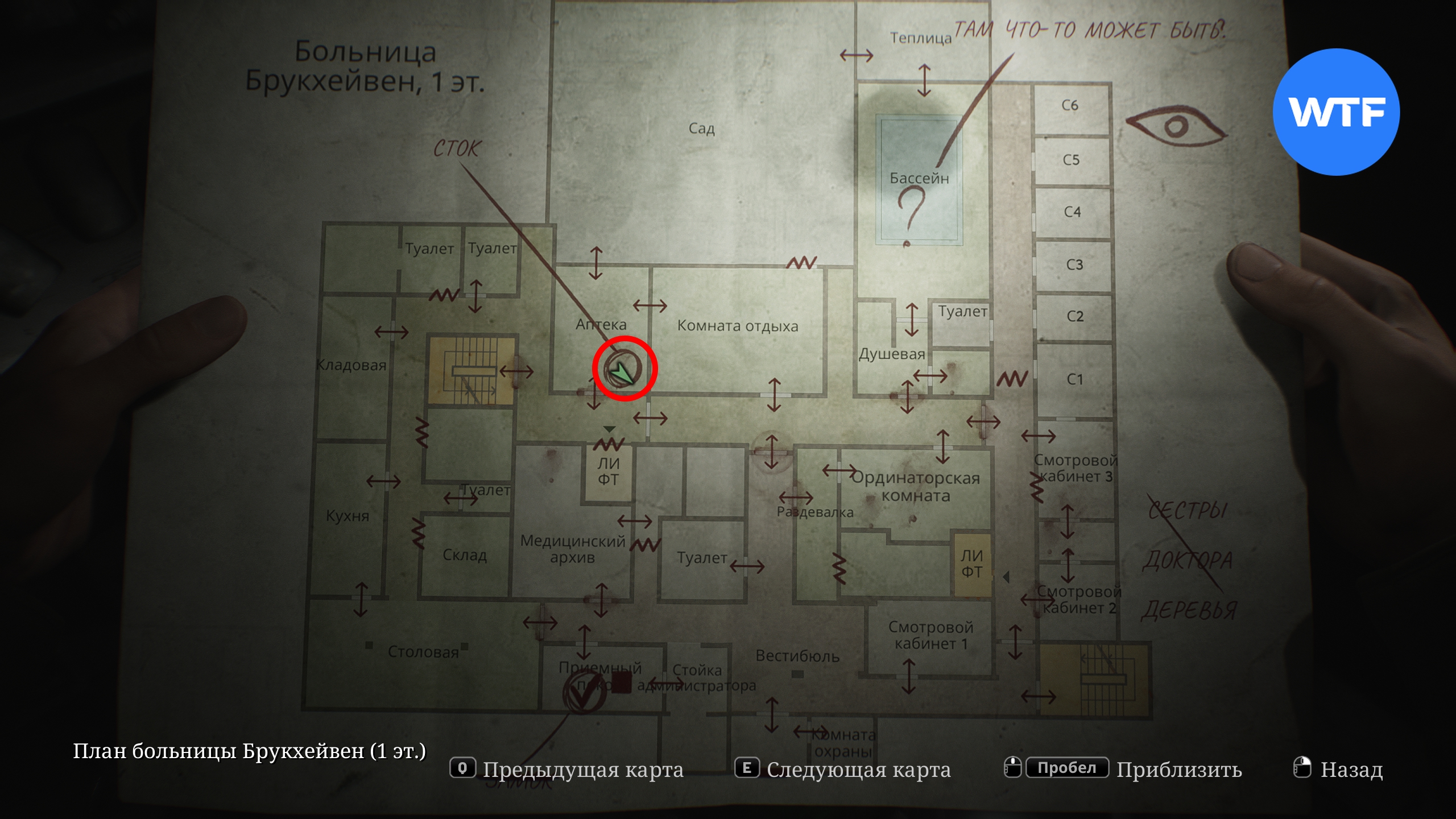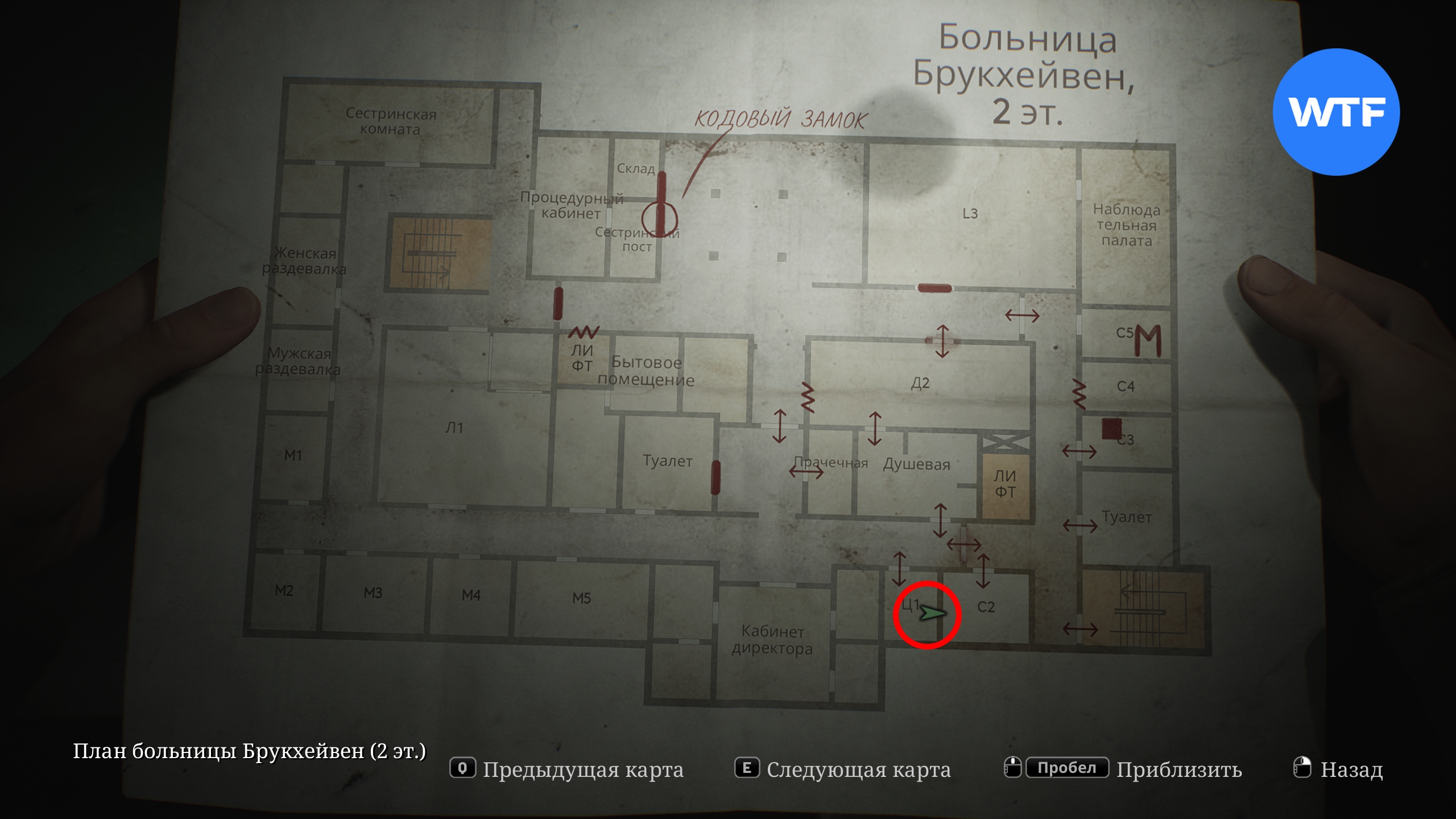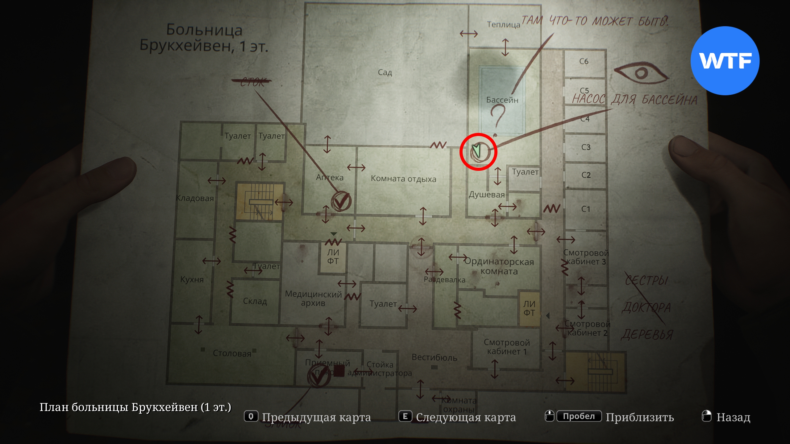 В первую очередь загляните в палату Ц1, расположенную справа от кабинета директора. Там на стене висит плакат, под которым спрятана расшифровка разговора. Эта записка добавит новую отметку на вашу карту первого этажа и предложить проверить бассейн.