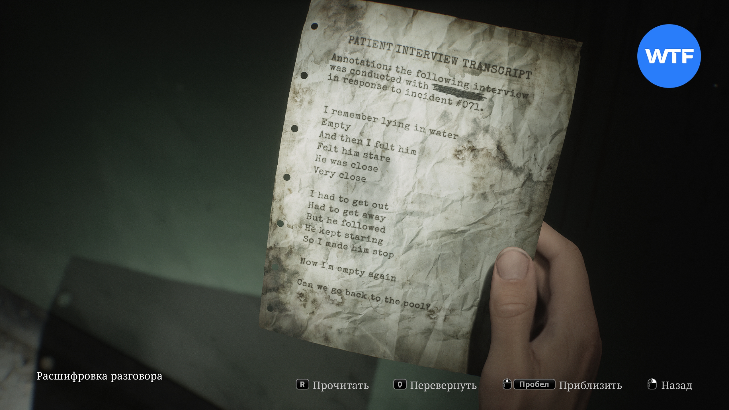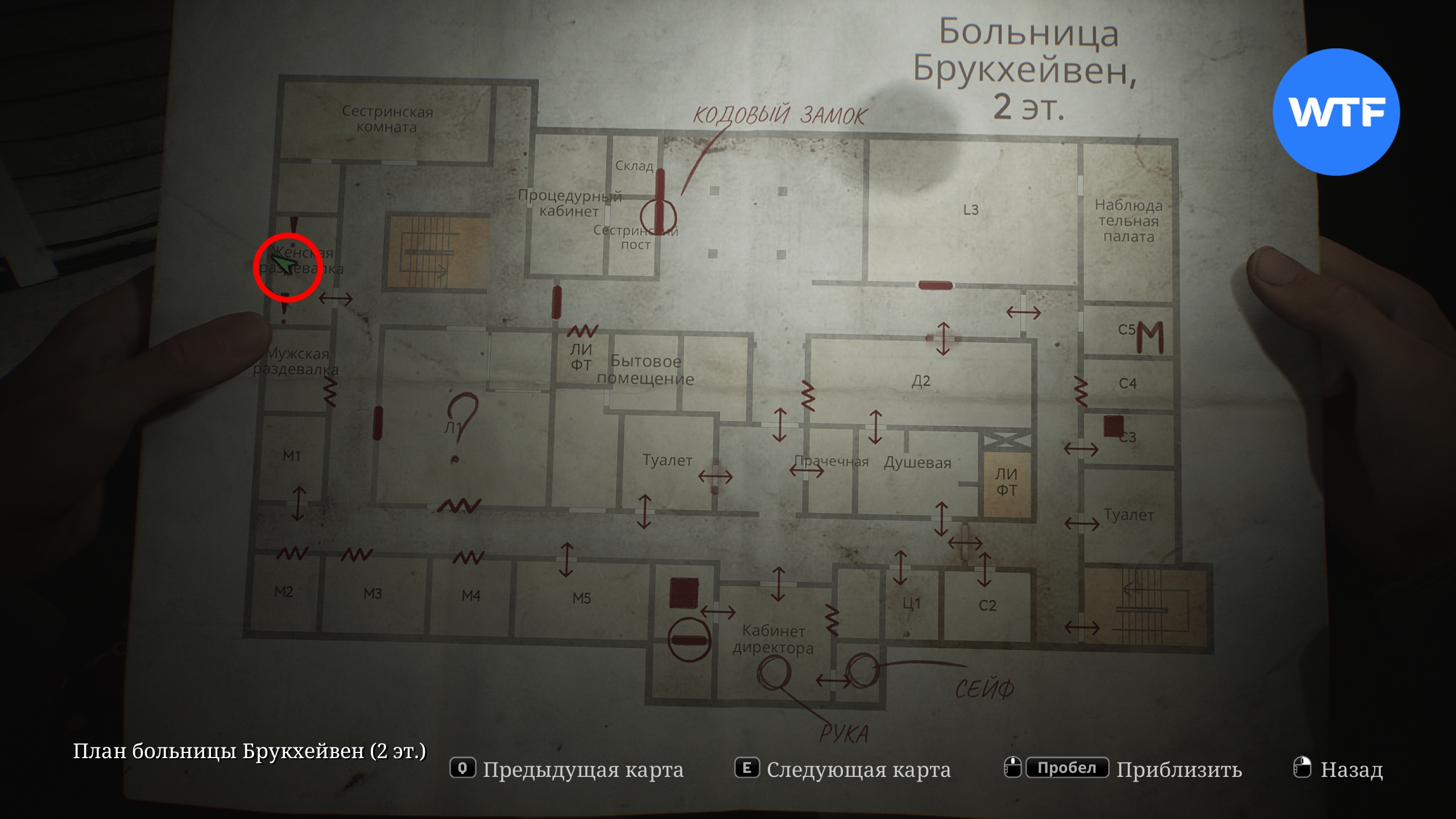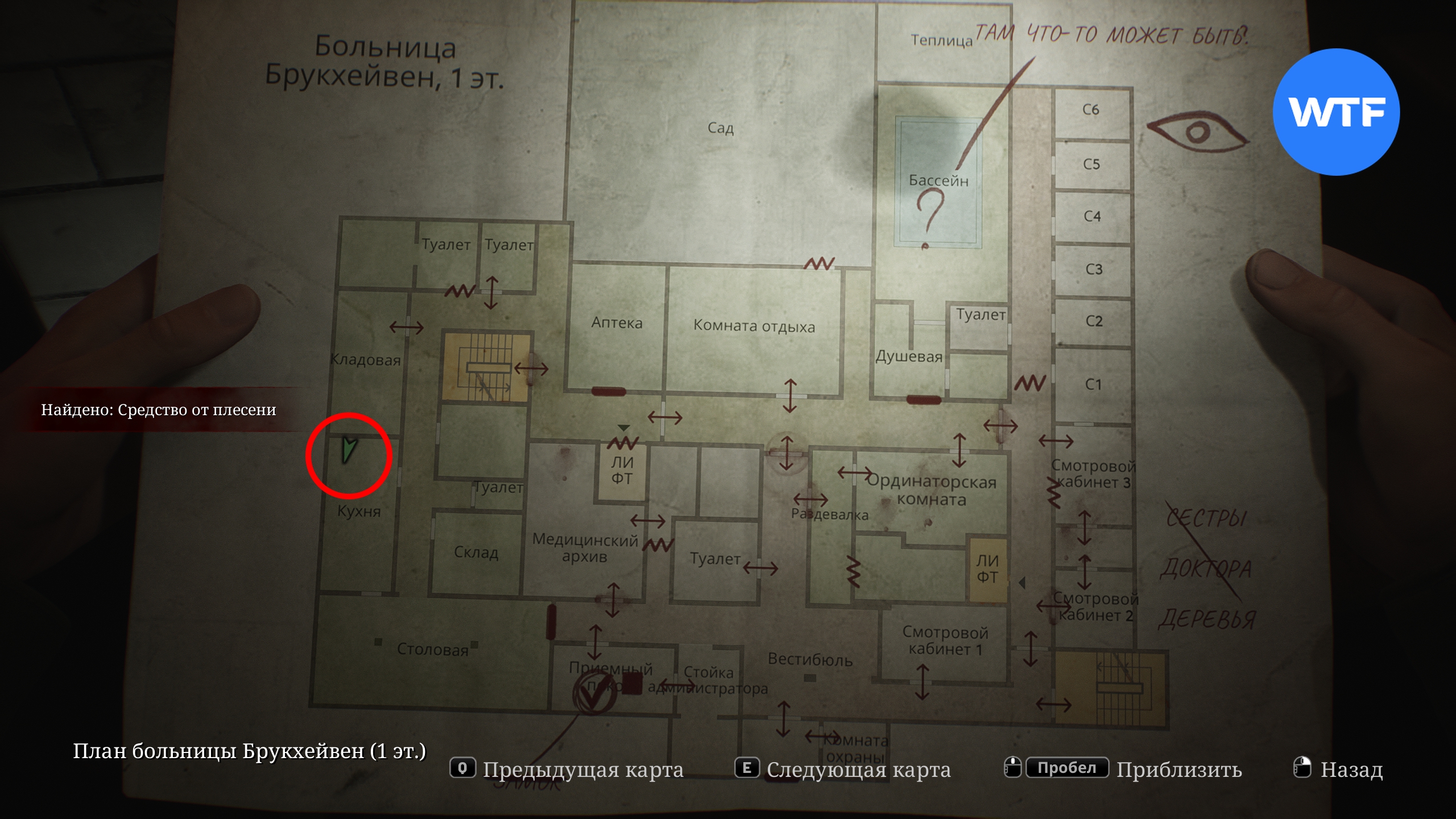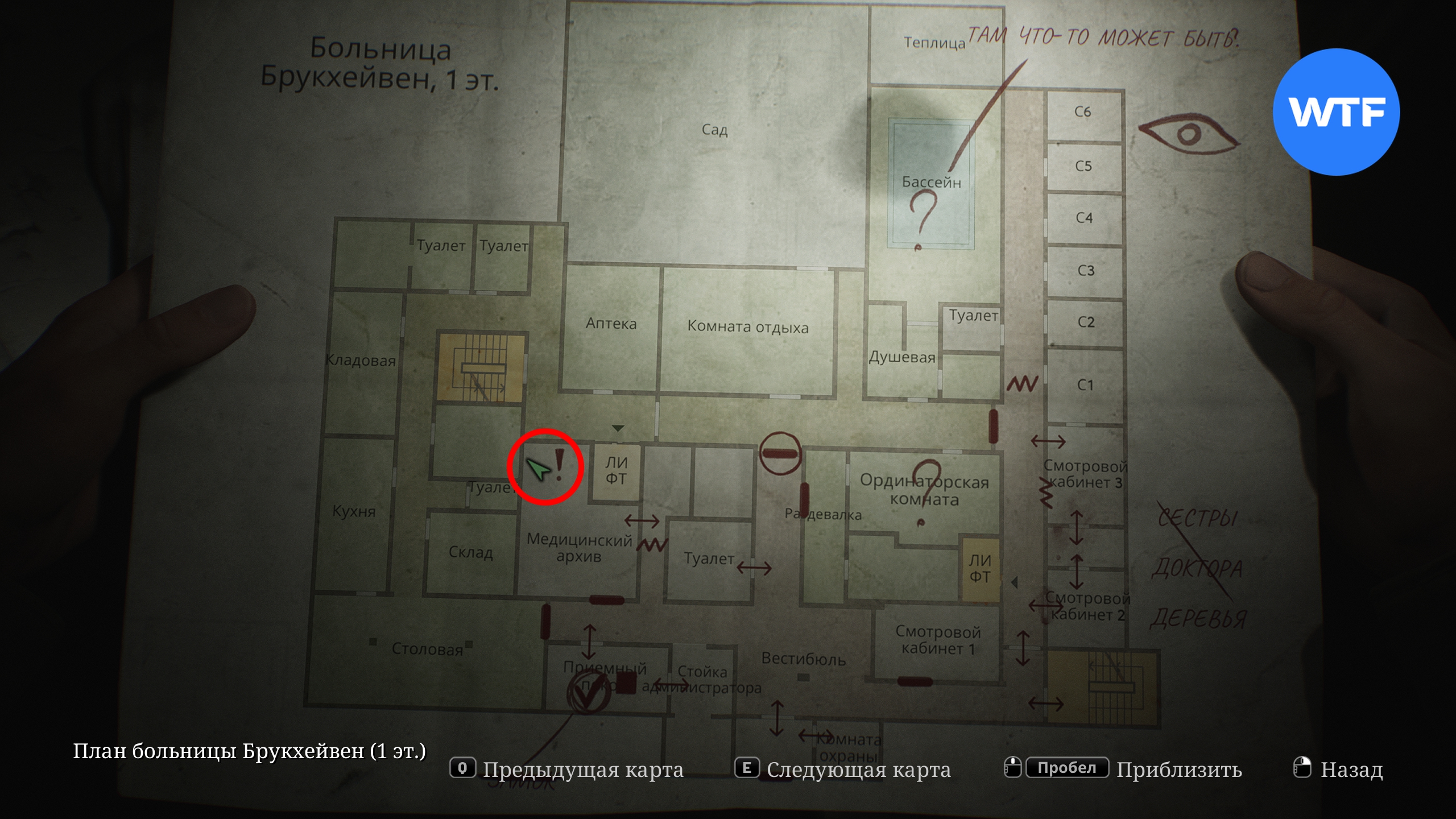 В первую очередь загляните в палату Ц1, расположенную справа от кабинета директора. Там на стене висит плакат, под которым спрятана расшифровка разговора. Эта записка добавит новую отметку на вашу карту первого этажа и предложить проверить бассейн.