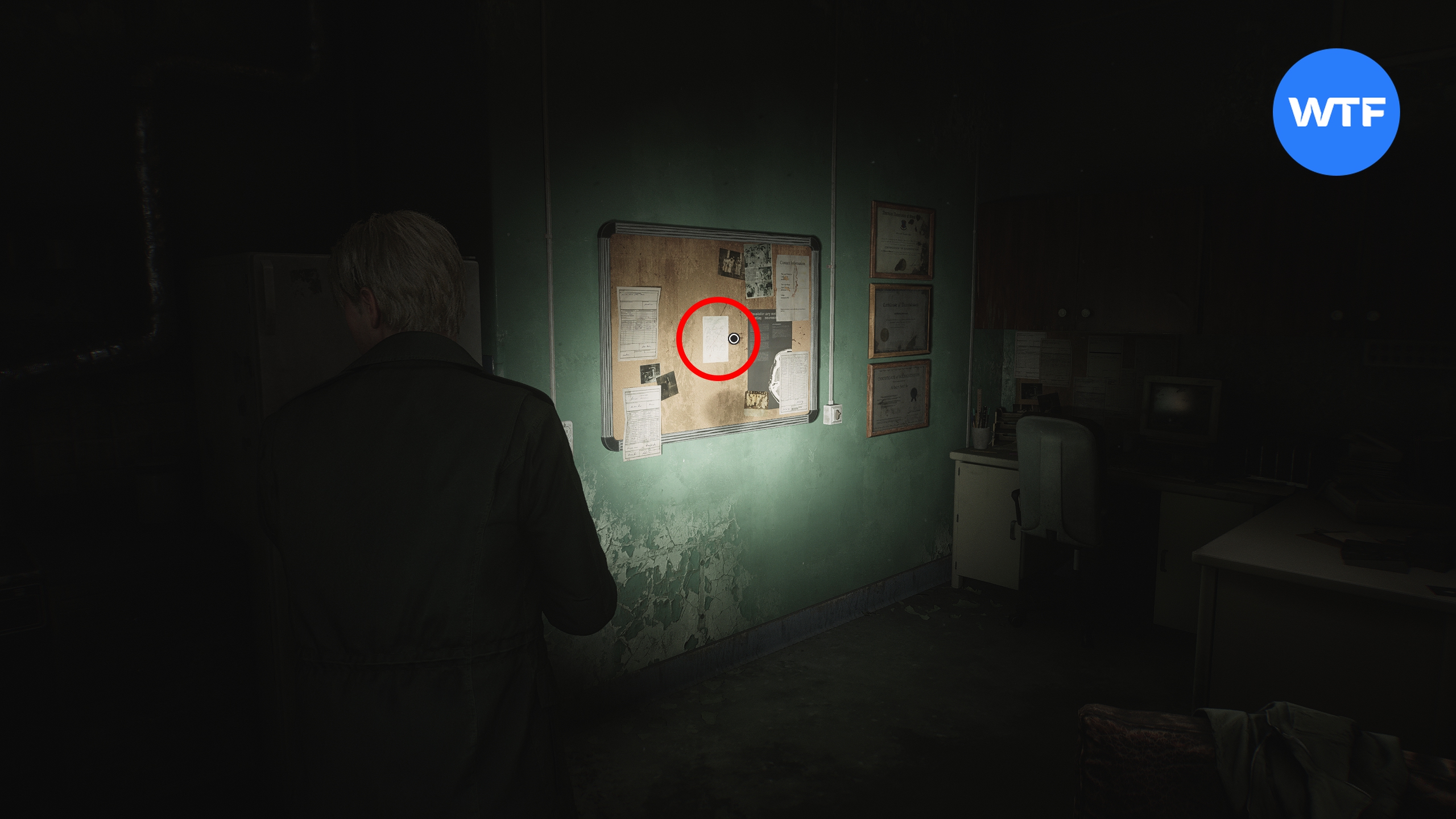 Теперь вернитесь на первый этаж и отоприте двойные двери к северу от вестибюля. Загляните в ординаторскую комнату, чтобы найти там записку с новым кодом, прикрепленную к доске для заметок. Она потребуется, чтобы открыть дверь в сестринскую на втором этаже.