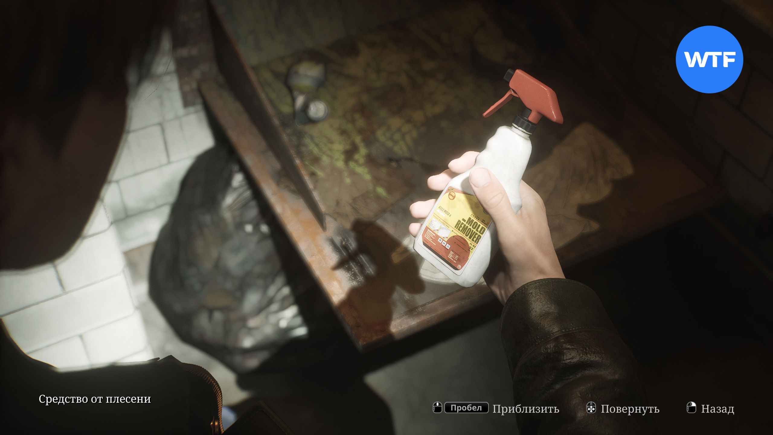 Теперь бегите по коридору налево и загляните на кухню. Вам нужно забрать средство от плесени, стоящее на крышке мусоропровода.