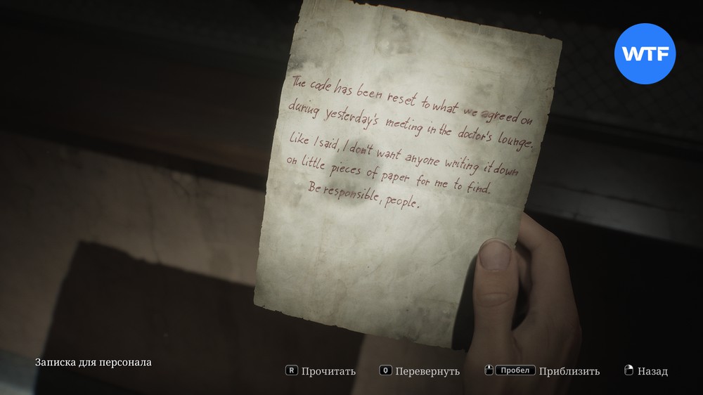 Прочитав записку для персонала на двери с кодовым замком, вы узнаете что код нужно искать в ординаторской комнате на первом этаже.