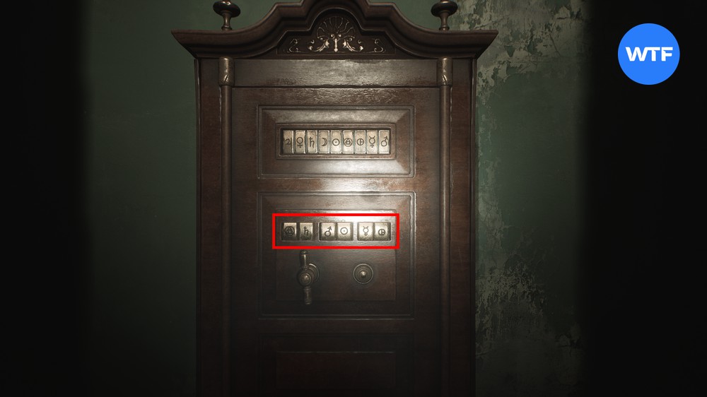 Ключ, позволяющий перевести символы в цифры, есть на полке с книгами. Опираясь на него, вам нужно ввести комбинацию из шести символов, показанную на скриншоте ниже: