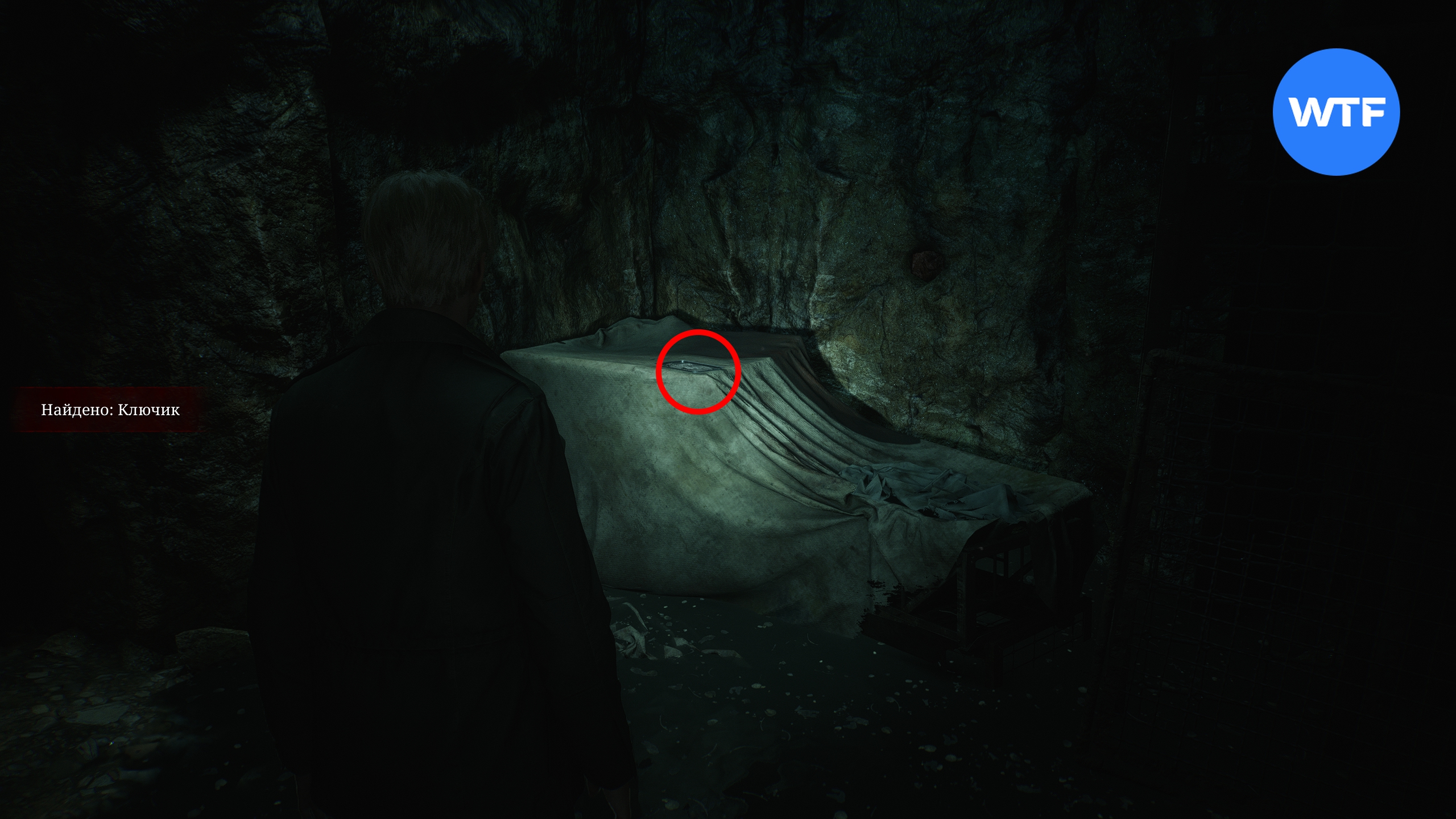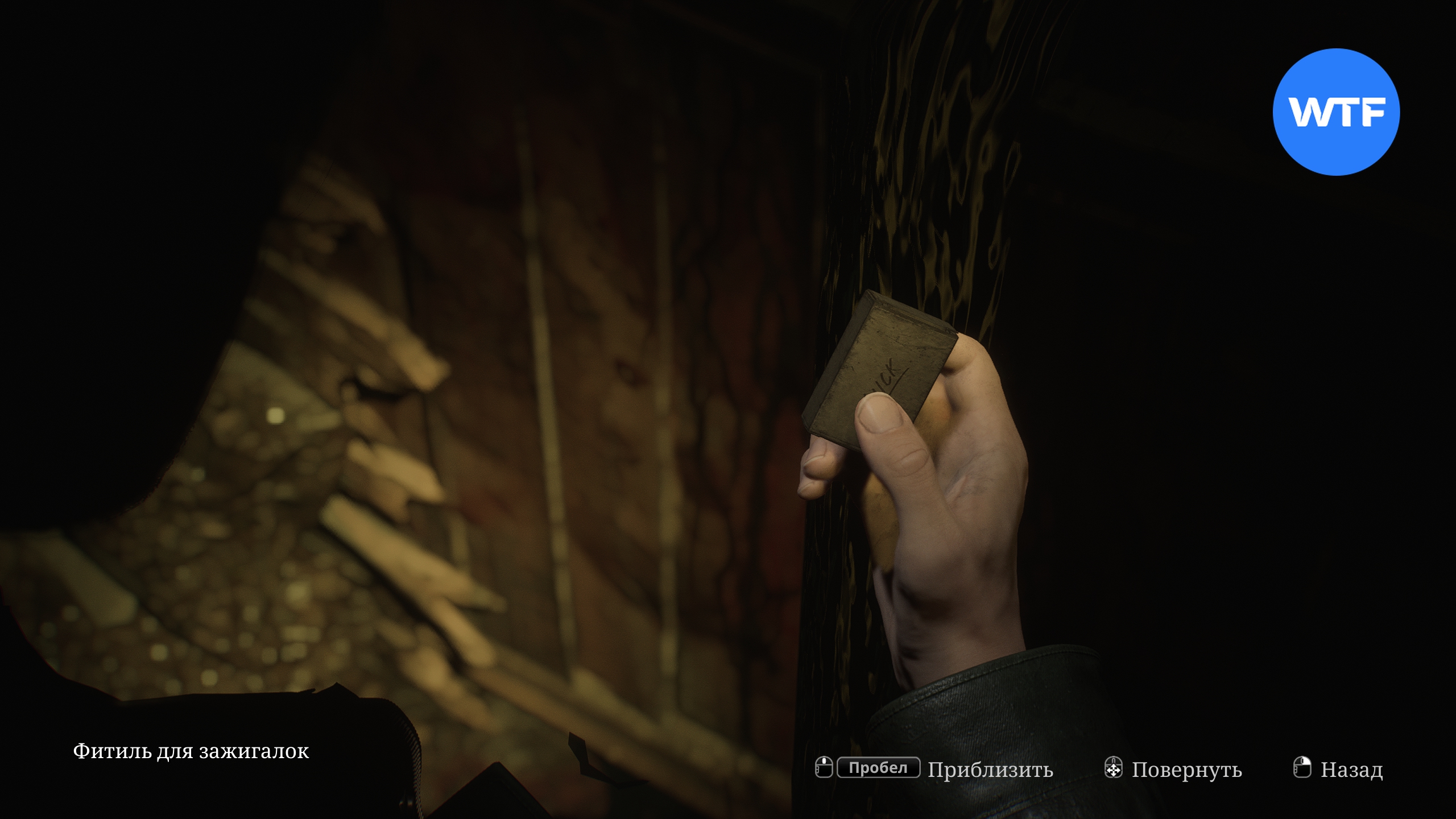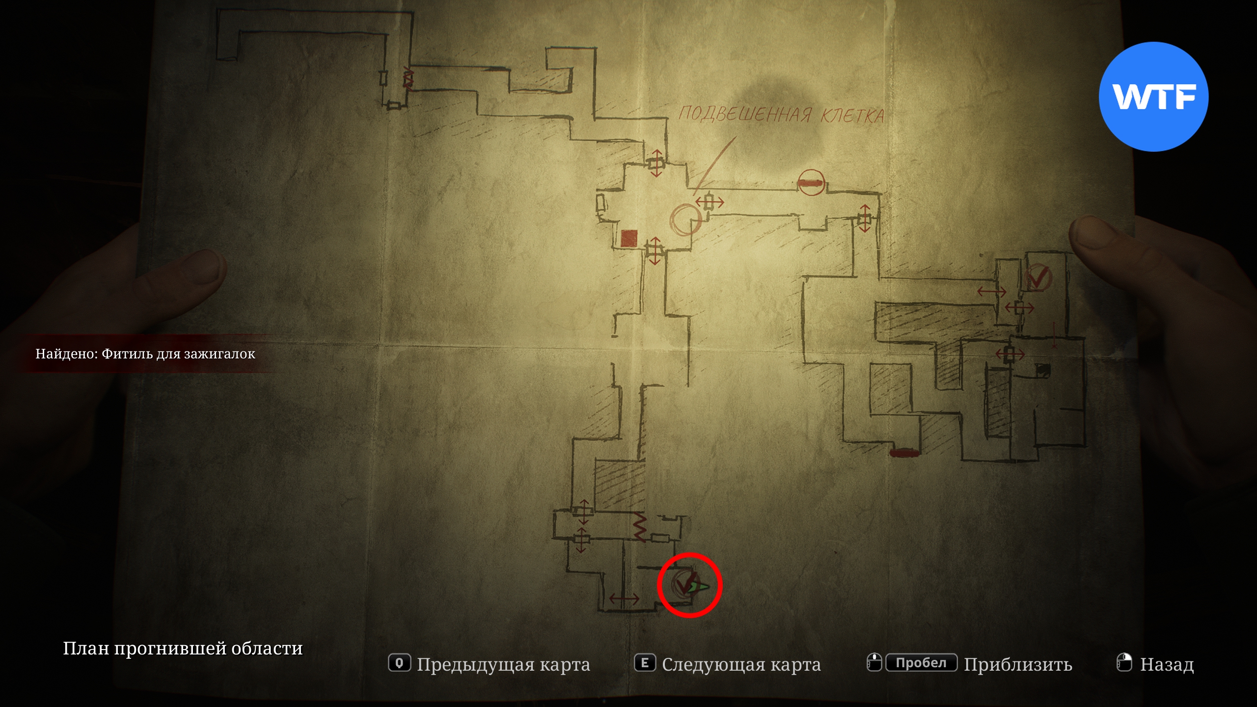 Теперь исследуйте область к югу от подвешенной клетки. Здесь вам нужно найти сразу два предмета. Для начала бегите по коридору на юг до конца и достаньте фитиль для зажигалок из окровавленной дыры в стене.