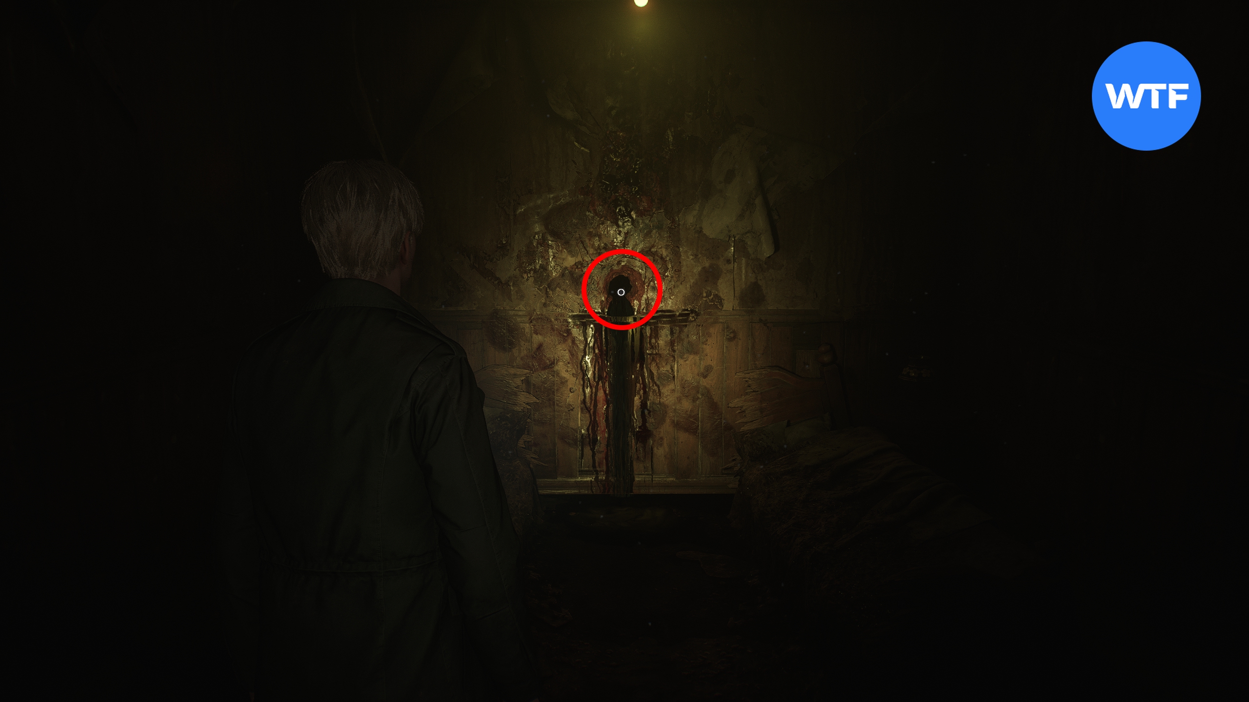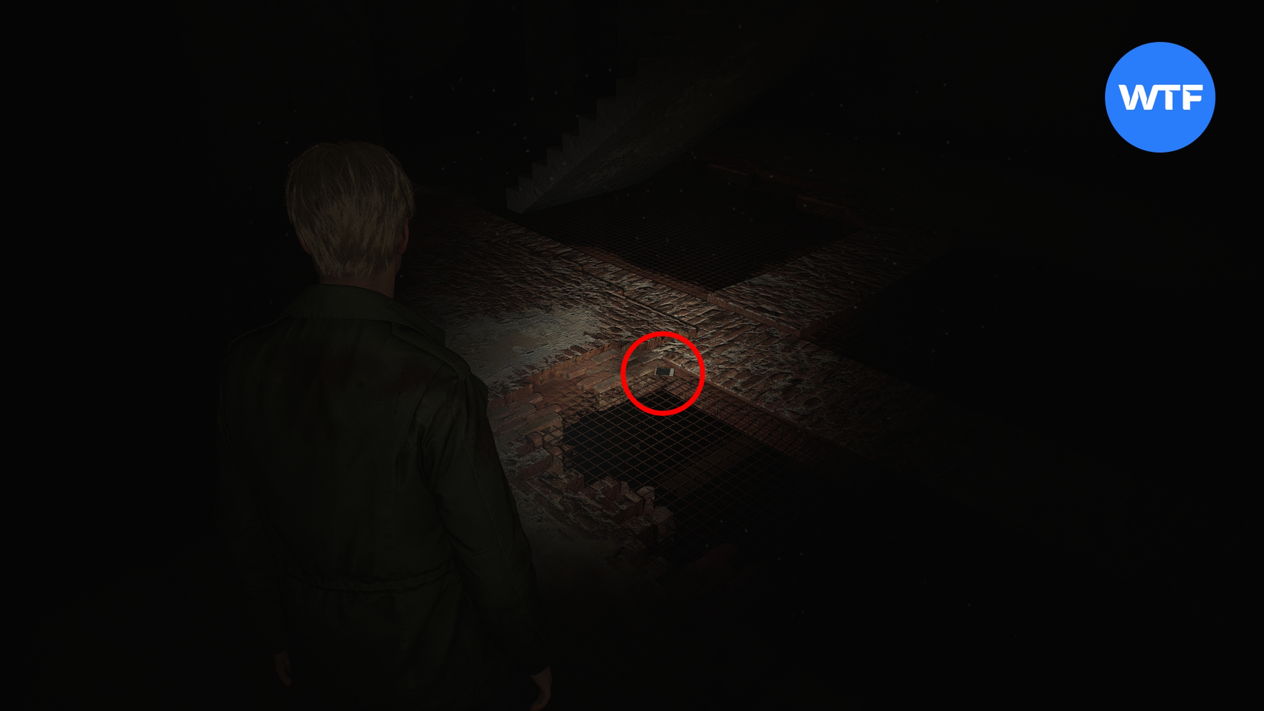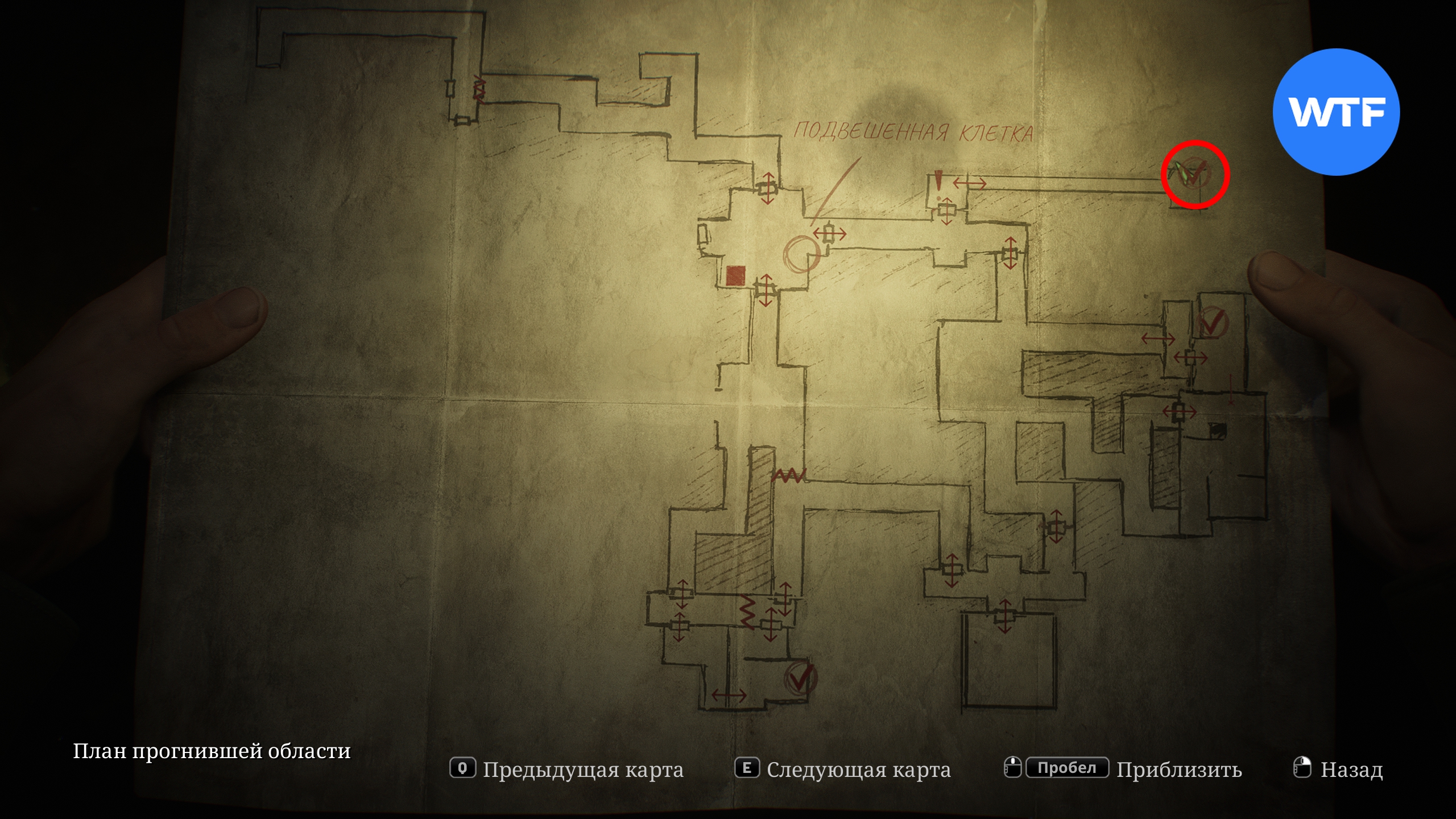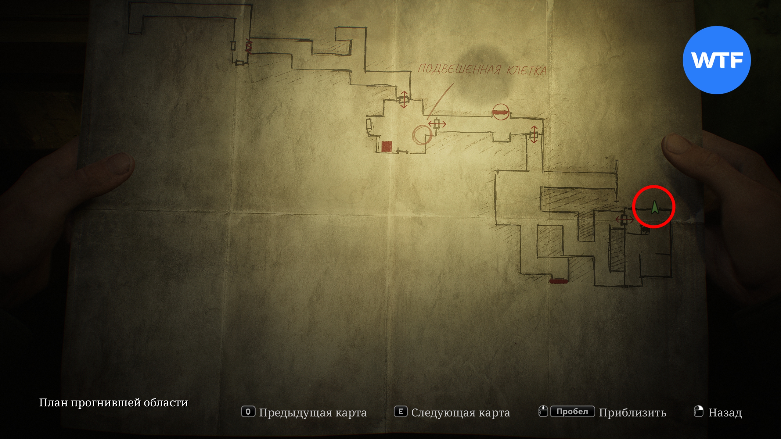 Теперь исследуйте область к югу от подвешенной клетки. Здесь вам нужно найти сразу два предмета. Для начала бегите по коридору на юг до конца и достаньте фитиль для зажигалок из окровавленной дыры в стене.