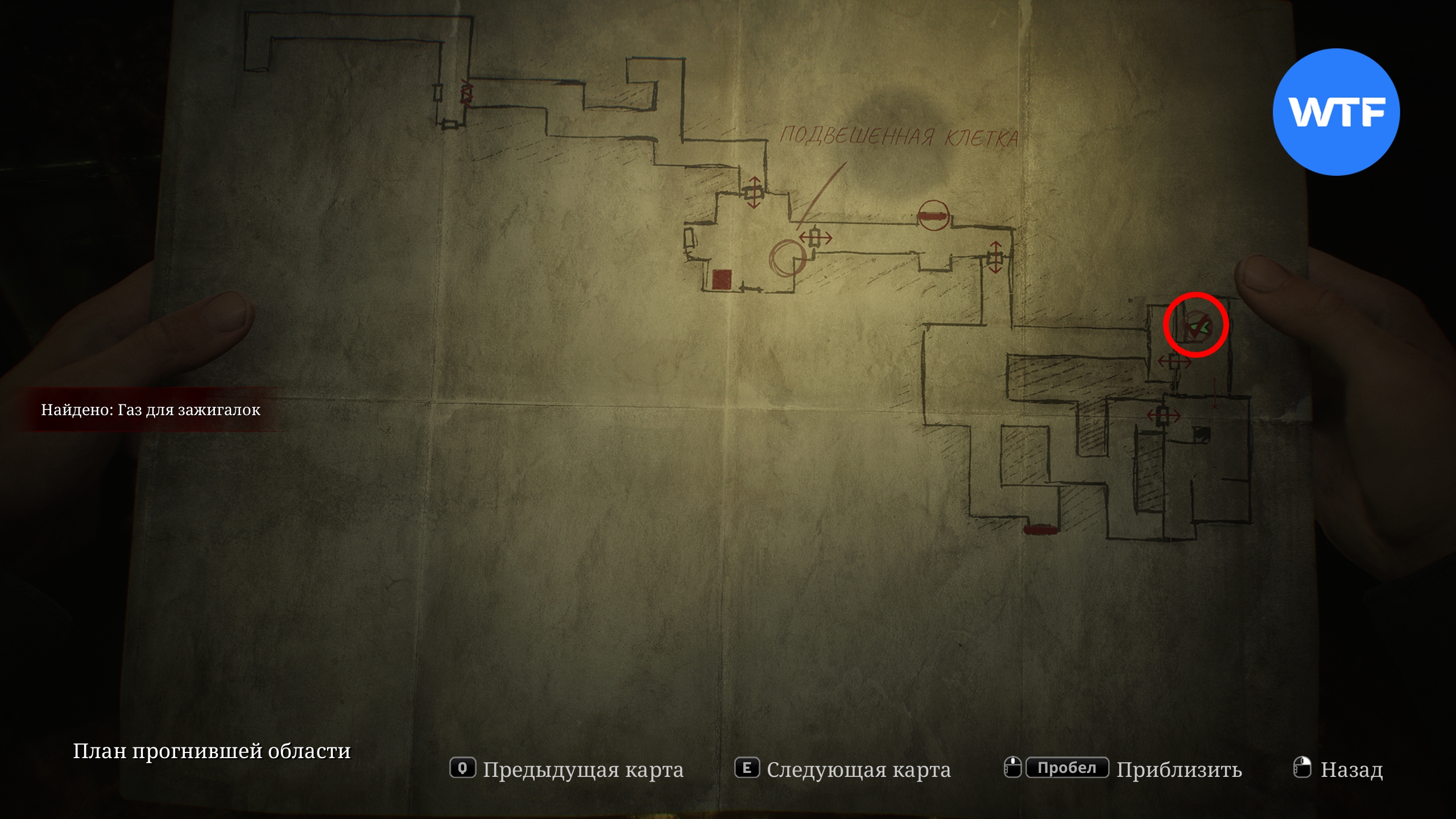 Затем обыщите холодильник на кухне, чтобы найти внутри газ для зажигалок. После этого отодвиньте шкаф в комнате рядом, пролезьте через небольшую дыру в стене и вернитесь к подвешенной клетке.