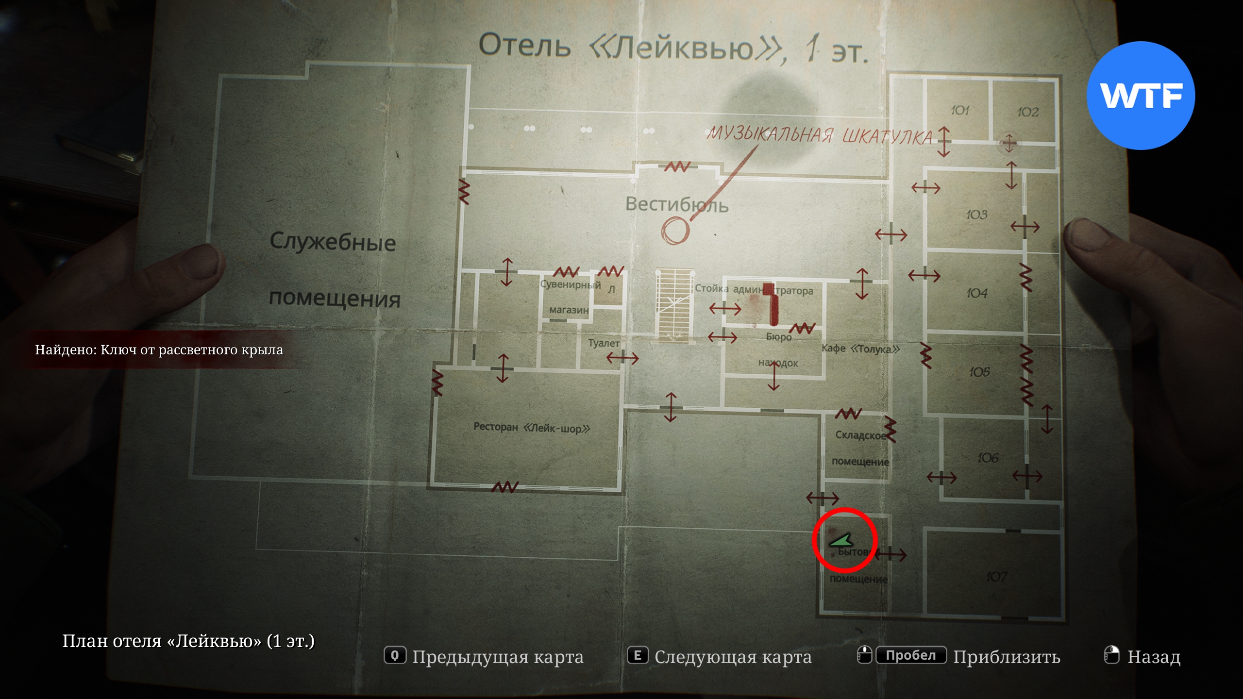 Бегите туда и загляните в бытовое помещение в южной части коридора. Там на столе вы найдете ключ от рассветного крыла — он отпирает вход на второй этаж отеля Лейквью.