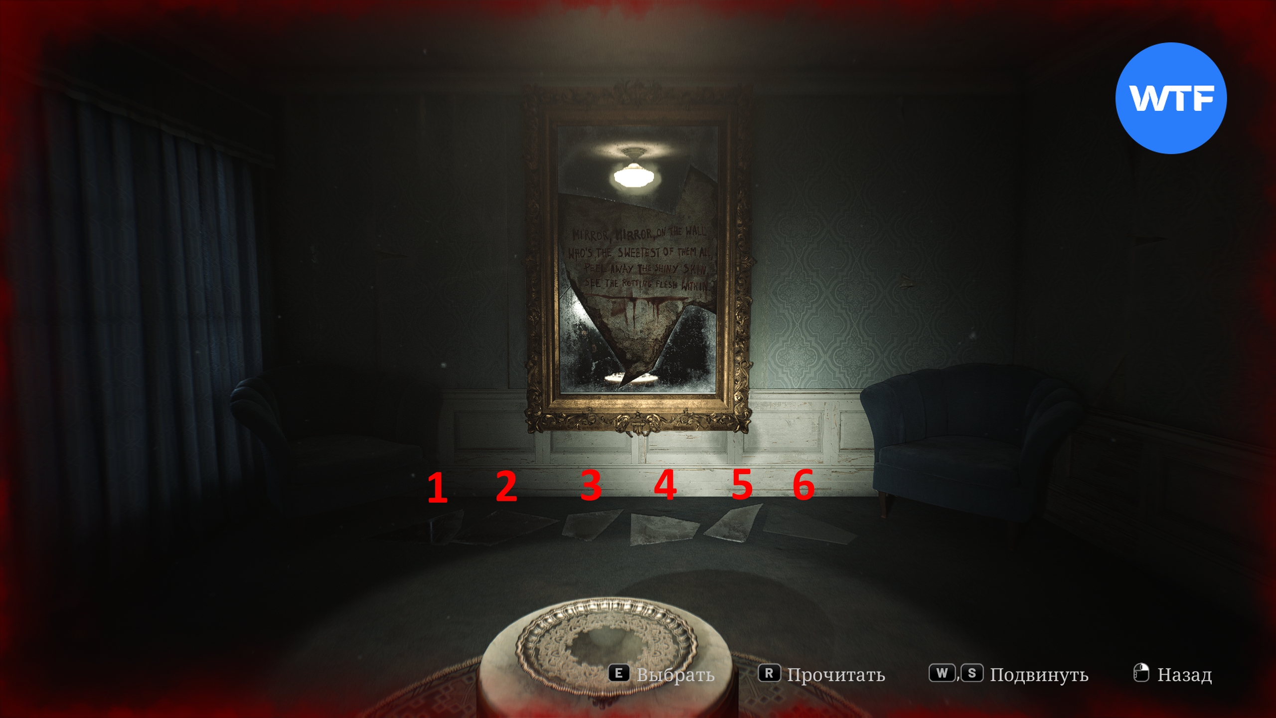 Обратите внимание, что под разбитым зеркалом лежат пять осколков, однако шестого не хватает. Чтобы его найти, загляните в спальню рядом и заберите осколок с кровати.