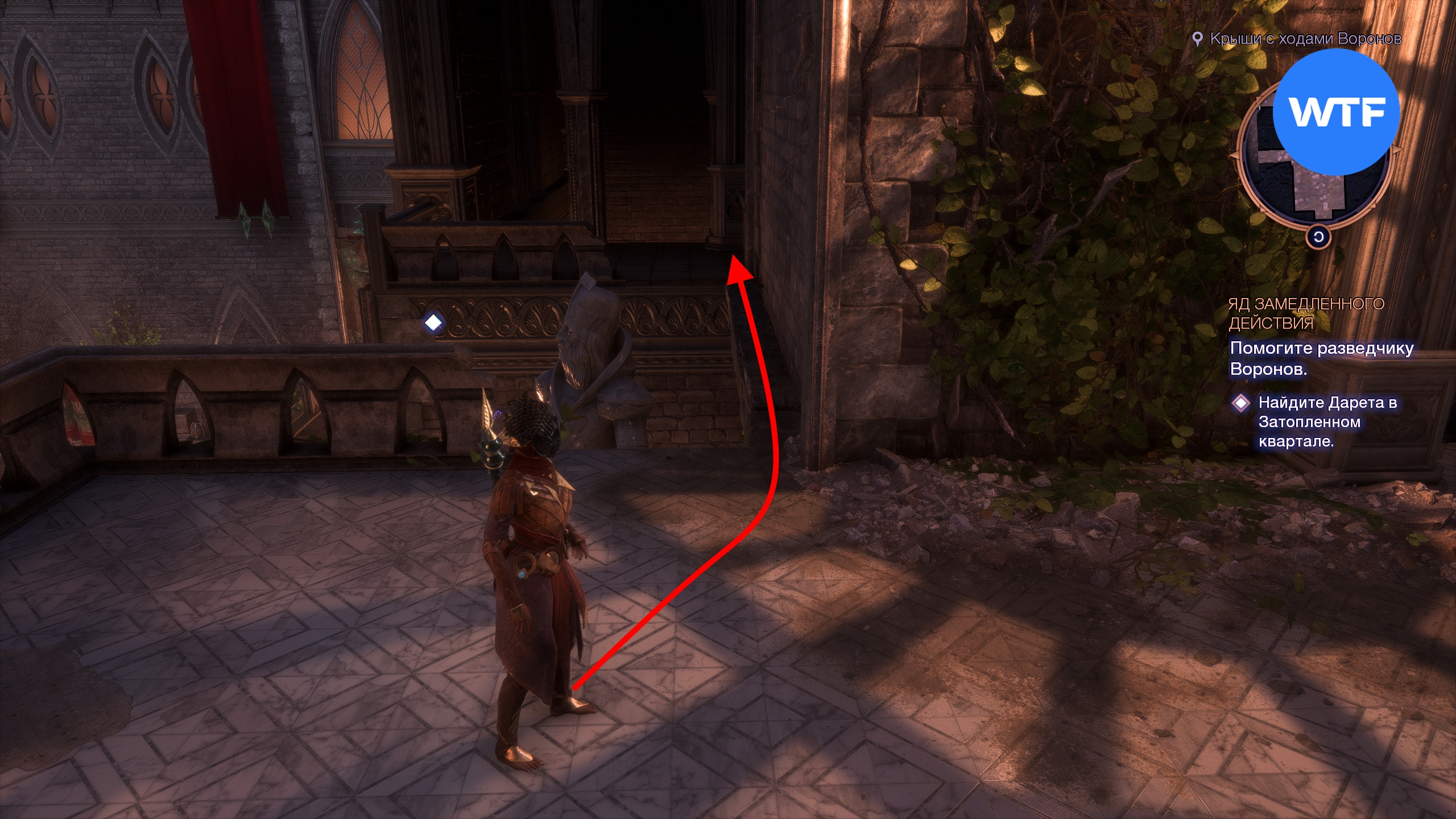 Активируйте её, а затем бегите туда, куда она повернется. На скриншоте 3 в галерее ниже мы отметили место, на которое указывает статуя. Вам нужно разбить ящики под балконом, который подпирают три большие колонны, чтобы найти маленькую статуэтку и получить очко навыков.
