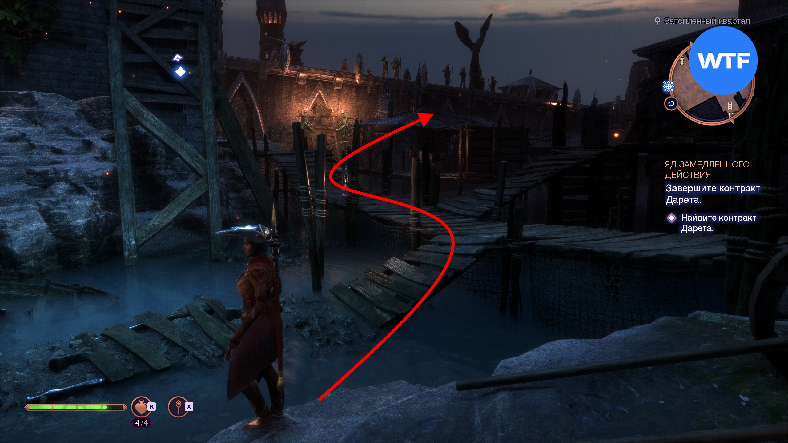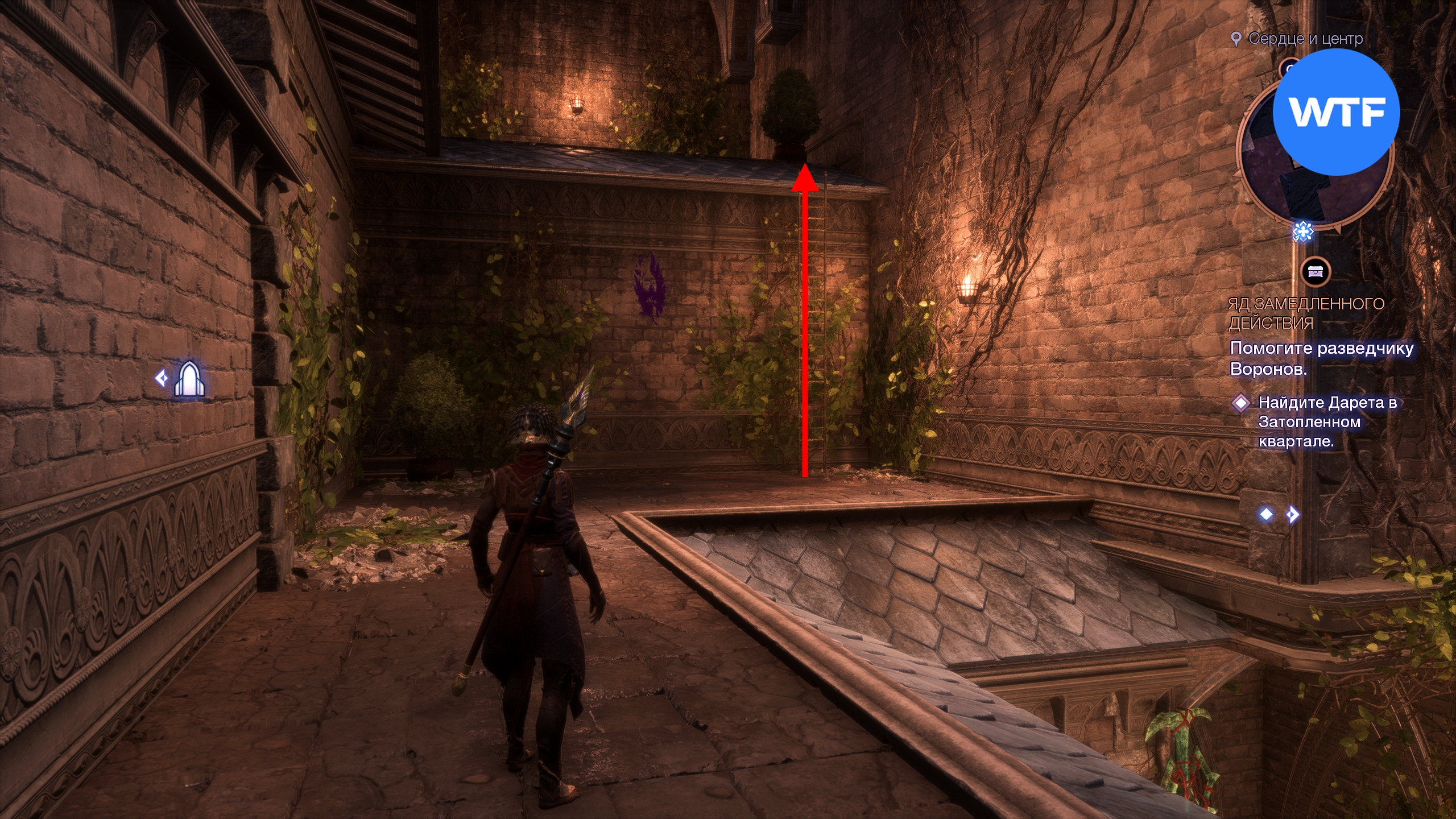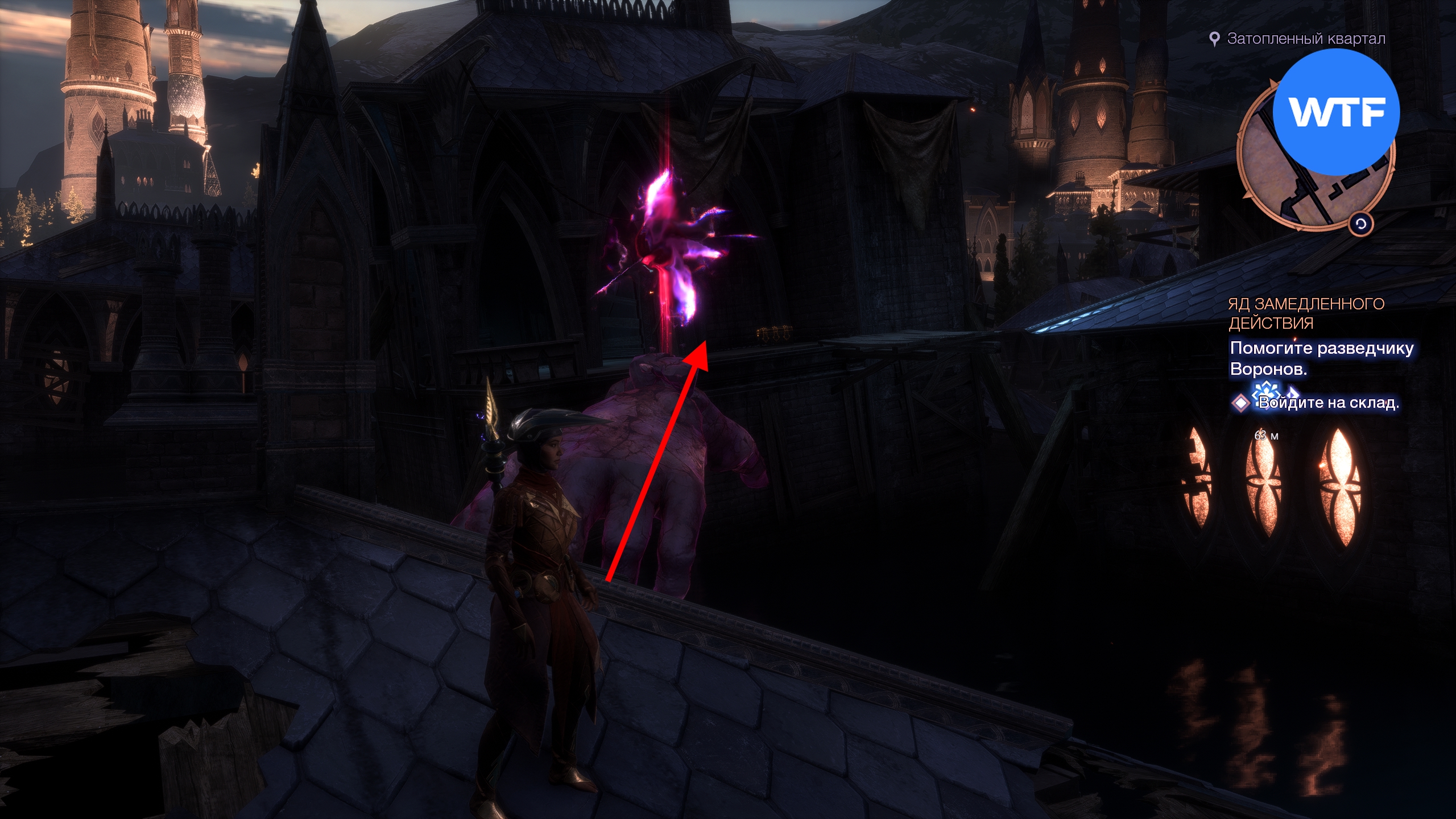 От южного ориентира в Затопленном квартале идите по деревянному помосту налево до второго поворота, а затем забирайтесь на крышу дома справа. Оттуда вы увидите фиолетовую метку, с которой можно взаимодействовать при помощи способностей Луканиса.