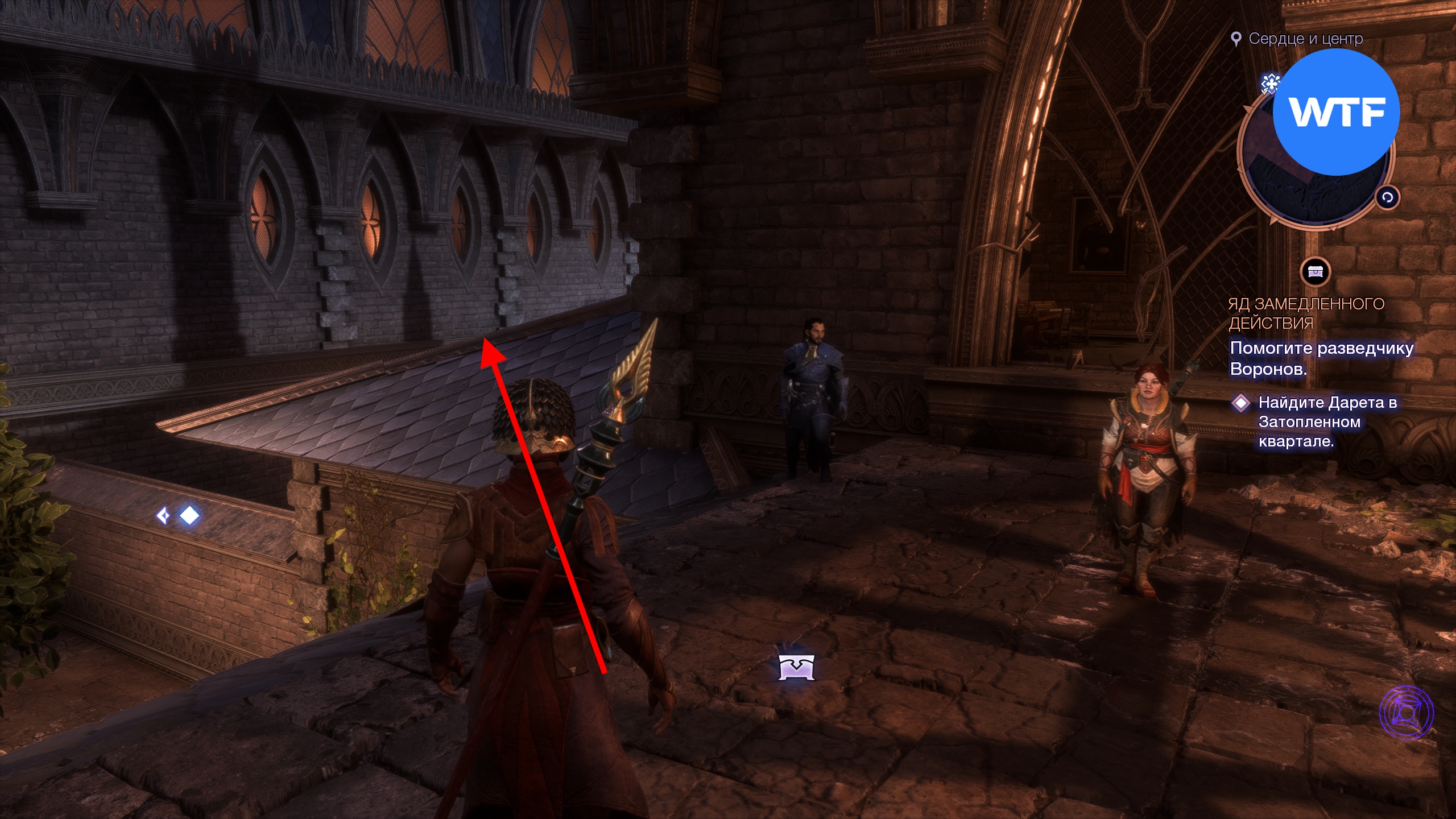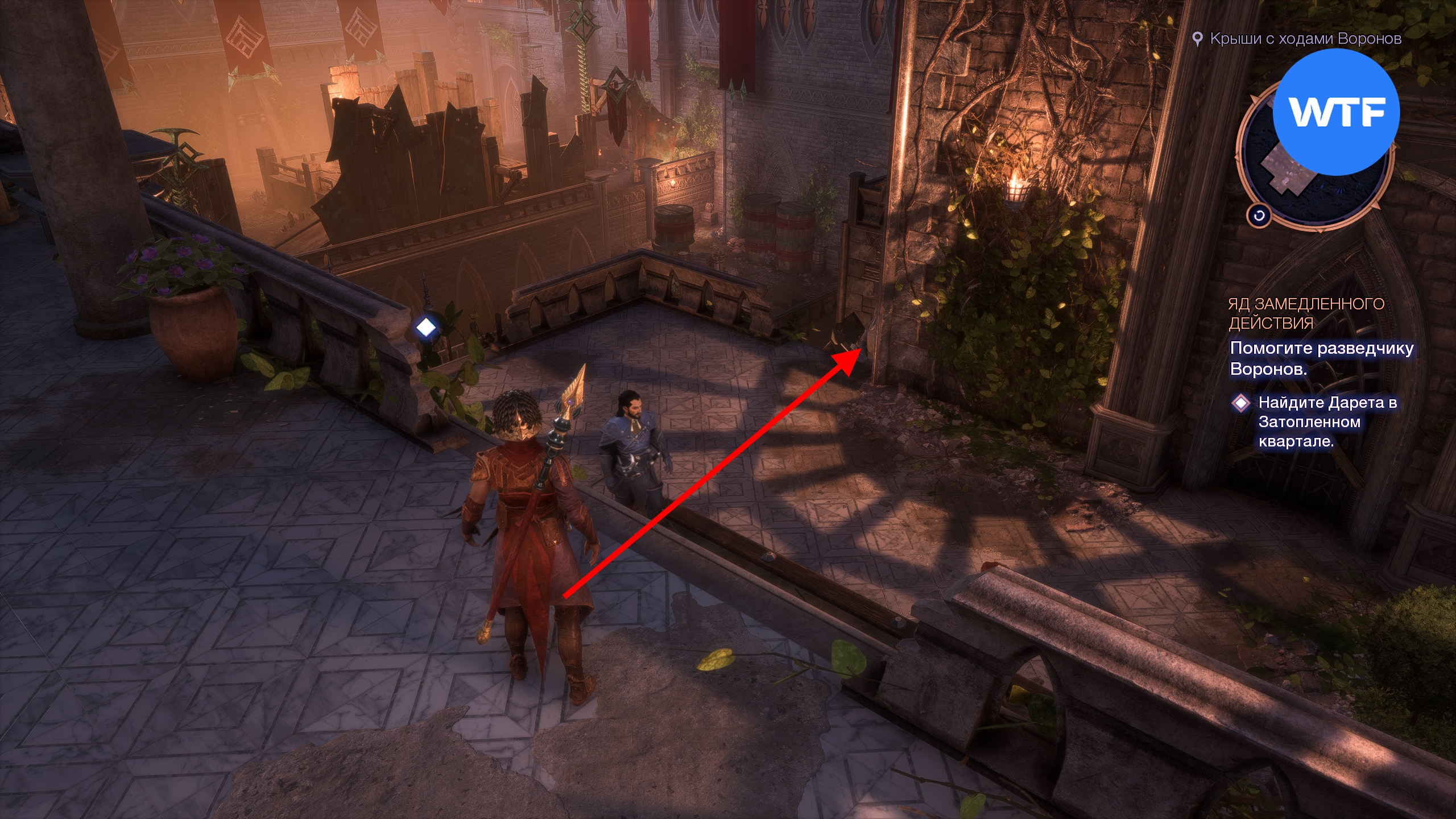 Это позволит вам перебраться на соседнюю крышу по фиолетовой руке. После этого идите по мостику направо и прыгайте вниз через дыру в крыше, чтобы оказаться прямо у этого сундука.