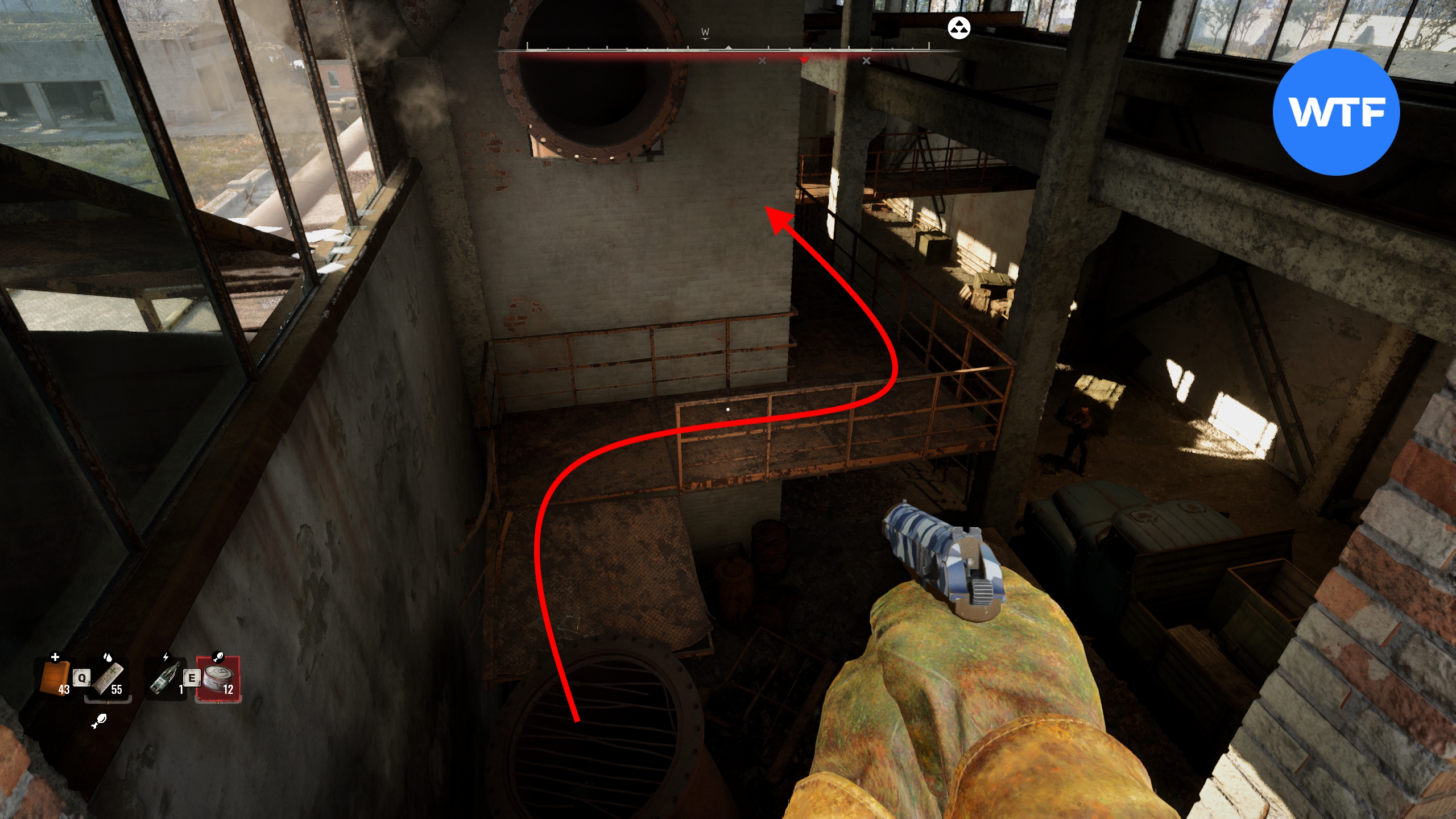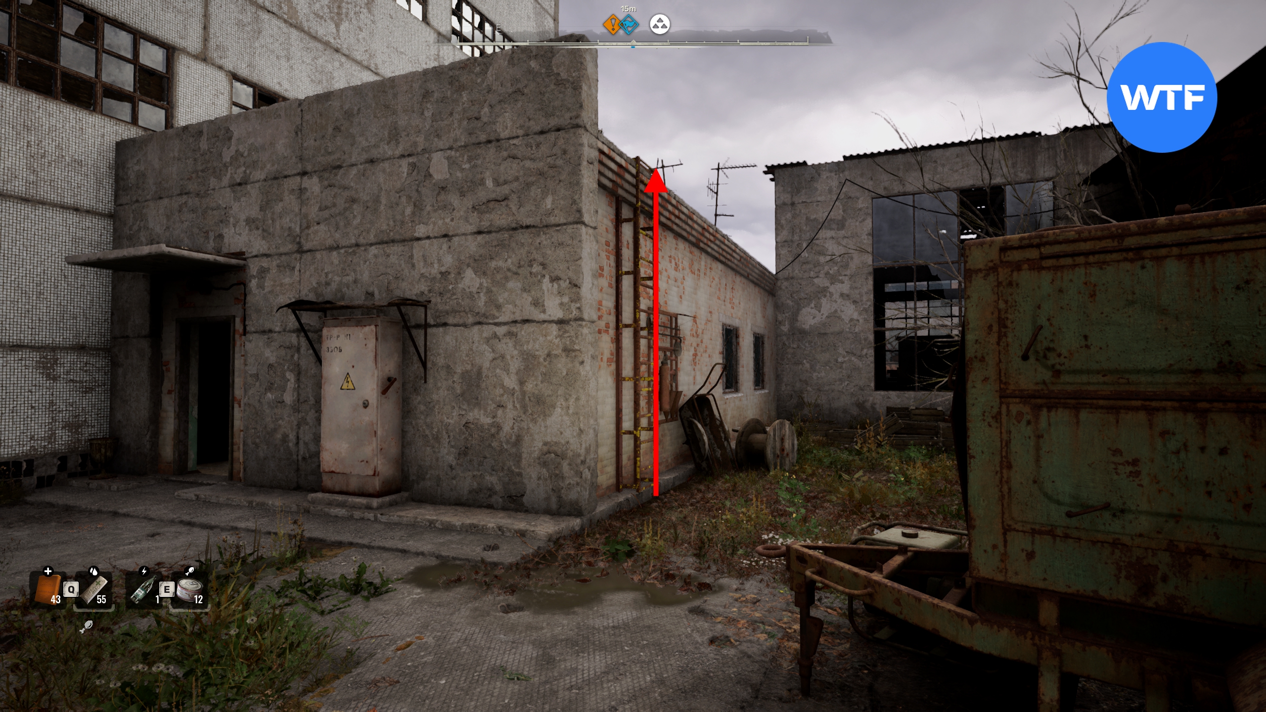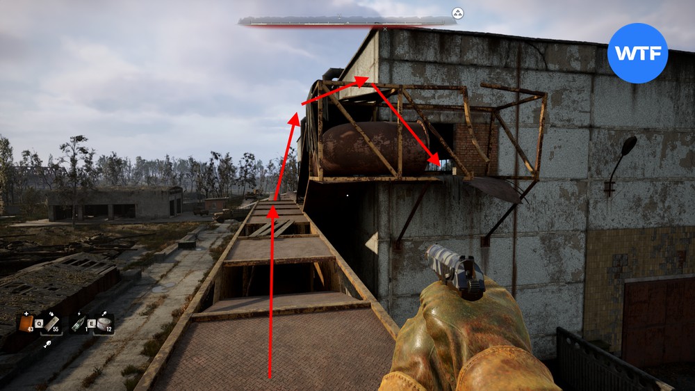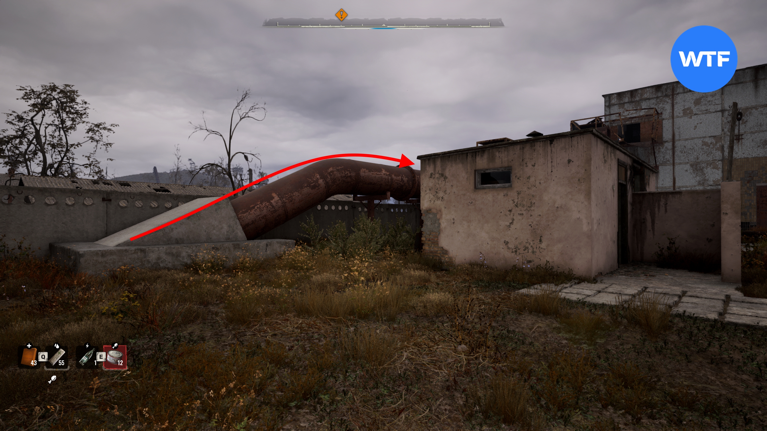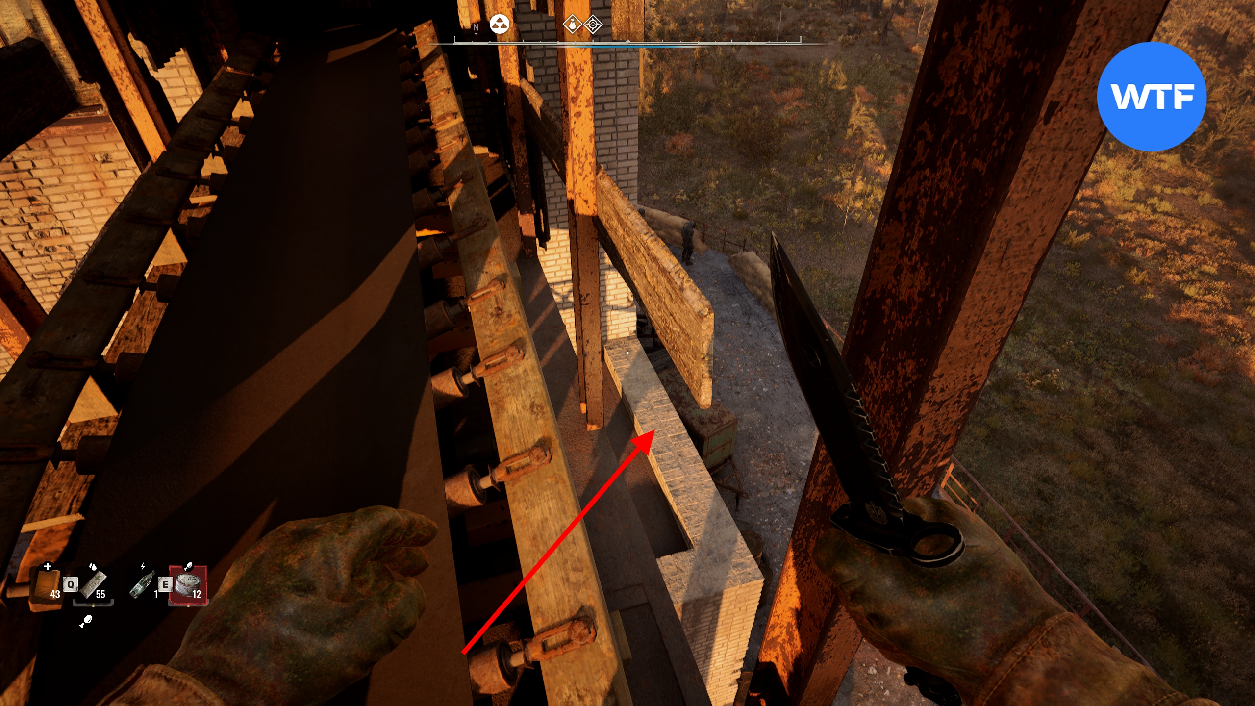 Вам нужно добраться до указанной ниже точки подняться по трубе, идущей к зданию за местным туалетом (см. скриншот 2).