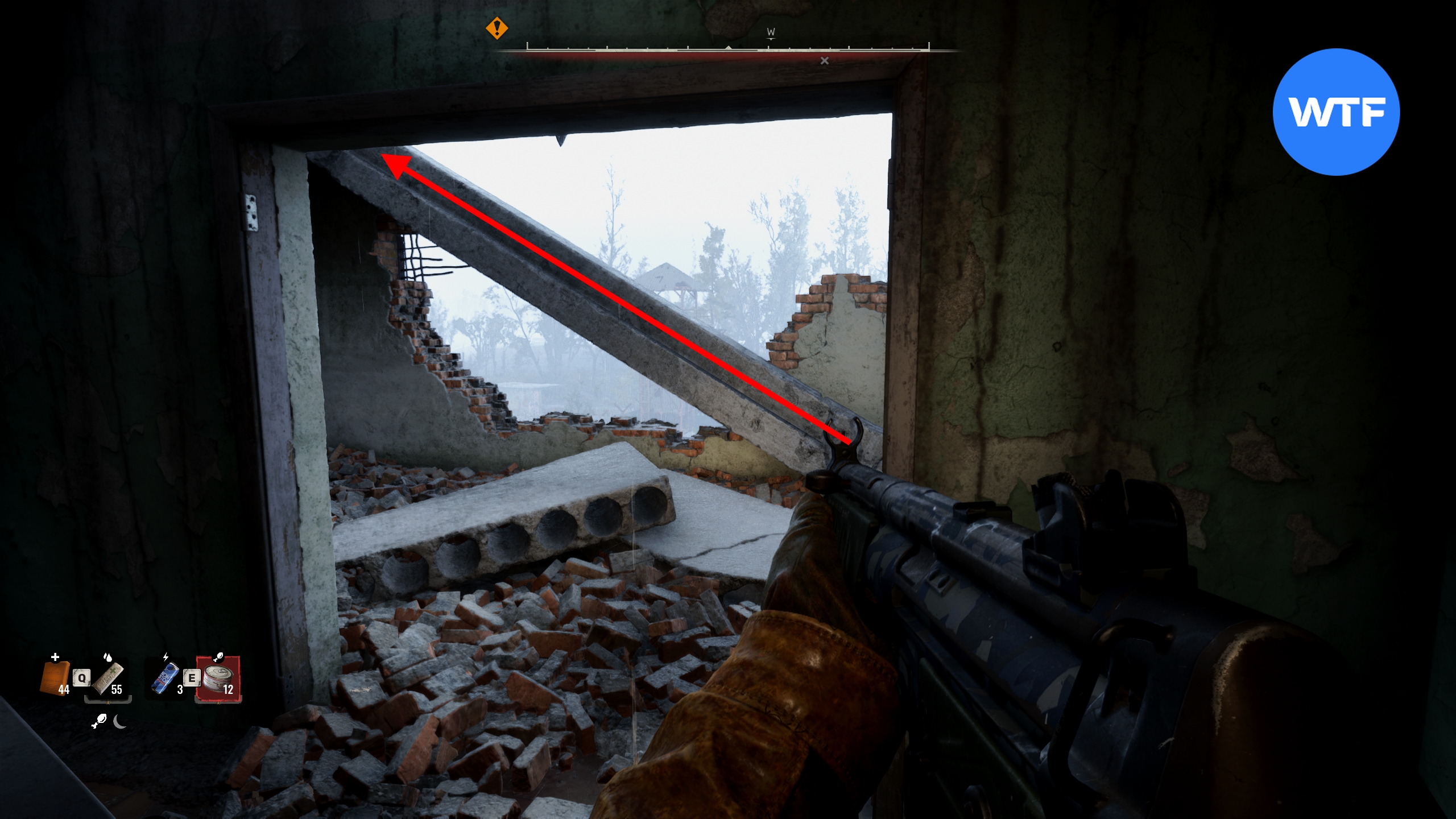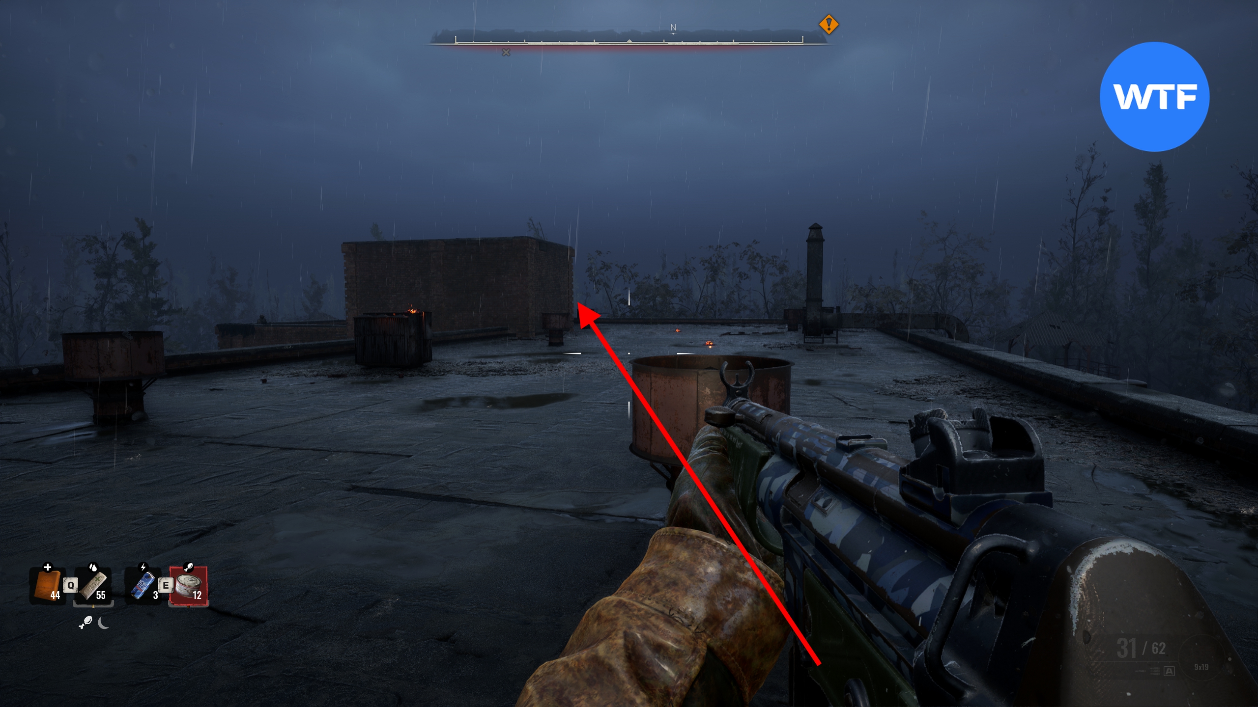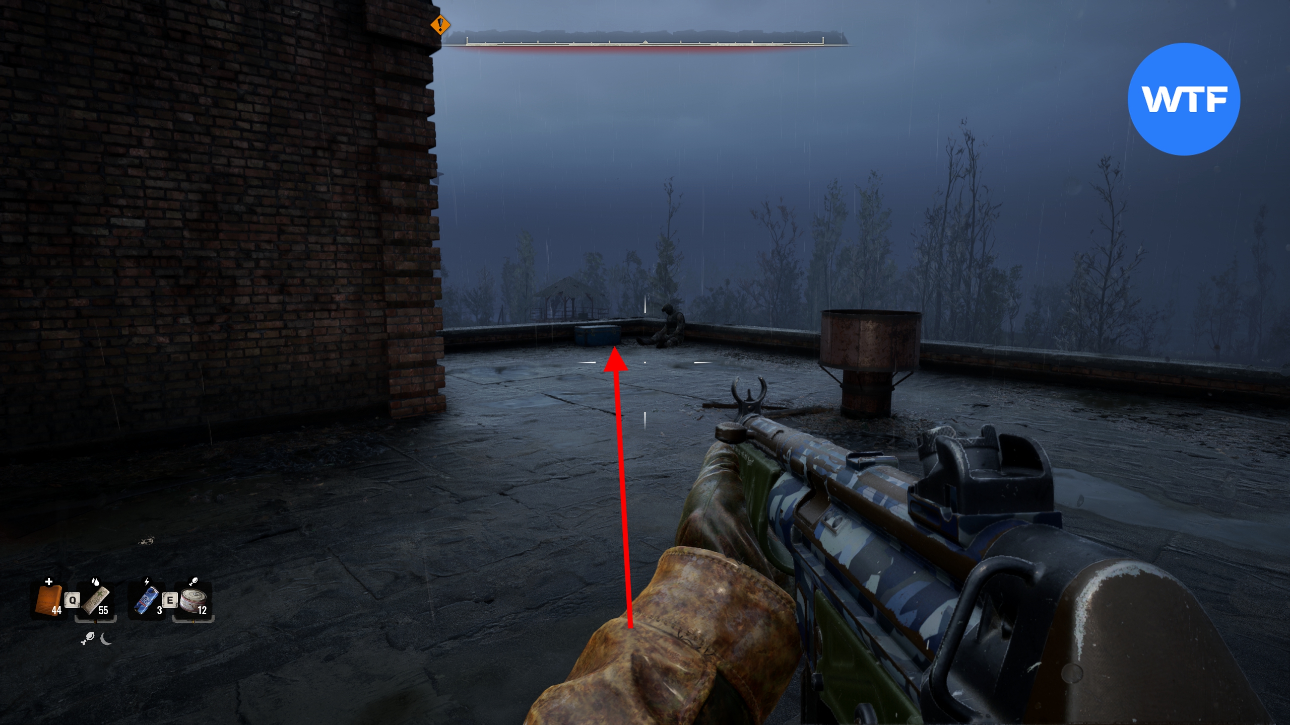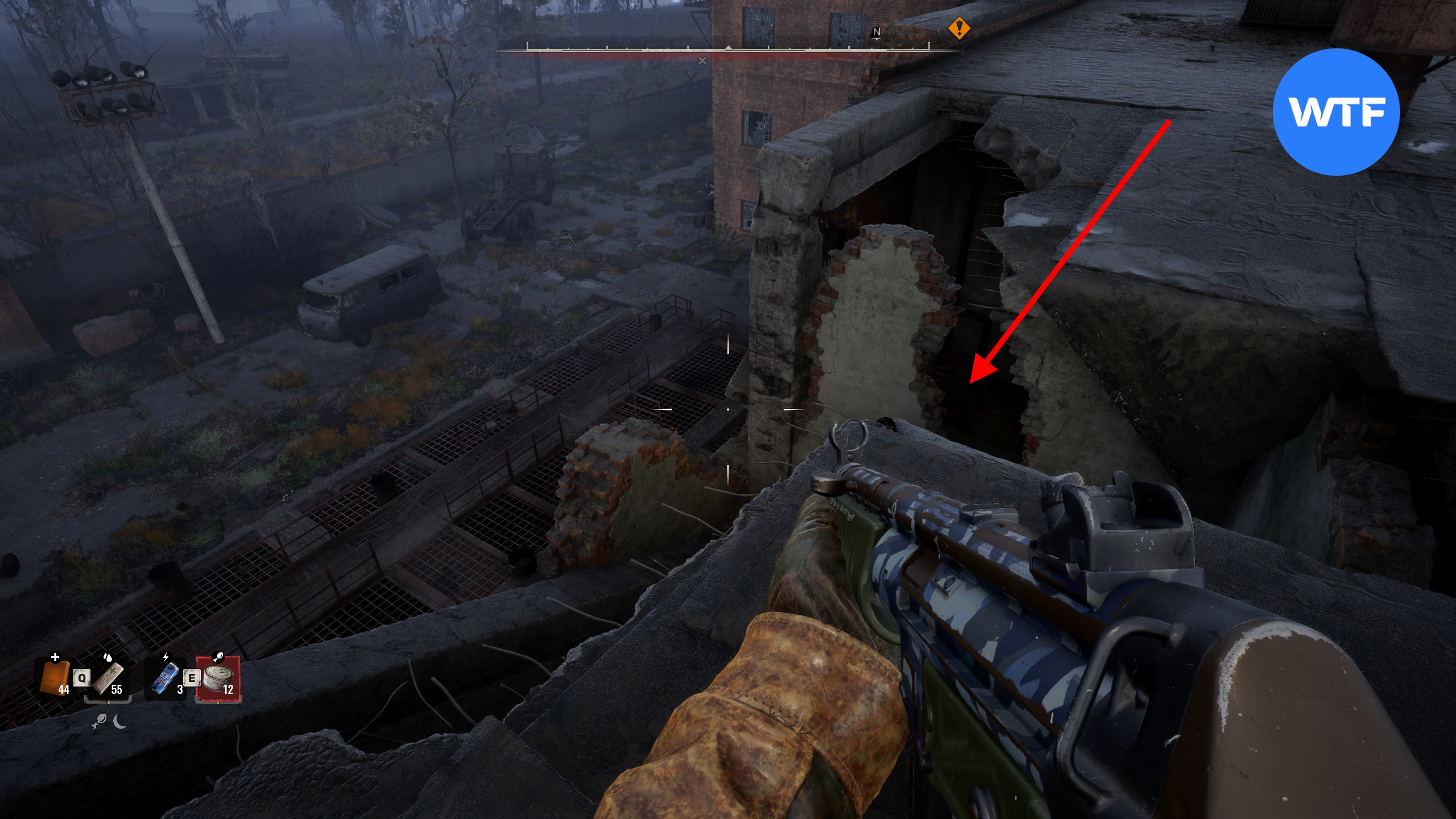 Там вы сможете залезть на бетонную балку и по ней подняться на крышу. Далее бегите вперед до упора и заверните за небольшую кирпичную пристройку слева, чтобы найти тайник возле мертвого тела.