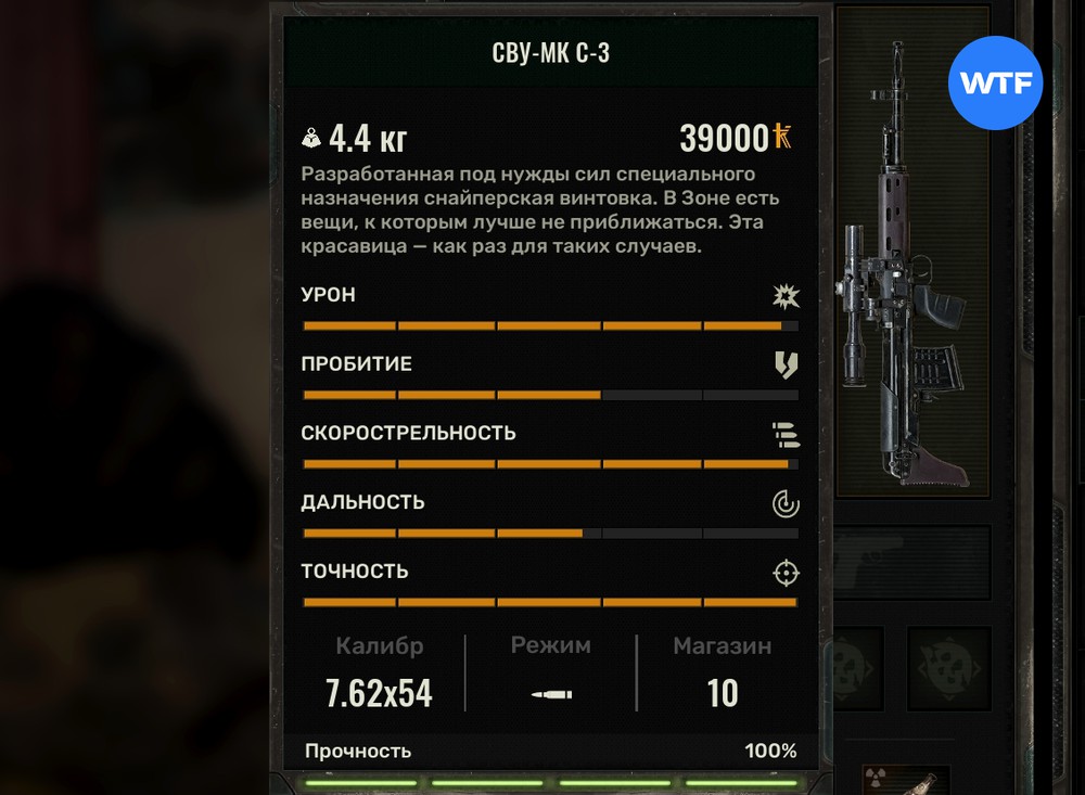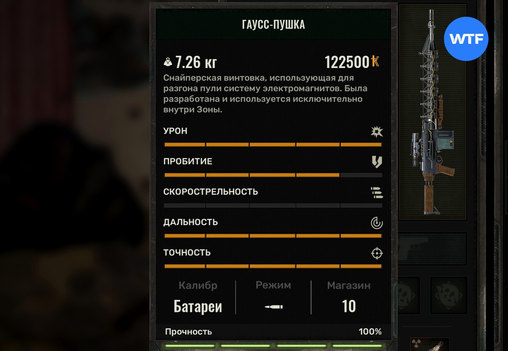 Эндгейм-винтовка класса «один выстрел — один труп» и лучшее оружие в Сталкер 2 в своем классе. У Гаусс-пушки нет никаких улучшений и почти нет модификаций (только увеличенный магазин), она обладает крайне низкой скорострельностью, но эти недостатки компенсируются гигантской убойной силой и невероятной точностью.