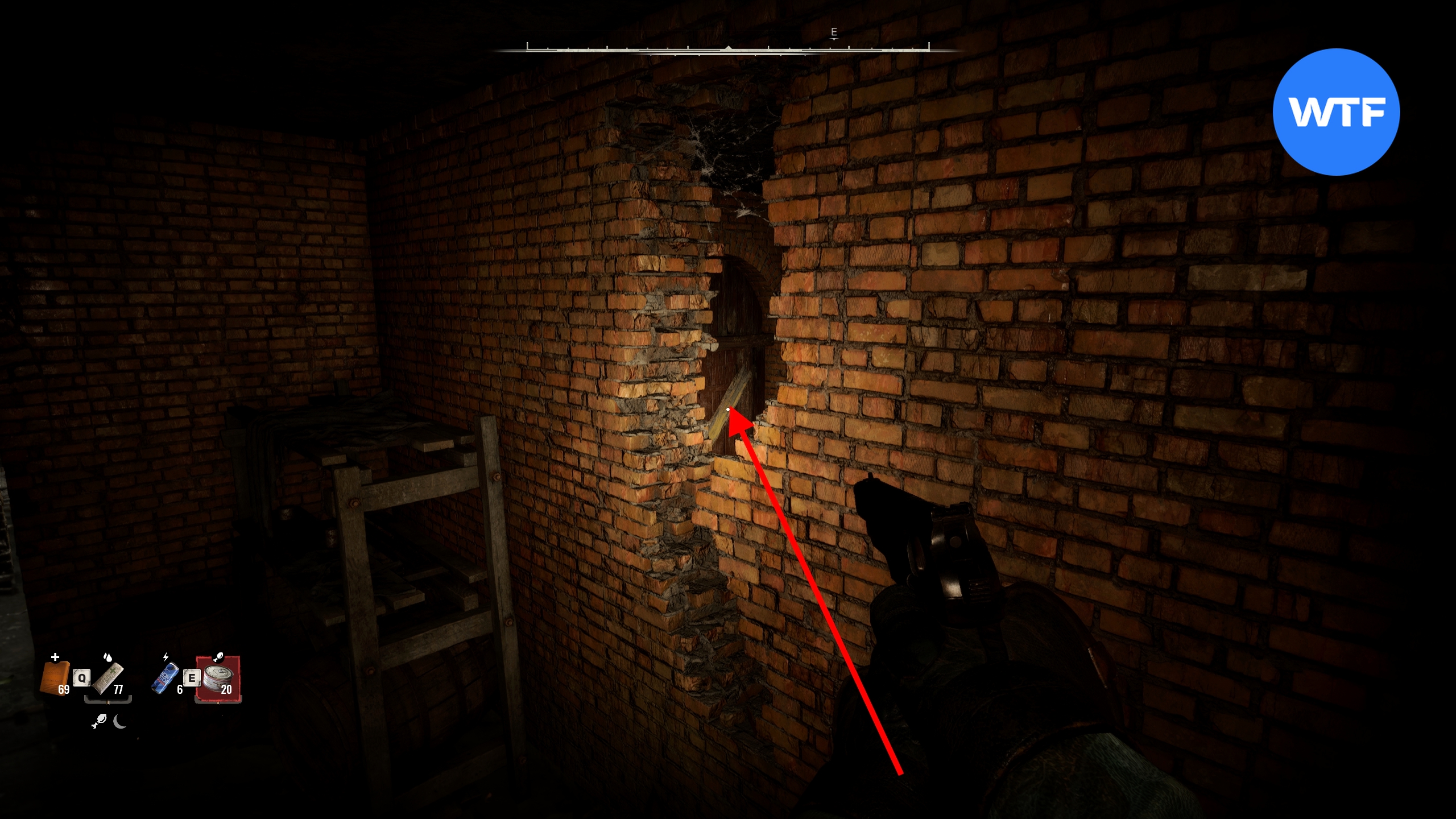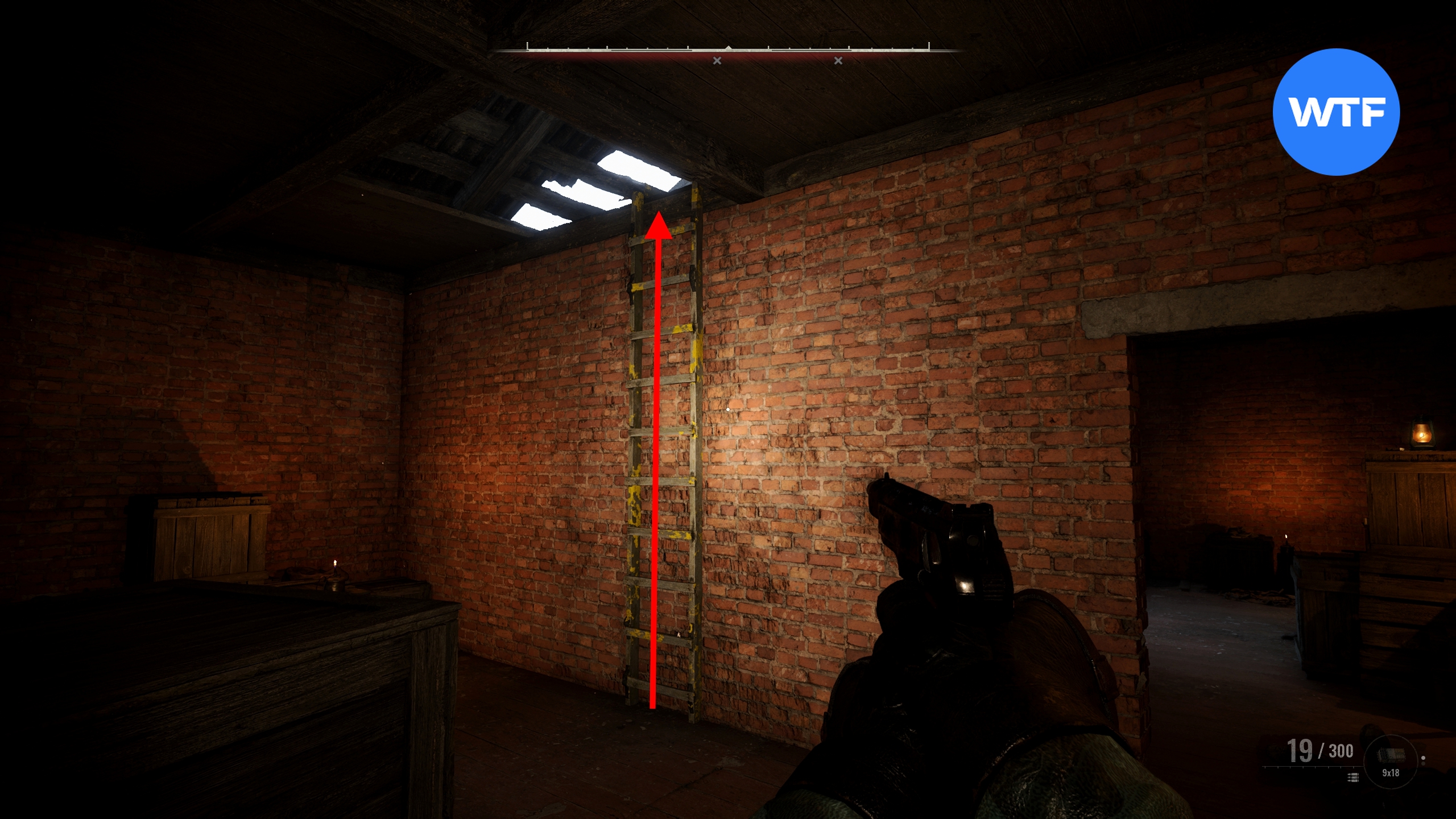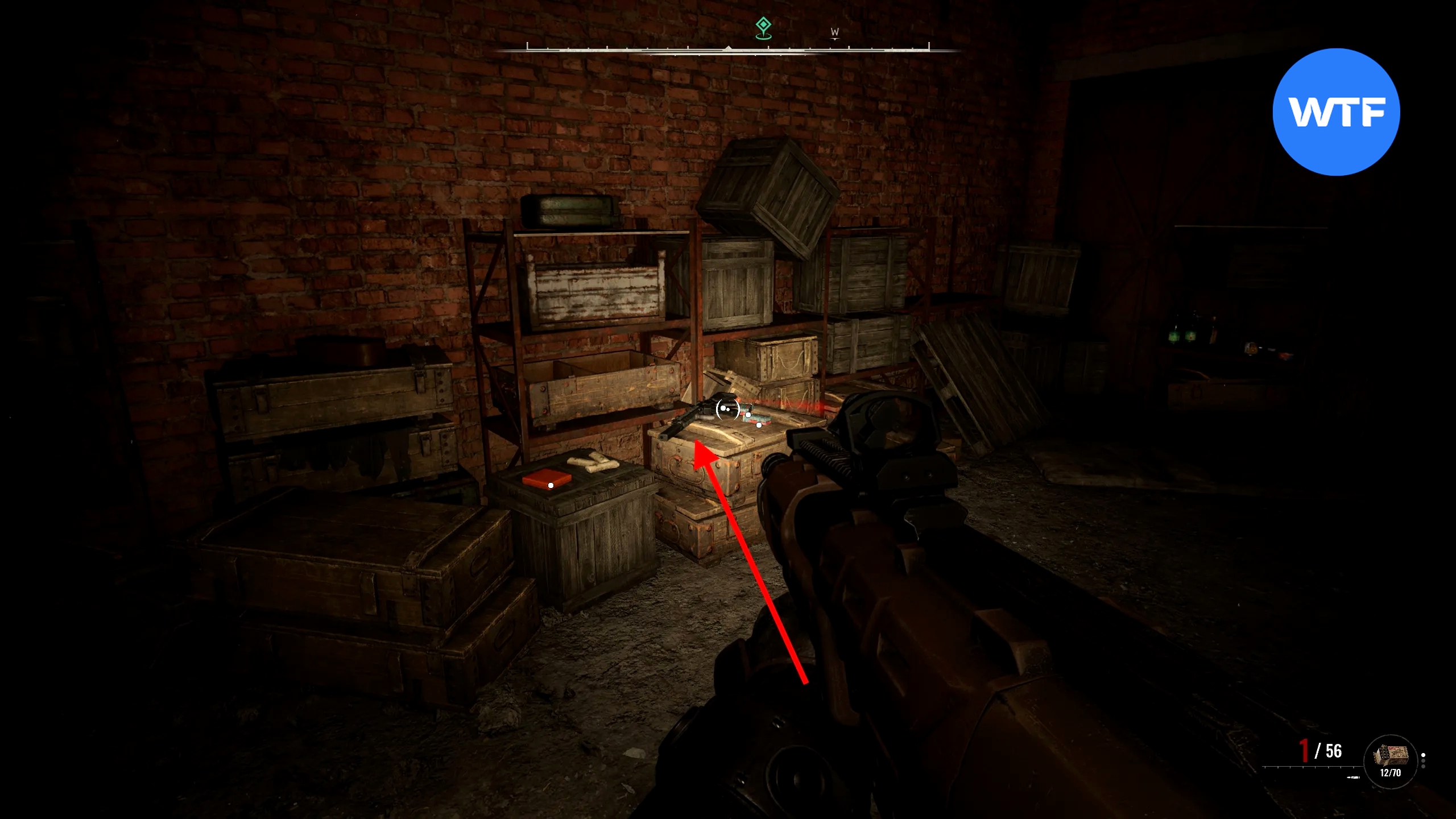 Вам нужно спрыгнуть в дыру в земле в северо-западном углу локации (см. скриншот 2). Затем бегите налево и поднимайтесь наверх по стеллажам. Выстрелите в желтую балку через дыру в стене, затем идите к открывшейся двери и заберите свою добычу со стола слева.
