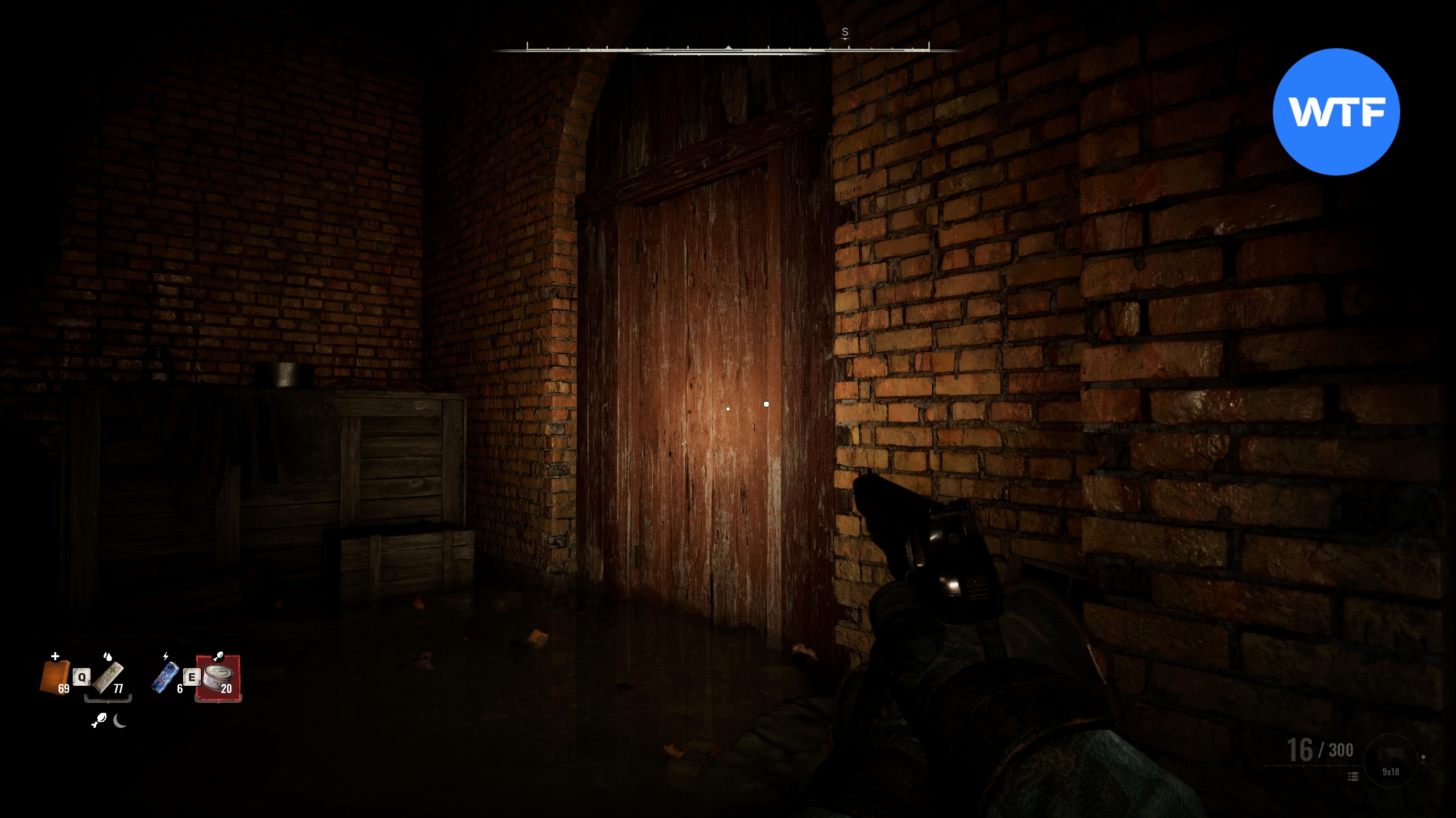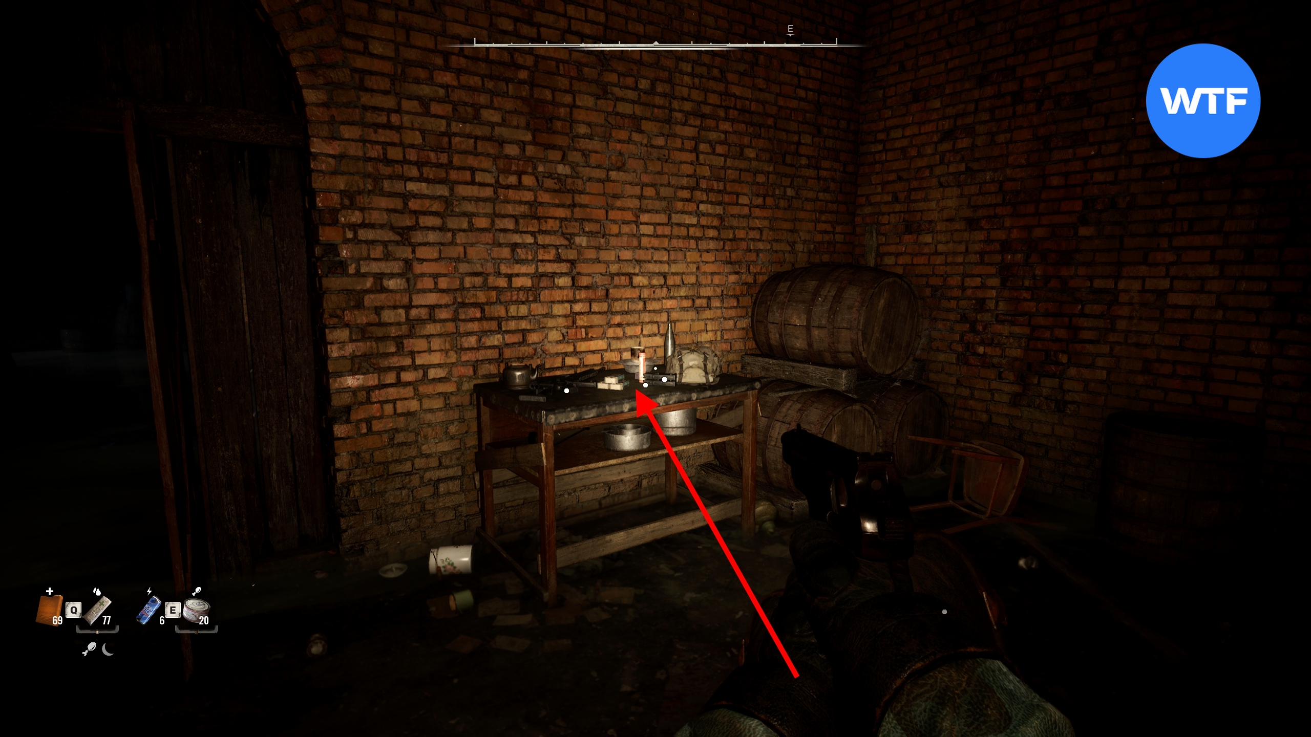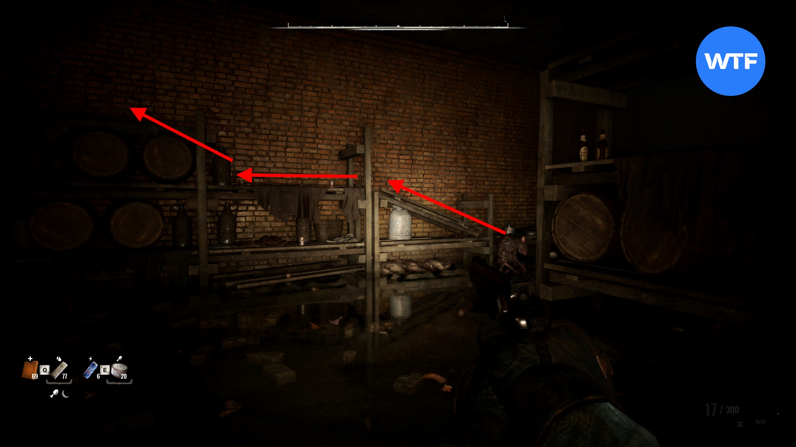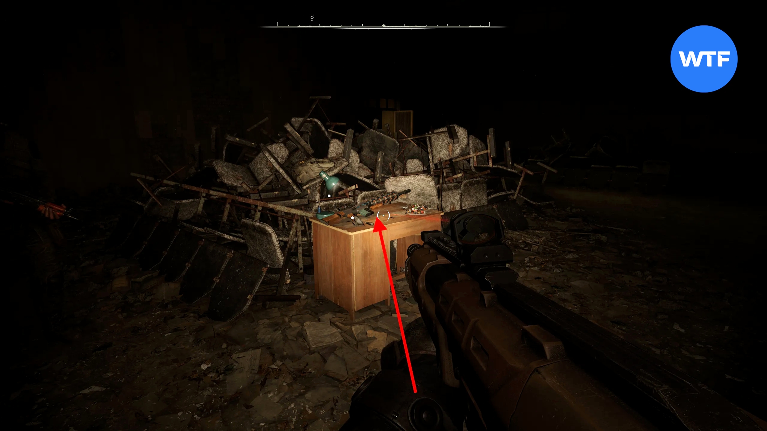 Вам нужно спрыгнуть в дыру в земле в северо-западном углу локации (см. скриншот 2). Затем бегите налево и поднимайтесь наверх по стеллажам. Выстрелите в желтую балку через дыру в стене, затем идите к открывшейся двери и заберите свою добычу со стола слева.
