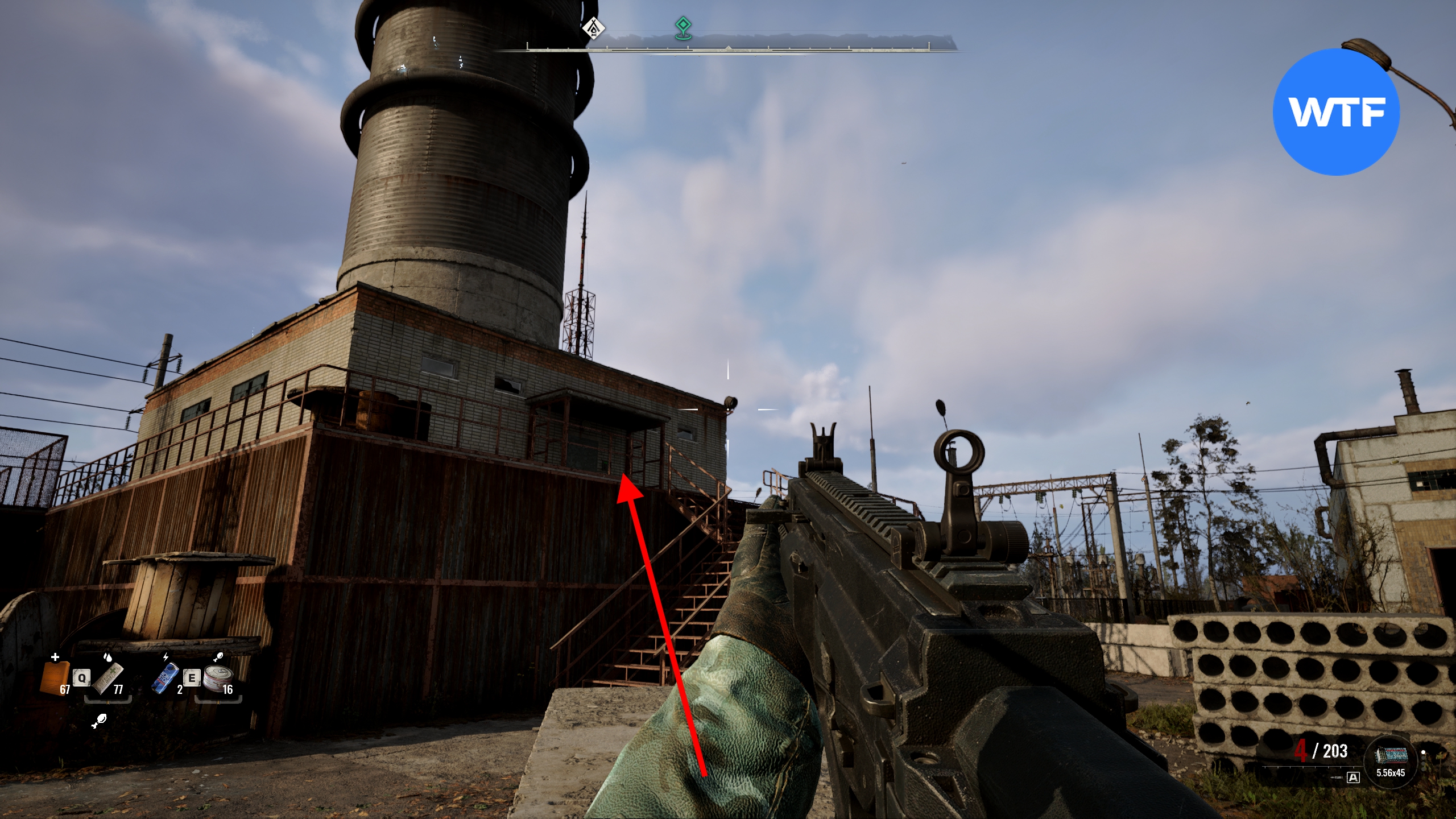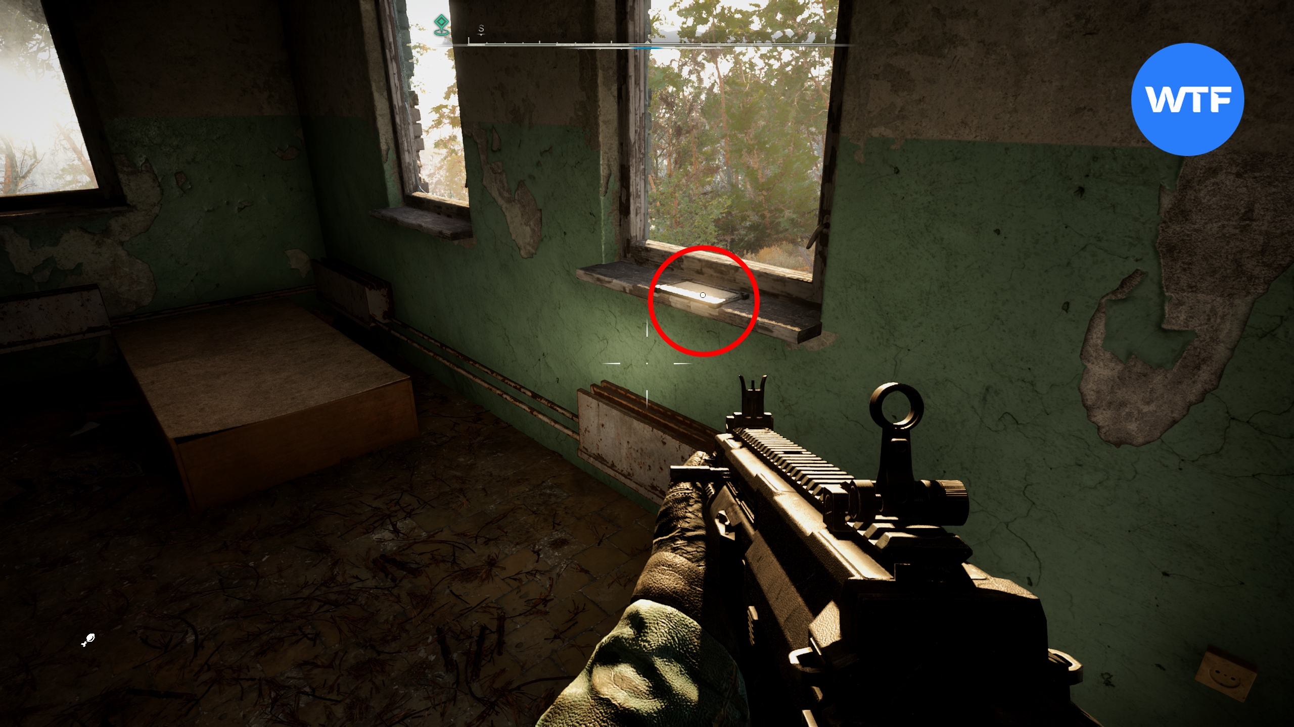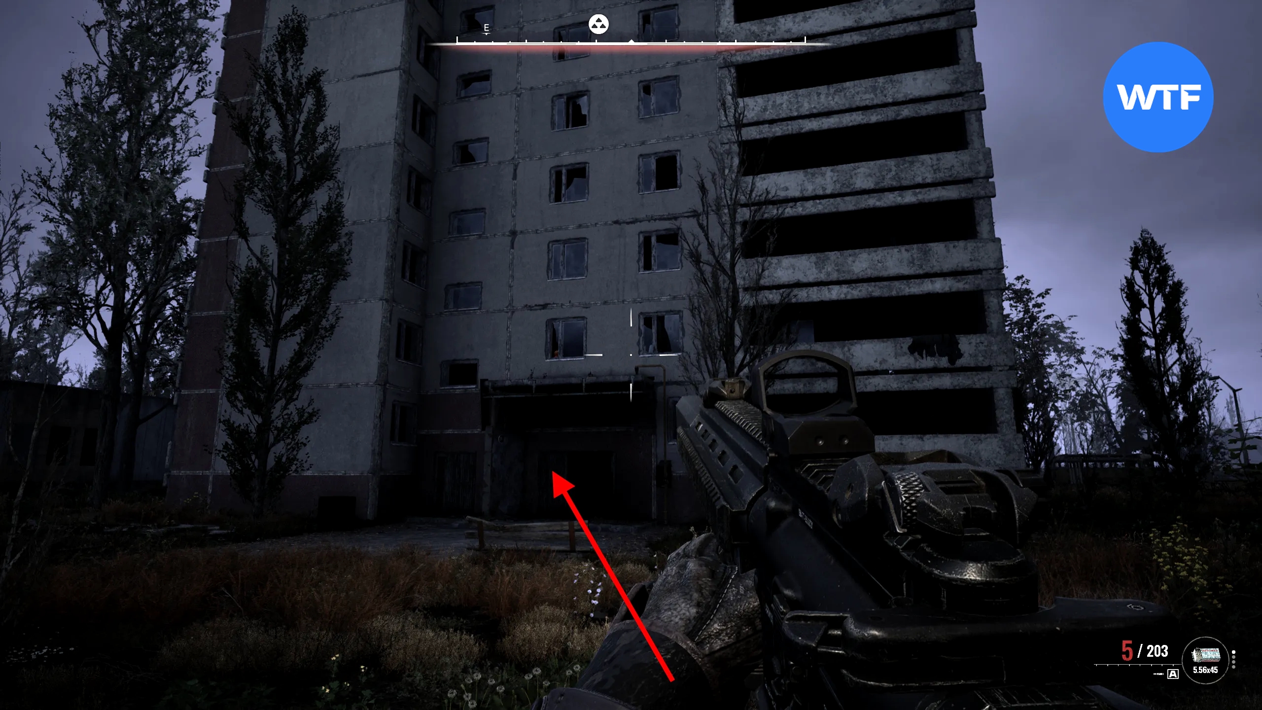Если подняться на предпоследний этаж многоэтажки к юго-западу от магазина «Книги», можно найти там запертую дверь. Чтобы её открыть, введите код 2021. В тайнике на балконе лежит снайперская винтовка «Зверолов», дробовик «Маргач Д-12МТ», экзоскелет ПСЗ-21W «Штурм» и патроны.