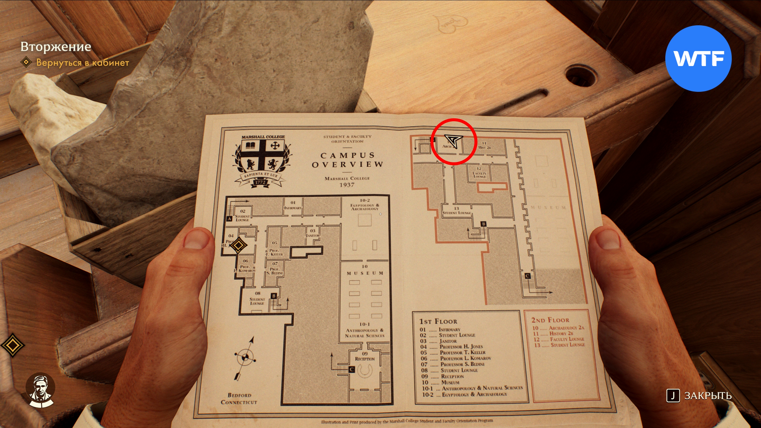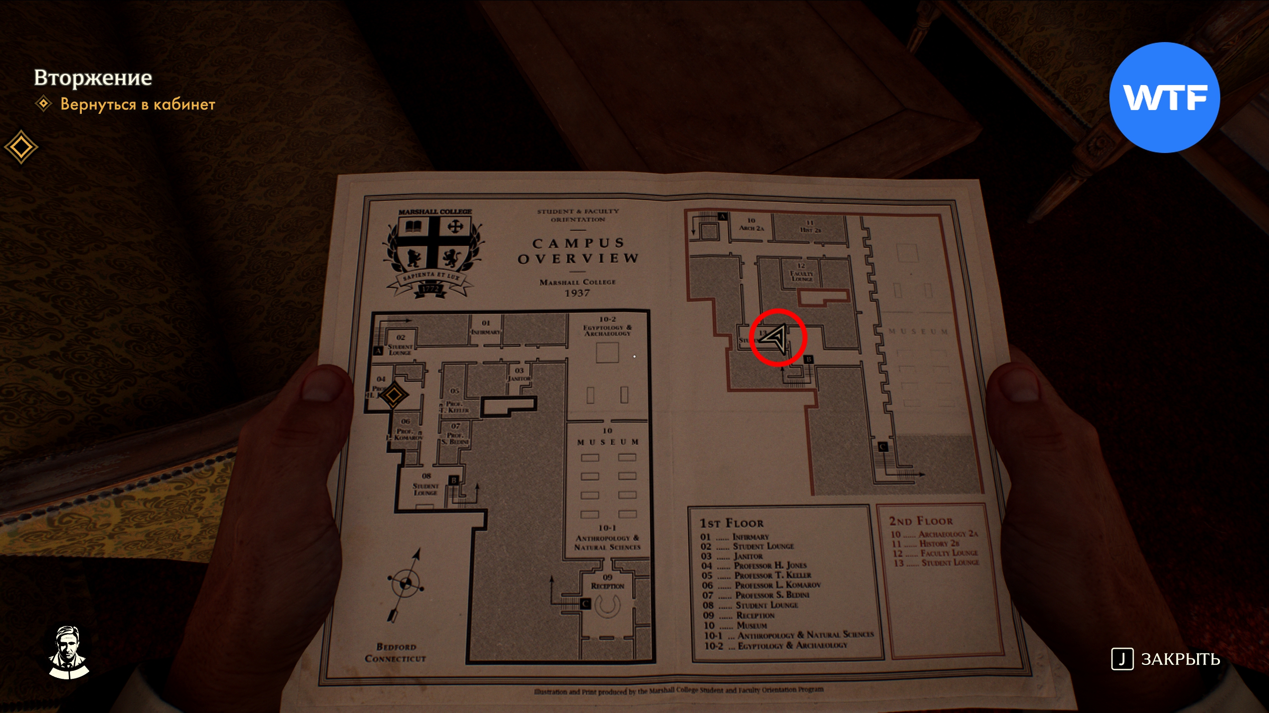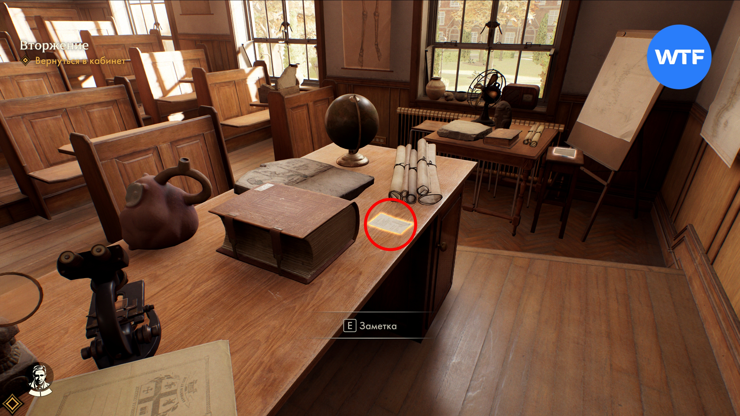 Продолжайте исследовать второй этаж и доберитесь до лекционной аудитории с табличкой Arch 2A. Заметки о мумии кошки будут лежать прямо на столе преподавателя.