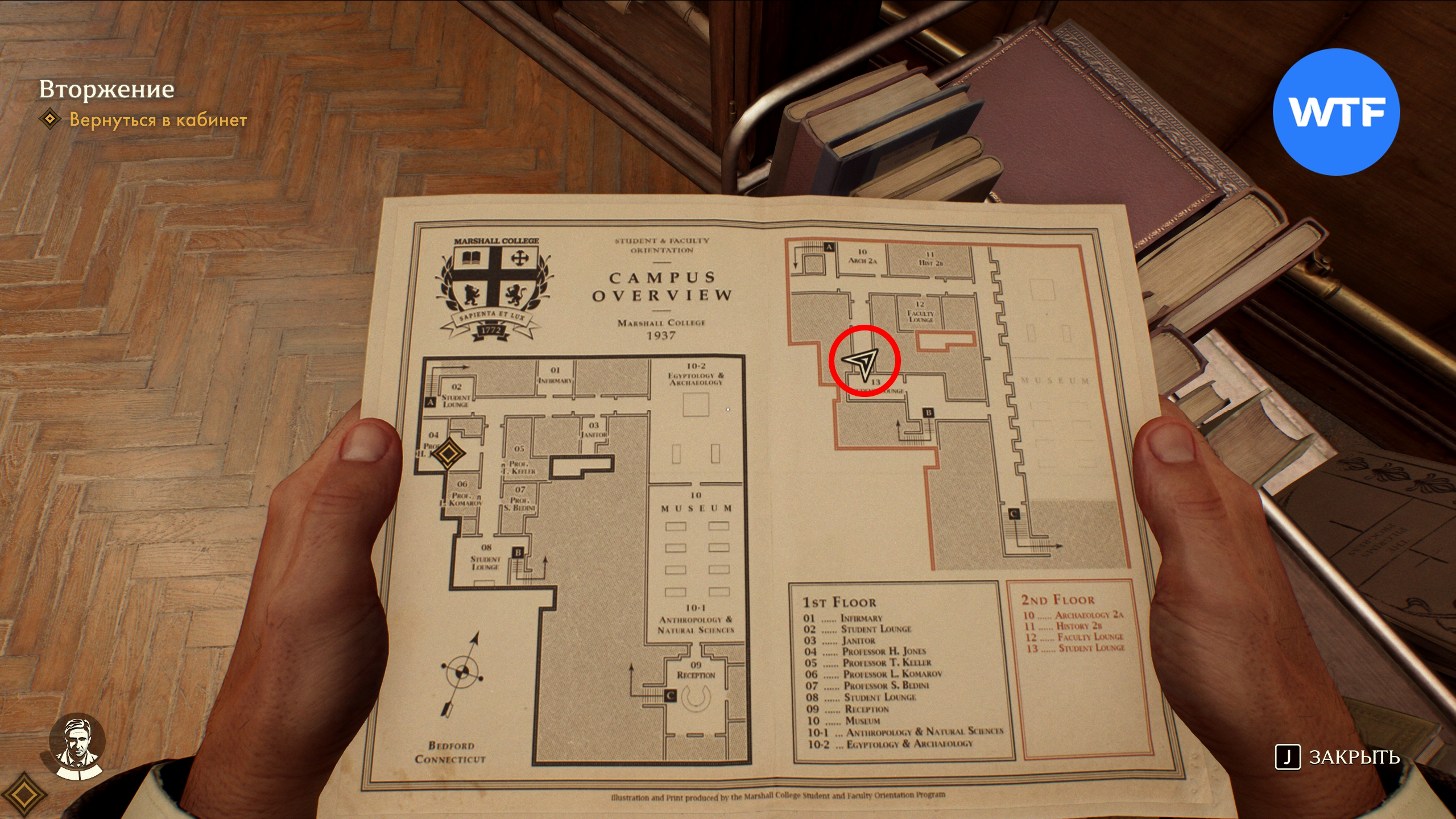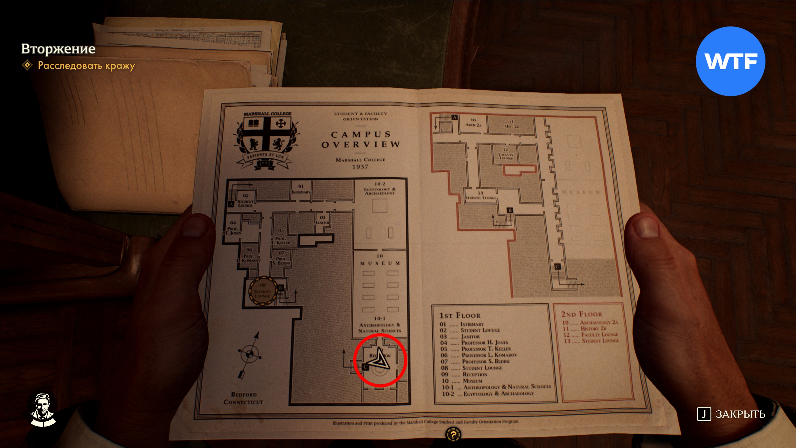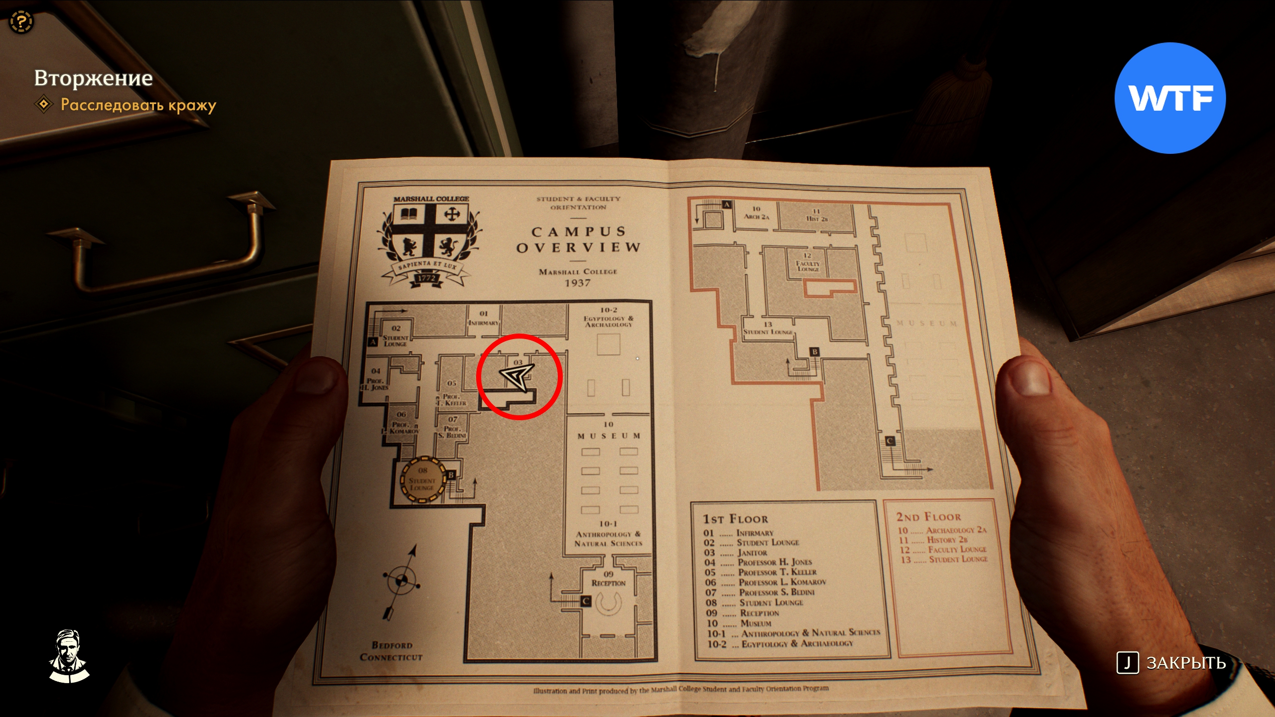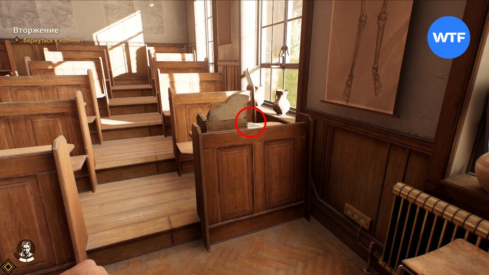 Продолжайте исследовать второй этаж и доберитесь до лекционной аудитории с табличкой Arch 2A. Заметки о мумии кошки будут лежать прямо на столе преподавателя.