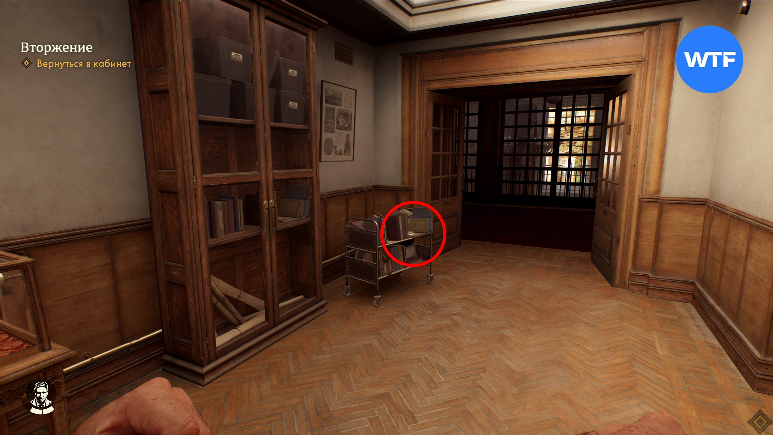 Прежде чем вернуться в свой кабинет по сюжету, поднимитесь наверх по лестнице А и идите по коридору направо. Там вы сможете забрать бейсбольную карточку с тележки с книгами.