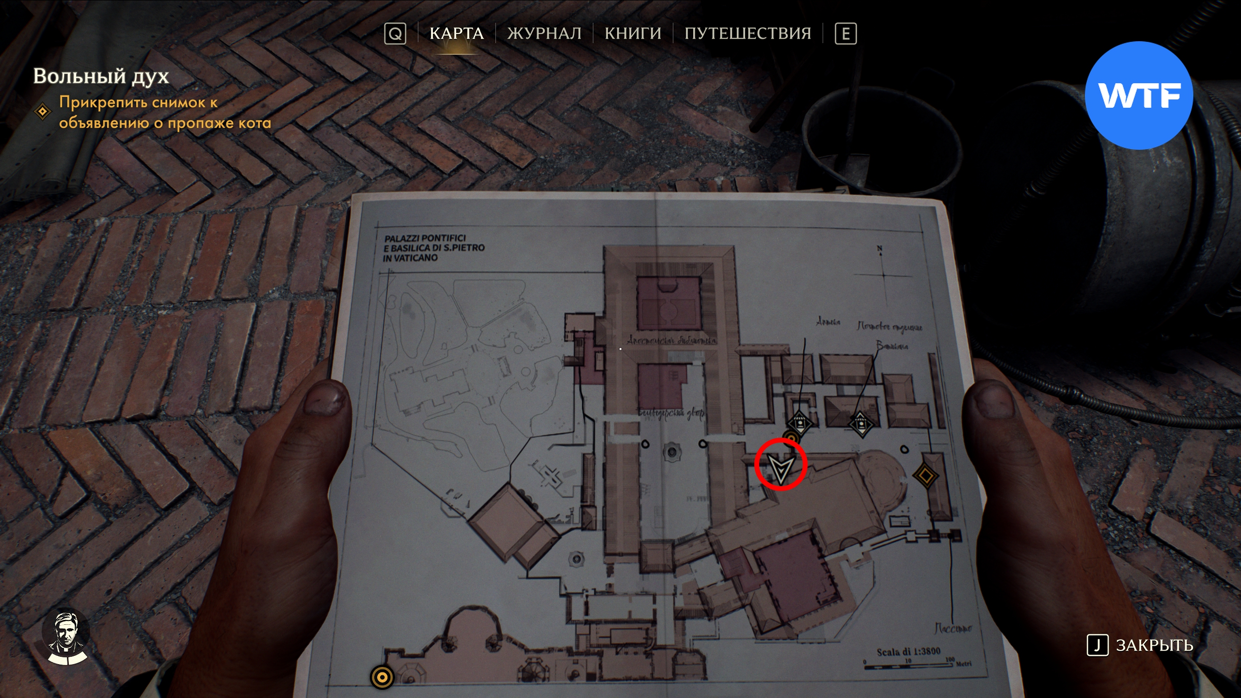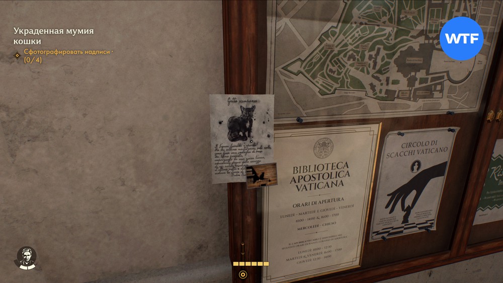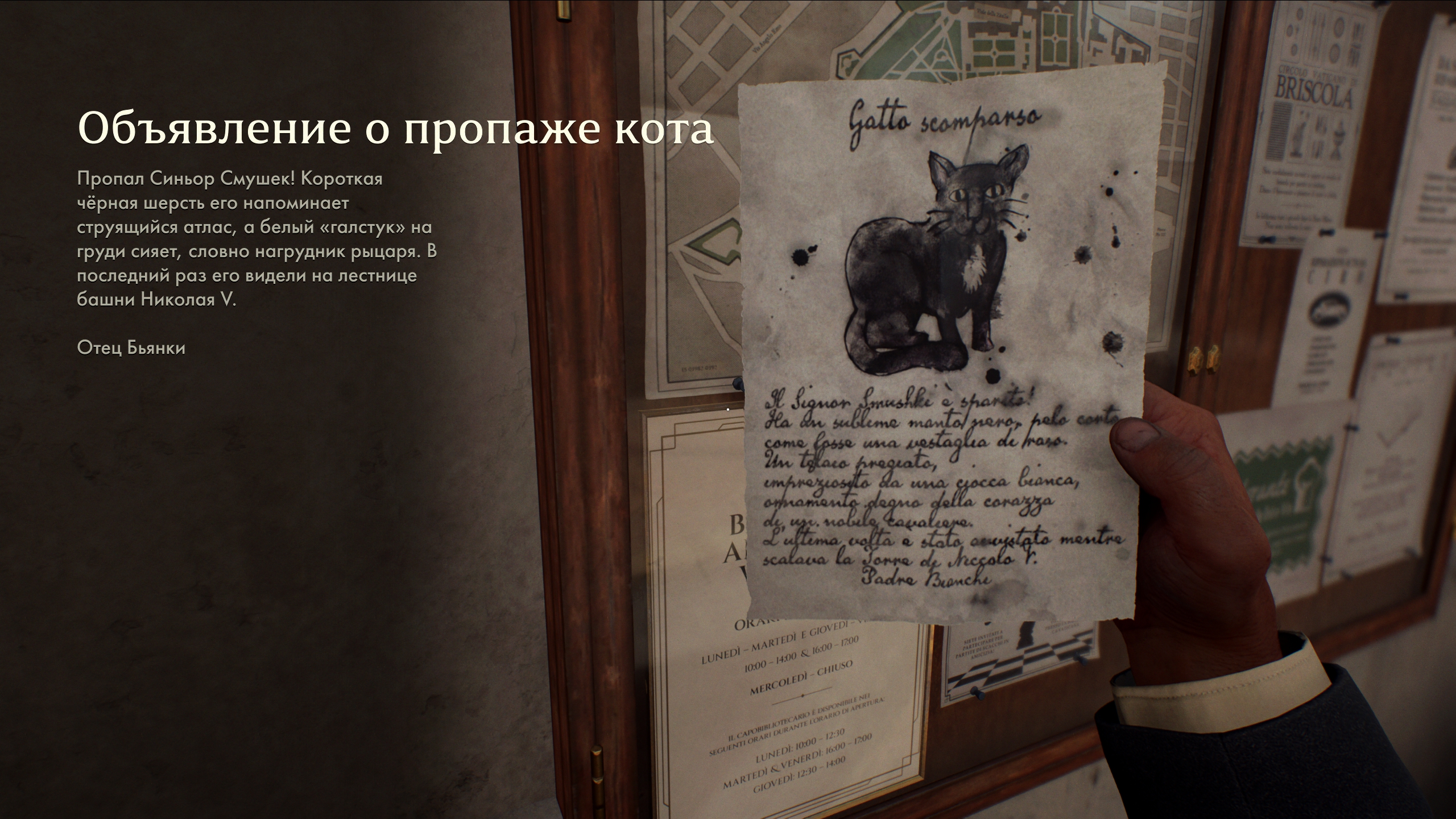 Из него вы узнаете, что кот отца Бьянки — Синьор Смушек — пропал. Вам нужно найти его, сделать фотографию и прикрепить её к объявлению. Обязательно запомните приметы питомца, так как котов в Ватикане предостаточно.