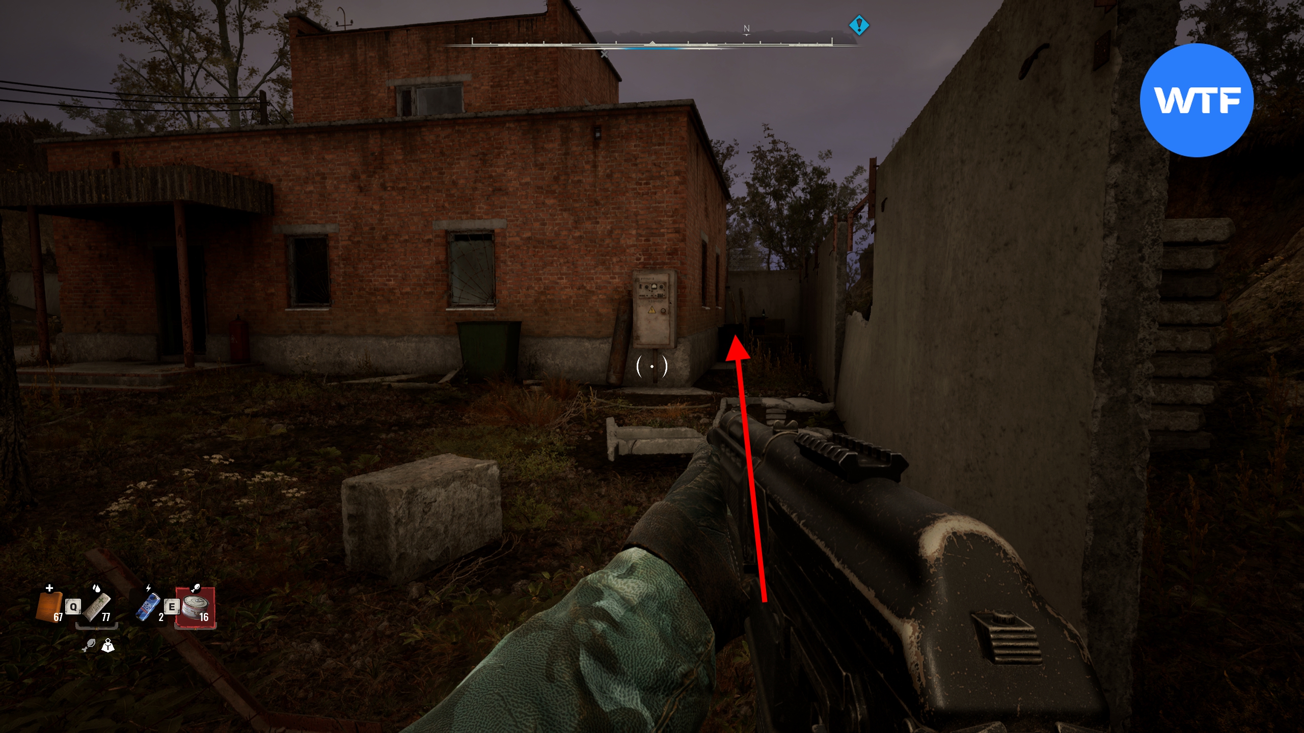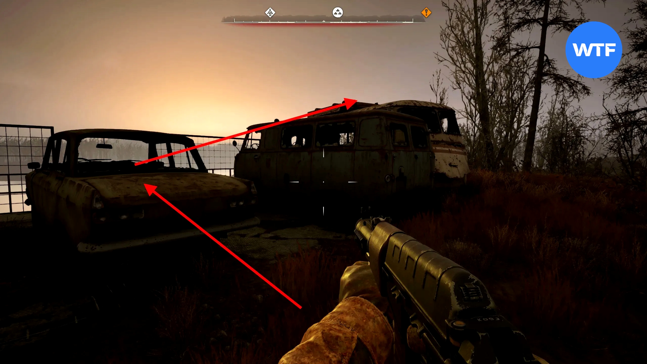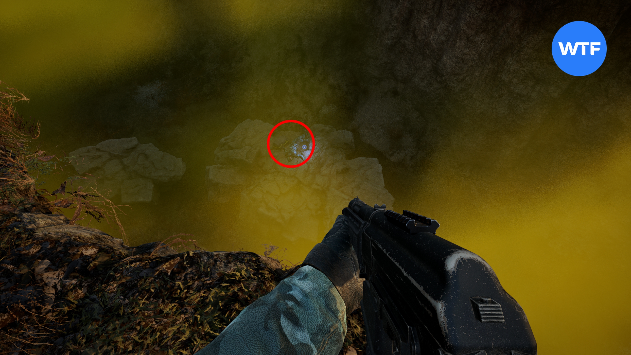Такой тайник есть в регионе Янтарь к юго-западу от одноименного завода. Вам нужно забраться на крышу автобуса и оттуда спуститься вниз к воде, используя аномалию с летающими камнями. Затем введите код 5578, чтобы открыть дверь и забрать штурмовую винтовку.