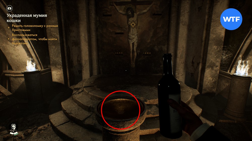 Спустившись в подземный мир под башней Николая V, очень скоро вы наткнетесь на головоломку с ранами Христовыми, блокирующую дальнейший путь. Чтобы приступить к её решению, в первую очередь налейте вина в чашу перед главной фреской.