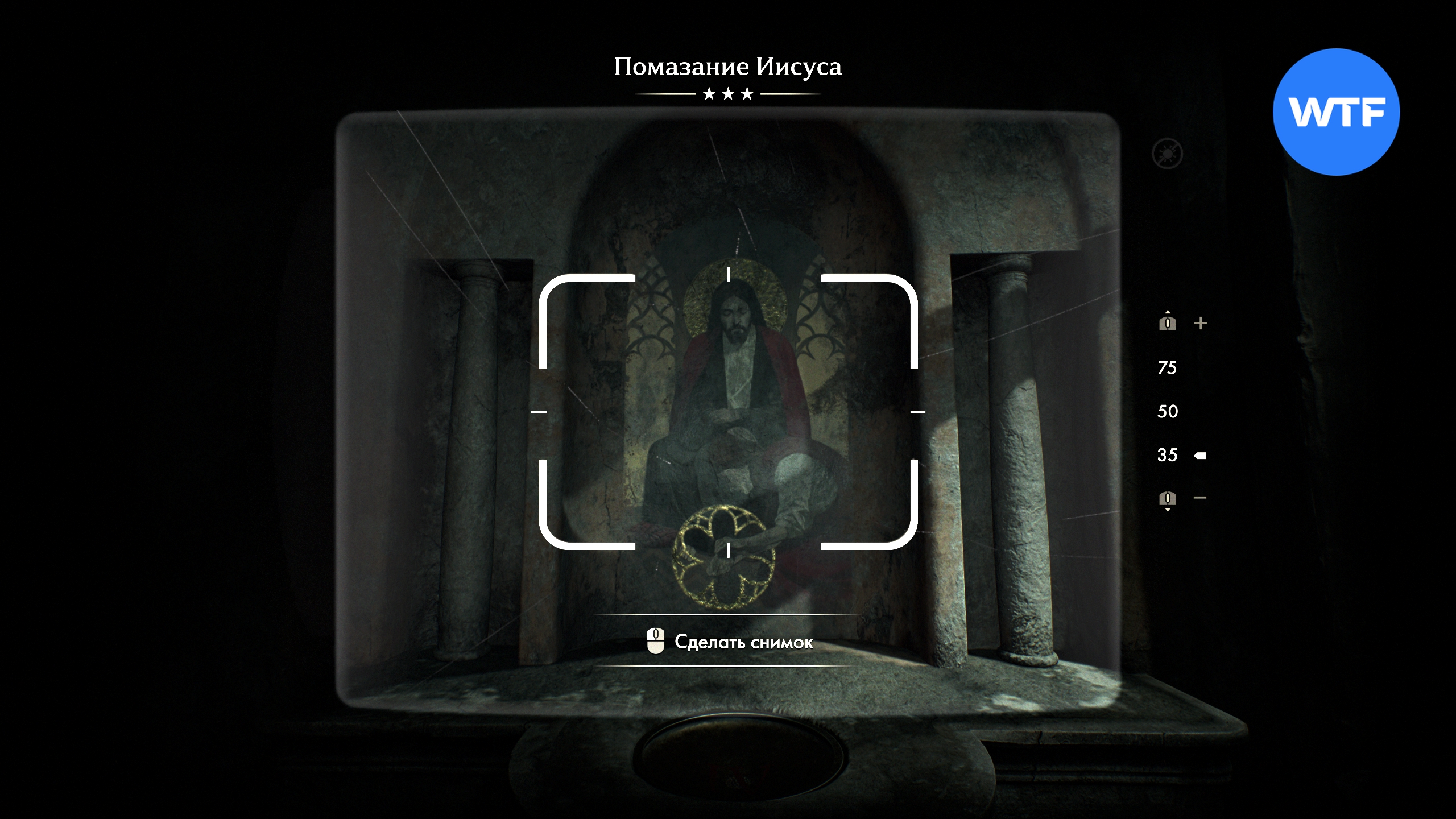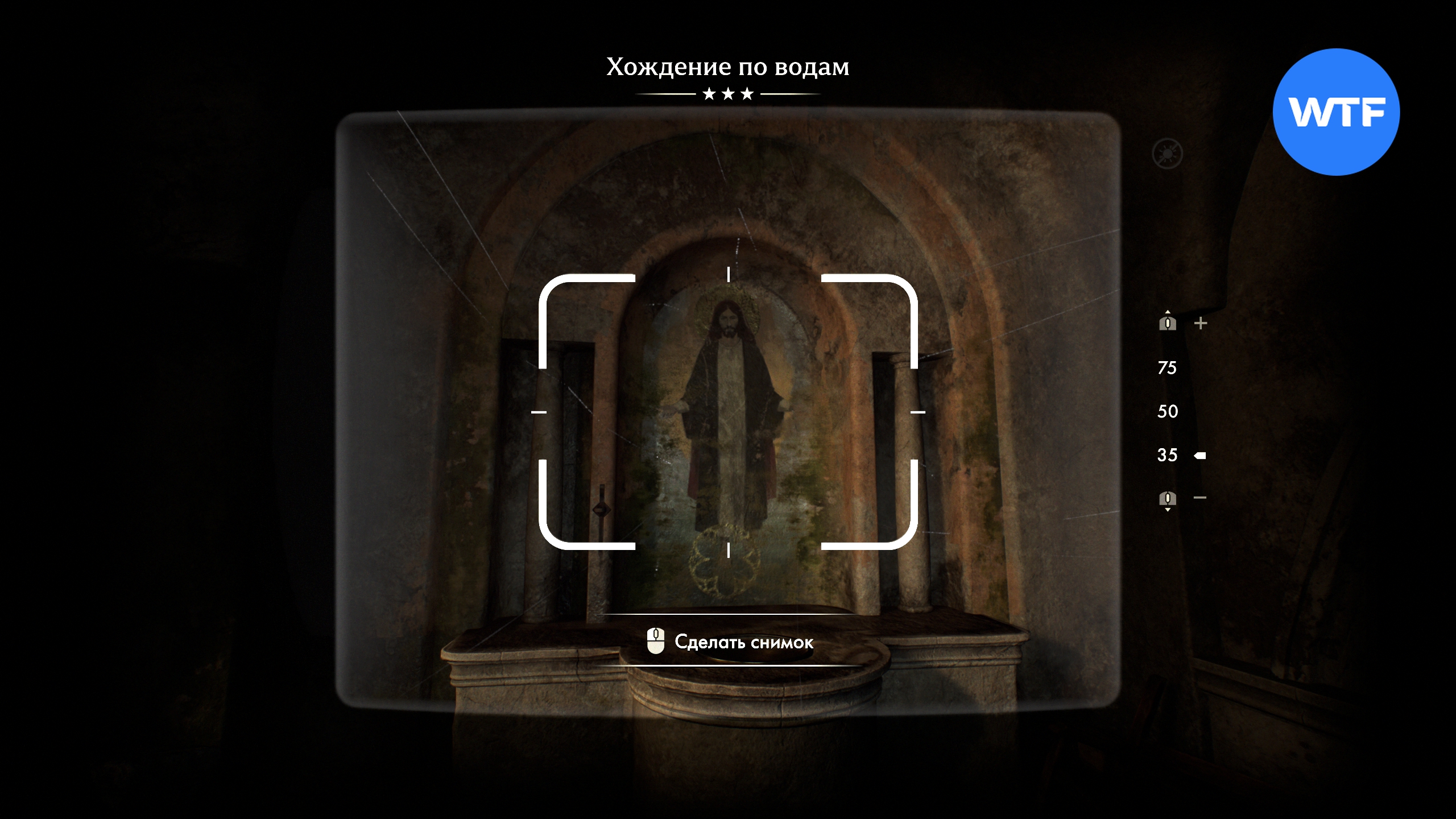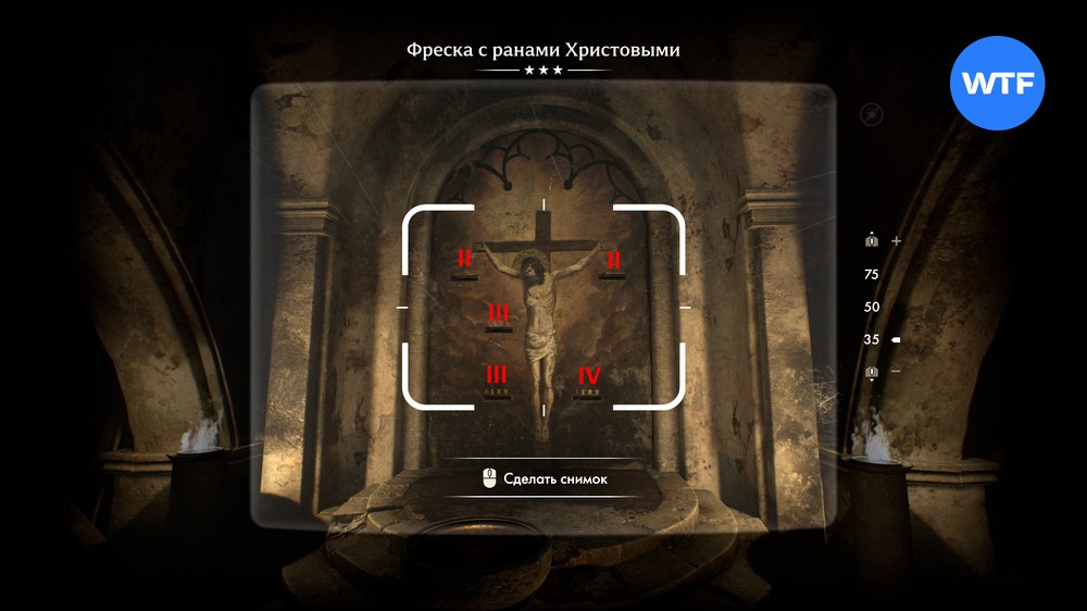 От фрески с ранами Христовыми идите направо и осмотрите фреску «Хождение по водам». Налейте вино в чашу перед ней, после чего там проступит римская цифра III. Обратите внимание, что на фреске правая нога обведена в золотой круг. Вернитесь к головоломке и передвиньте рычаг у правой ноги к цифре 3.