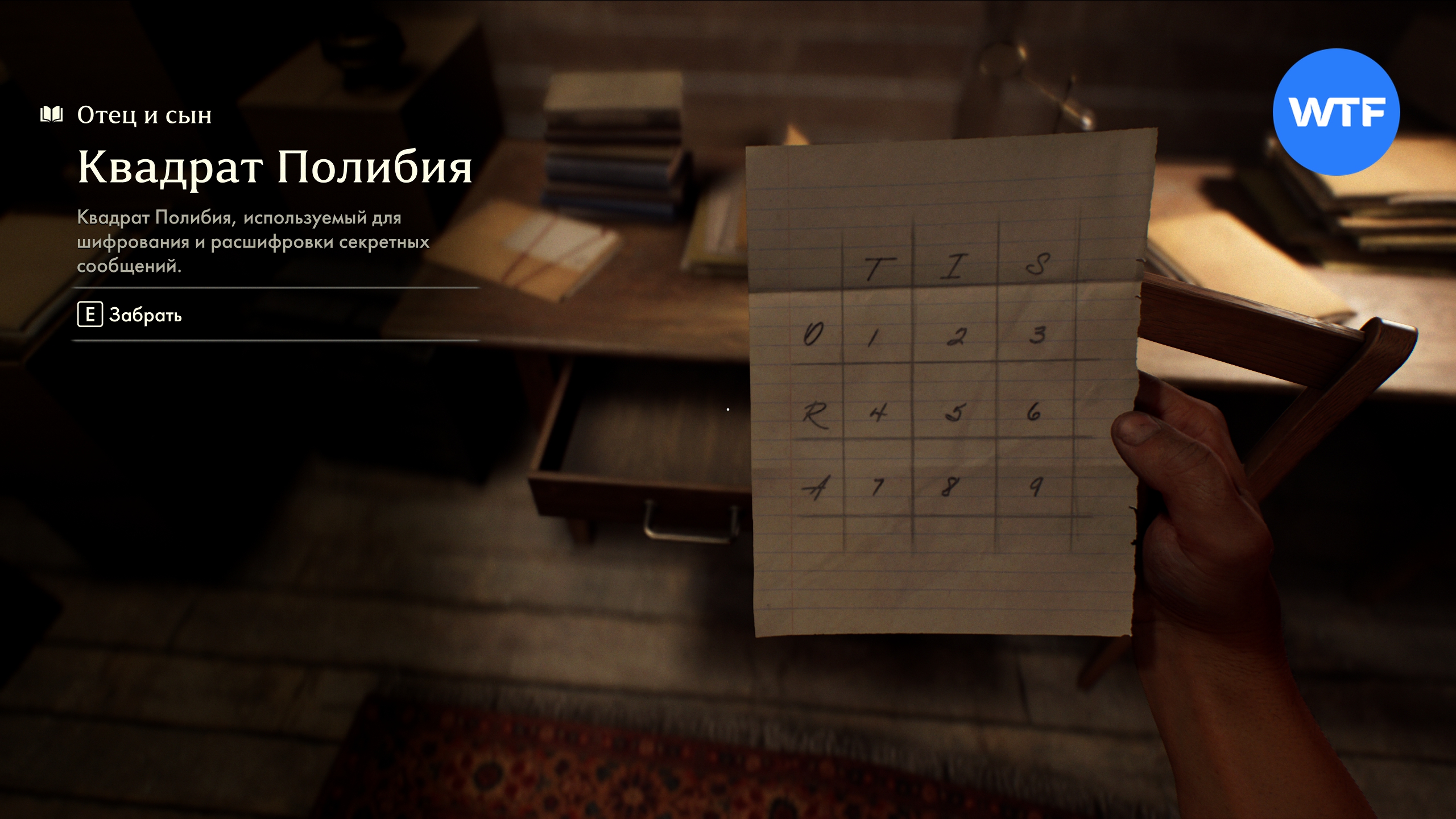Чтобы найти подсказки к коду от сейфа, загляните в ящики обоих столов, стоящих внутри кабинета. Вы найдете там итальянское стихотворение с обведенными буквами, а также Квадрат Полибия, который используется для расшифровки.