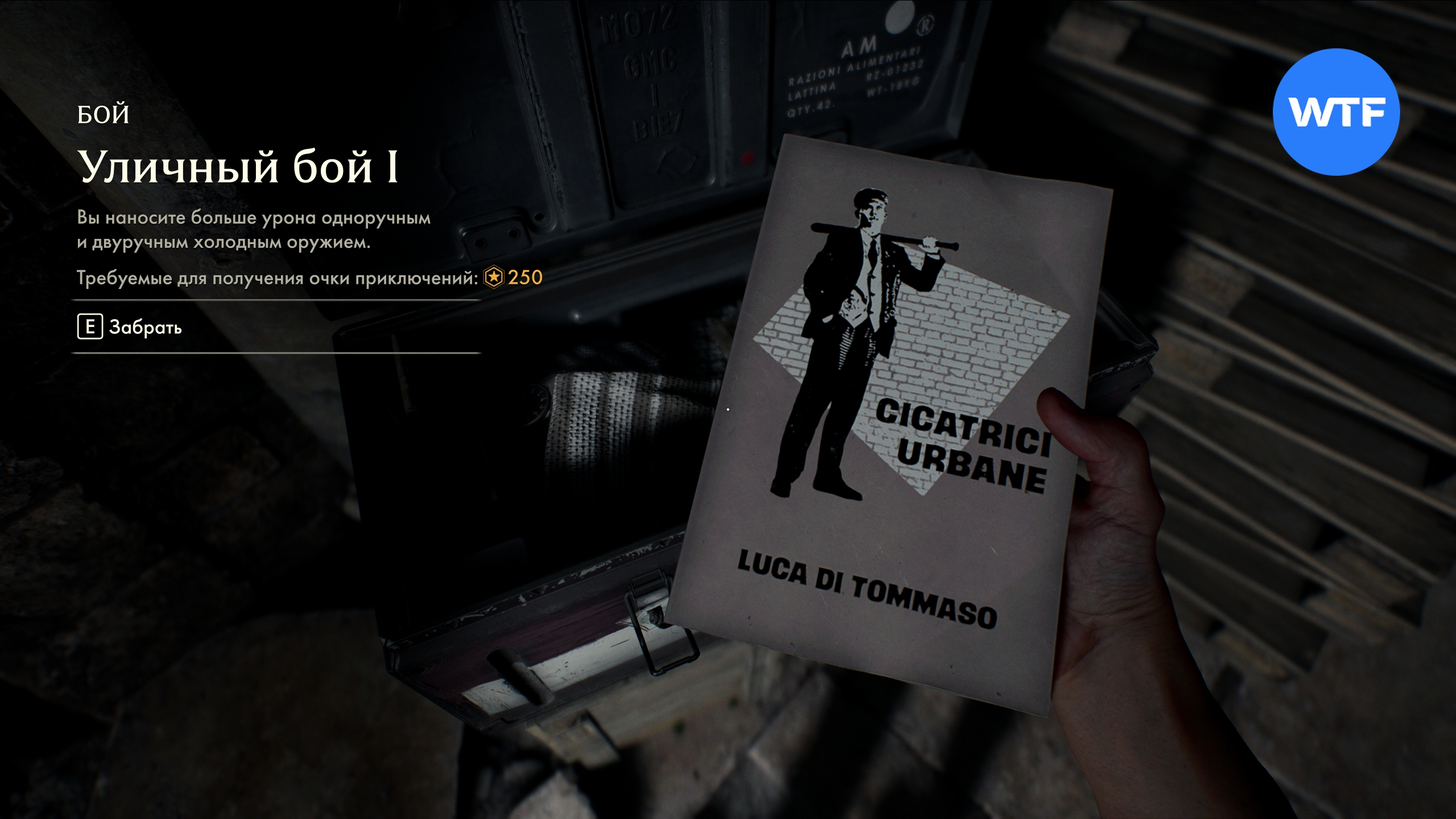 Внутри ящика лежит книга приключений Уличный бой I. При разблокировке этого навыка вы будете наносить больше урона одноручным и двуручным холодным оружием.