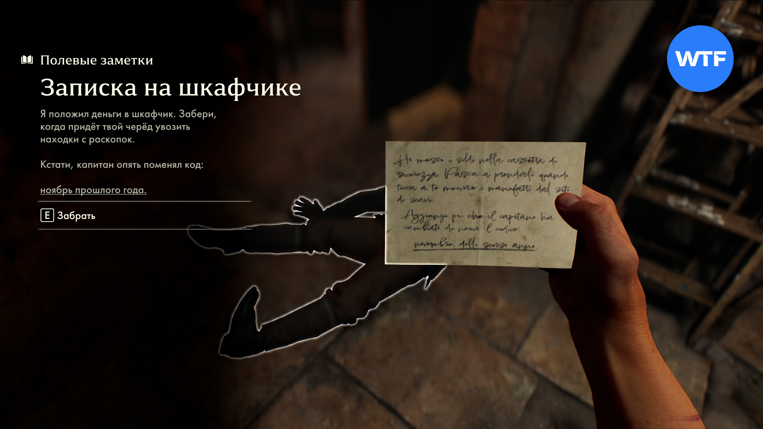Разберитесь с ним и подберите с его тела Записку на шкафчике, в которой указана подсказка к коду от ящика в подвале: