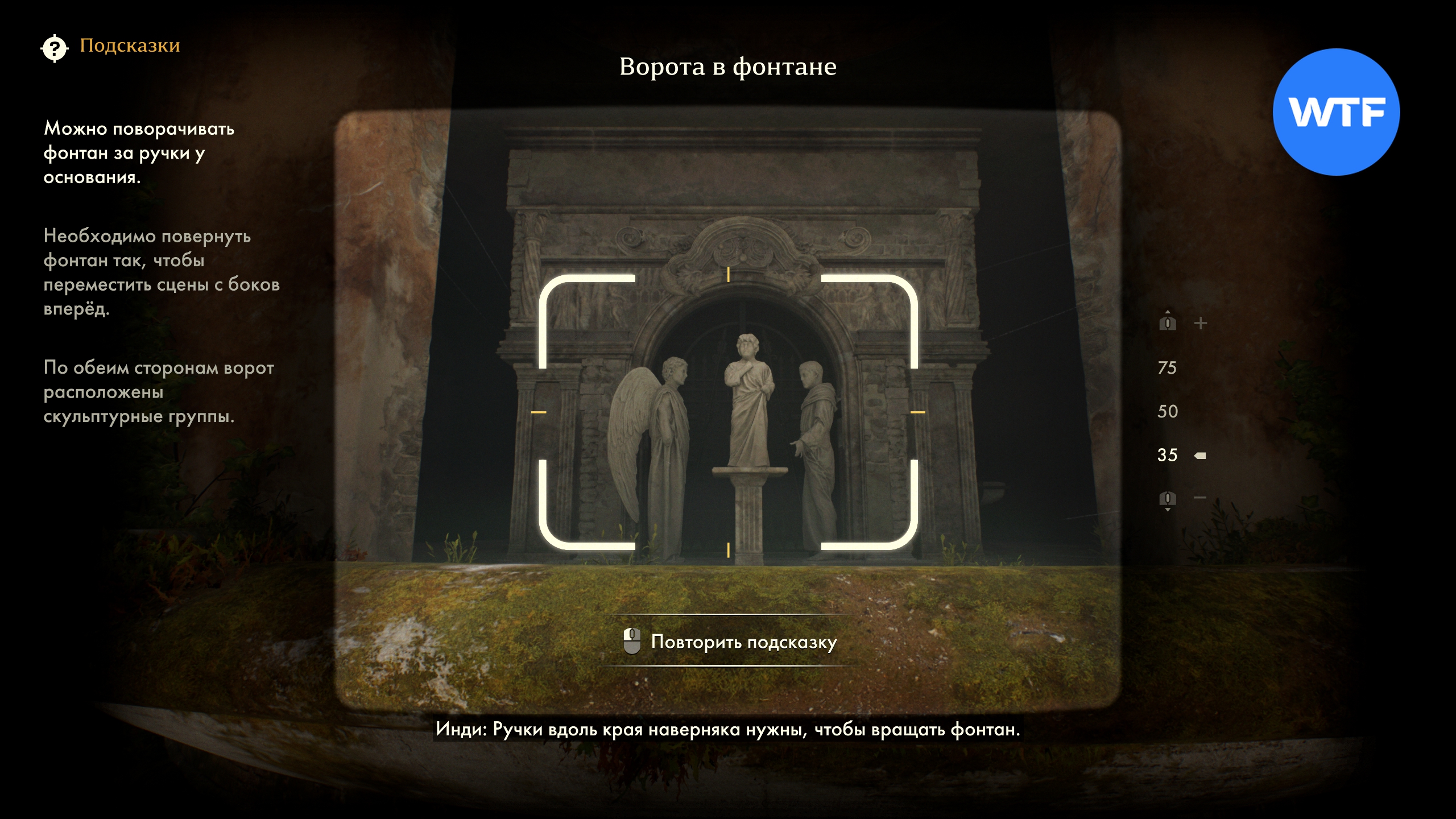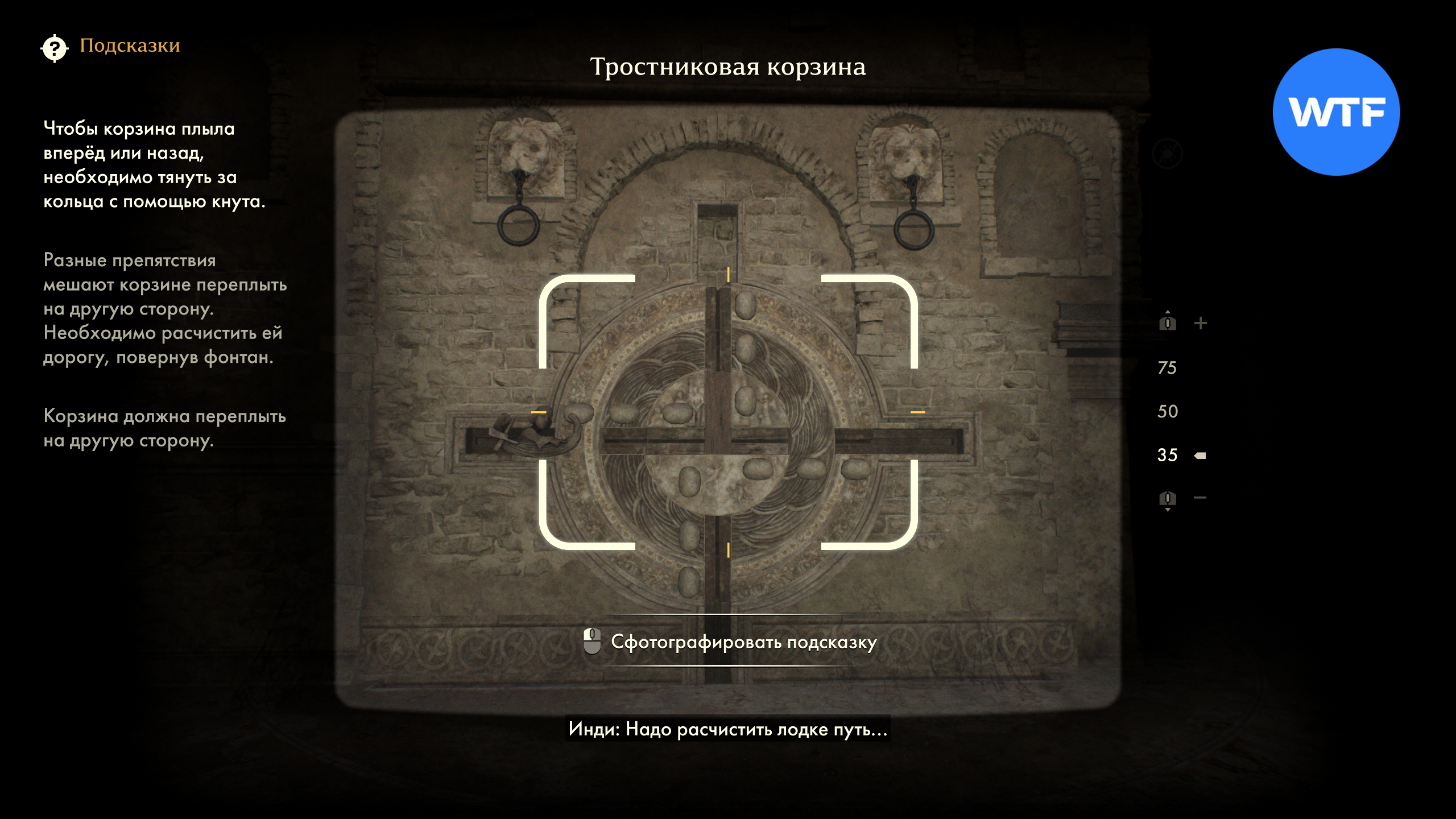 Чтобы решить головоломку с фонтаном, для начала нужно использовать фотоаппарат и поискать подсказки. Сделайте фото самого фонтана, а затем двух надписей по бокам. Инди зачитает вам перевод загадки, которая звучит следующим образом: